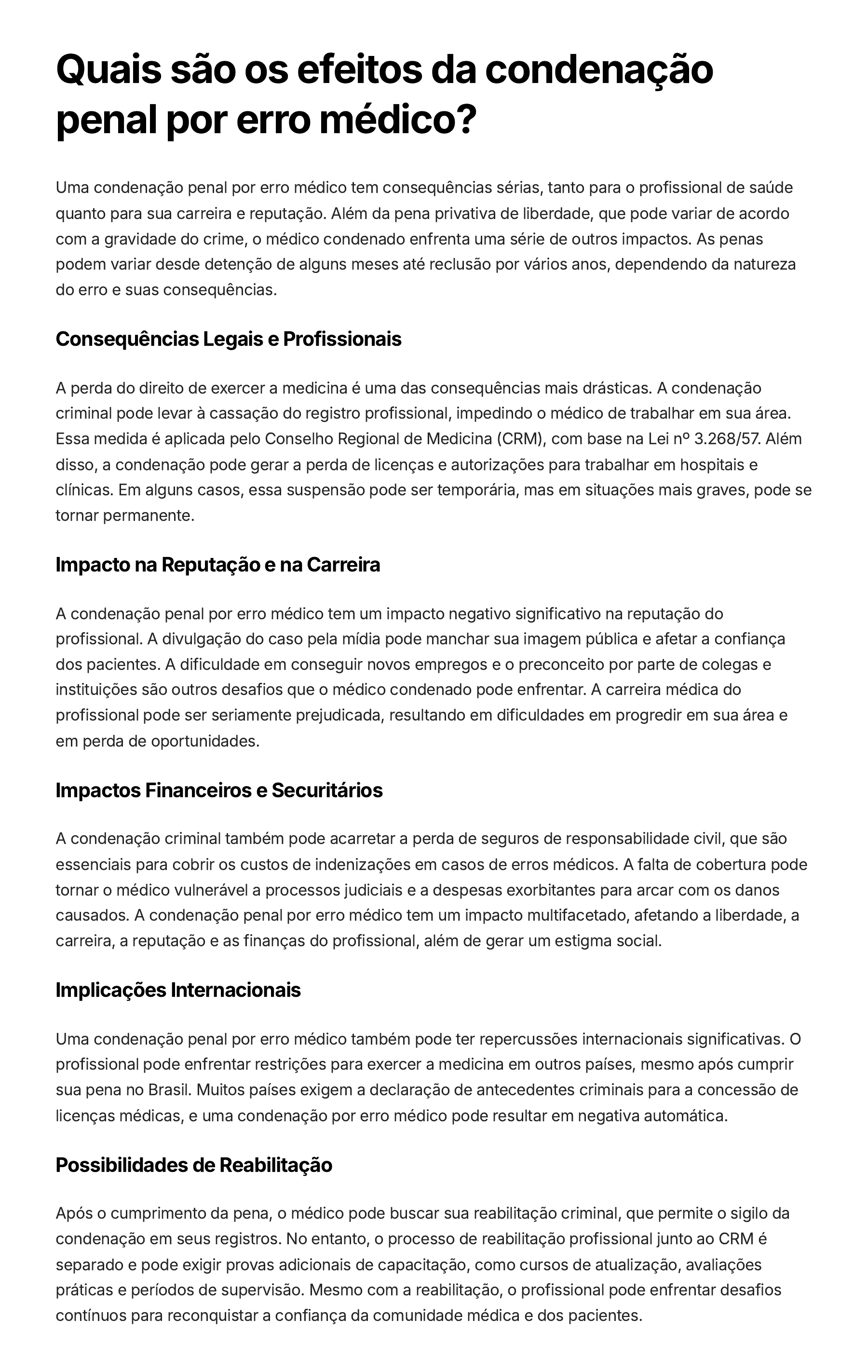 Quais são os efeitos da condenação penal por erro médico? Uma condenação penal por erro médico tem consequências sérias, tanto para o profissional de saúde quanto para sua carreira e reputação. Além da pena privativa de liberdade, que pode variar de acordo com a gravidade do crime, o médico condenado enfrenta uma série de outros impactos. As penas podem variar desde detenção de alguns meses até reclusão por vários anos, dependendo da natureza do erro e suas consequências. Consequências Legais e Profissionais A perda do direito de exercer a medicina é uma das consequências mais drásticas. A condenação criminal pode levar à cassação do registro profissional, impedindo o médico de trabalhar em sua área. Essa medida é aplicada pelo Conselho Regional de Medicina (CRM), com base na Lei nº 3.268/57. Além disso, a condenação pode gerar a perda de licenças e autorizações para trabalhar em hospitais e clínicas. Em alguns casos, essa suspensão pode ser temporária, mas em situações mais graves, pode se tornar permanente. Impacto na Reputação e na Carreira A condenação penal por erro médico tem um impacto negativo significativo na reputação do profissional. A divulgação do caso pela mídia pode manchar sua imagem pública e afetar a confiança dos pacientes. A dificuldade em conseguir novos empregos e o preconceito por parte de colegas e instituições são outros desafios que o médico condenado pode enfrentar. A carreira médica do profissional pode ser seriamente prejudicada, resultando em dificuldades em progredir em sua área e em perda de oportunidades. Impactos Financeiros e Securitários A condenação criminal também pode acarretar a perda de seguros de responsabilidade civil, que são essenciais para cobrir os custos de indenizações em casos de erros médicos. A falta de cobertura pode tornar o médico vulnerável a processos judiciais e a despesas exorbitantes para arcar com os danos causados. A condenação penal por erro médico tem um impacto multifacetado, afetando a liberdade, a carreira, a reputação e as finanças do profissional, além de gerar um estigma social. Implicações Internacionais Uma condenação penal por erro médico também pode ter repercussões internacionais significativas. O profissional pode enfrentar restrições para exercer a medicina em outros países, mesmo após cumprir sua pena no Brasil. Muitos países exigem a declaração de antecedentes criminais para a concessão de licenças médicas, e uma condenação por erro médico pode resultar em negativa automática. Possibilidades de Reabilitação Após o cumprimento da pena, o médico pode buscar sua reabilitação criminal, que permite o sigilo da condenação em seus registros. No entanto, o processo de reabilitação profissional junto ao CRM é separado e pode exigir provas adicionais de capacitação, como cursos de atualização, avaliações práticas e períodos de supervisão. Mesmo com a reabilitação, o profissional pode enfrentar desafios contínuos para reconquistar a confiança da comunidade médica e dos pacientes.
