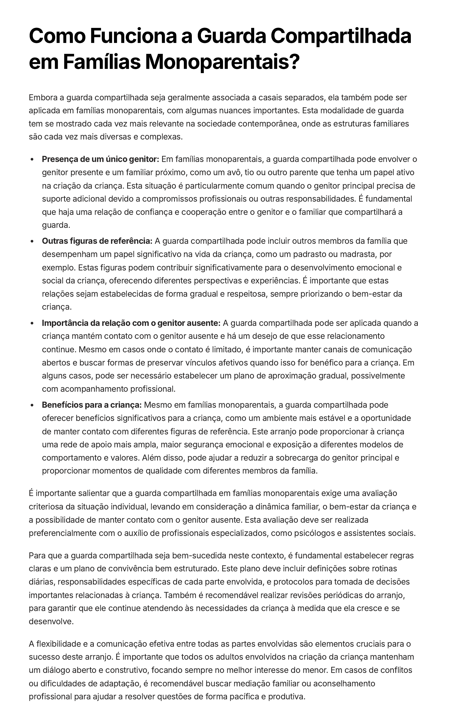 Presença de um único genitor: Em famílias monoparentais, a guarda compartilhada pode envolver o