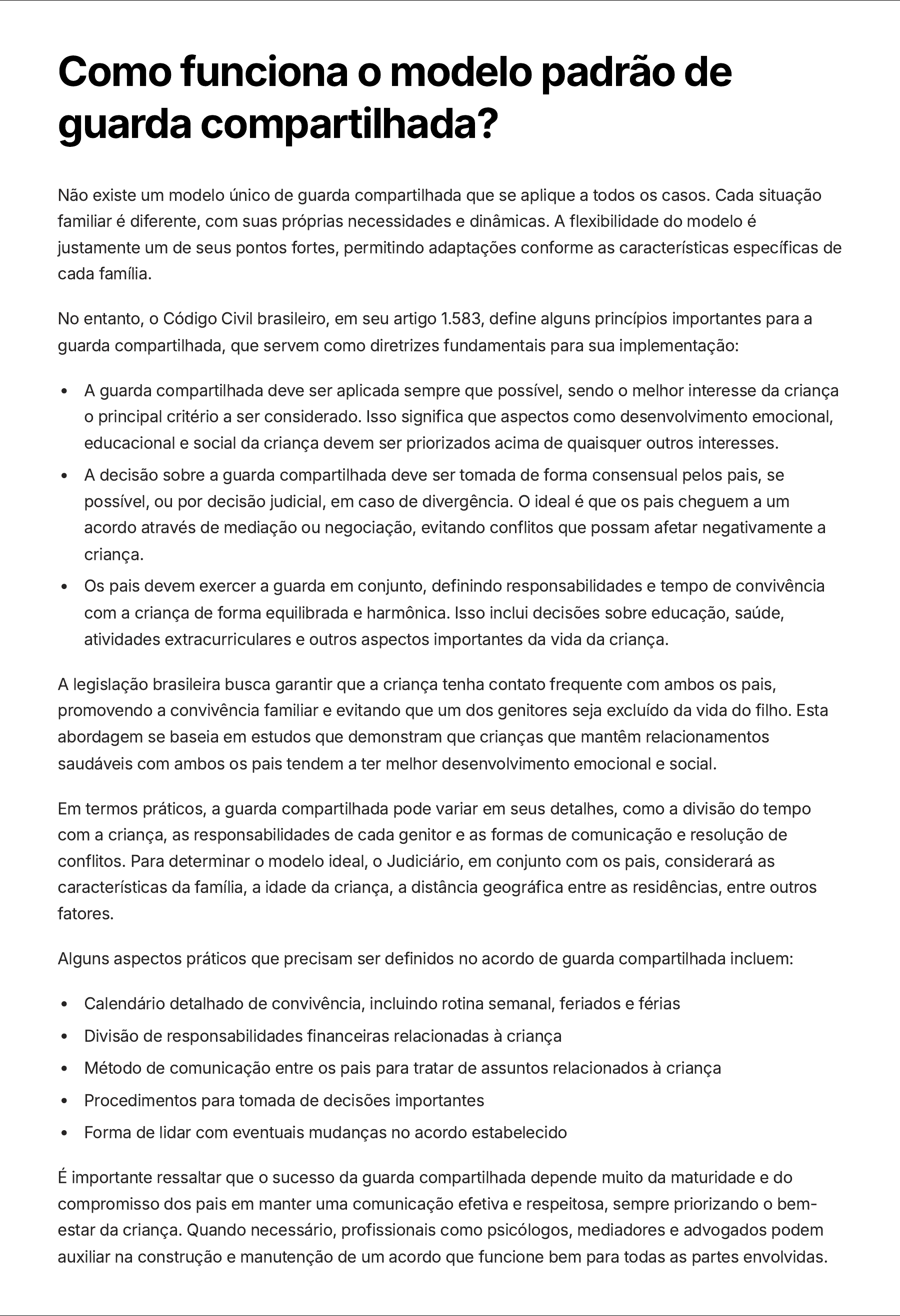 Como funciona o modelo padrão de guarda compartilhada? Não existe um modelo único de guarda compartilhada que se aplique a todos os casos. Cada situação familiar é diferente, com suas próprias necessidades e dinâmicas. A flexibilidade do modelo é justamente um de seus pontos fortes, permitindo adaptações conforme as características específicas de cada família. No entanto, o Código Civil brasileiro, em seu artigo 1.583, define alguns princípios importantes para a guarda compartilhada, que servem como diretrizes fundamentais para sua implementação: A guarda compartilhada deve ser aplicada sempre que possível, sendo o melhor interesse da criança o principal critério a ser considerado. Isso significa que aspectos como desenvolvimento emocional, educacional e social da criança devem ser priorizados acima de quaisquer outros interesses. A decisão sobre a guarda compartilhada deve ser tomada de forma consensual pelos pais, se possível, ou por decisão judicial, em caso de divergência. O ideal é que os pais cheguem a um acordo através de mediação ou negociação, evitando conflitos que possam afetar negativamente a criança. Os pais devem exercer a guarda em conjunto, definindo responsabilidades e tempo de convivência com a criança de forma equilibrada e harmônica. Isso inclui decisões sobre educação, saúde, atividades extracurriculares e outros aspectos importantes da vida da criança. A legislação brasileira busca garantir que a criança tenha contato frequente com ambos os pais, promovendo a convivência familiar e evitando que um dos genitores seja excluído da vida do filho. Esta abordagem se baseia em estudos que demonstram que crianças que mantêm relacionamentos saudáveis com ambos os pais tendem a ter melhor desenvolvimento emocional e social. Em termos práticos, a guarda compartilhada pode variar em seus detalhes, como a divisão do tempo com a criança, as responsabilidades de cada genitor e as formas de comunicação e resolução de conflitos. Para determinar o modelo ideal, o Judiciário, em conjunto com os pais, considerará as características da família, a idade da criança, a distância geográfica entre as residências, entre outros fatores. Alguns aspectos práticos que precisam ser definidos no acordo de guarda compartilhada incluem: Calendário detalhado de convivência, incluindo rotina semanal, feriados e férias Divisão de responsabilidades financeiras relacionadas à criança Método de comunicação entre os pais para tratar de assuntos relacionados à criança Procedimentos para tomada de decisões importantes Forma de lidar com eventuais mudanças no acordo estabelecido É importante ressaltar que o sucesso da guarda compartilhada depende muito da maturidade e do compromisso dos pais em manter uma comunicação efetiva e respeitosa, sempre priorizando o bem- estar da criança. Quando necessário, profissionais como psicólogos, mediadores e advogados podem auxiliar na construção e manutenção de um acordo que funcione bem para todas as partes envolvidas.