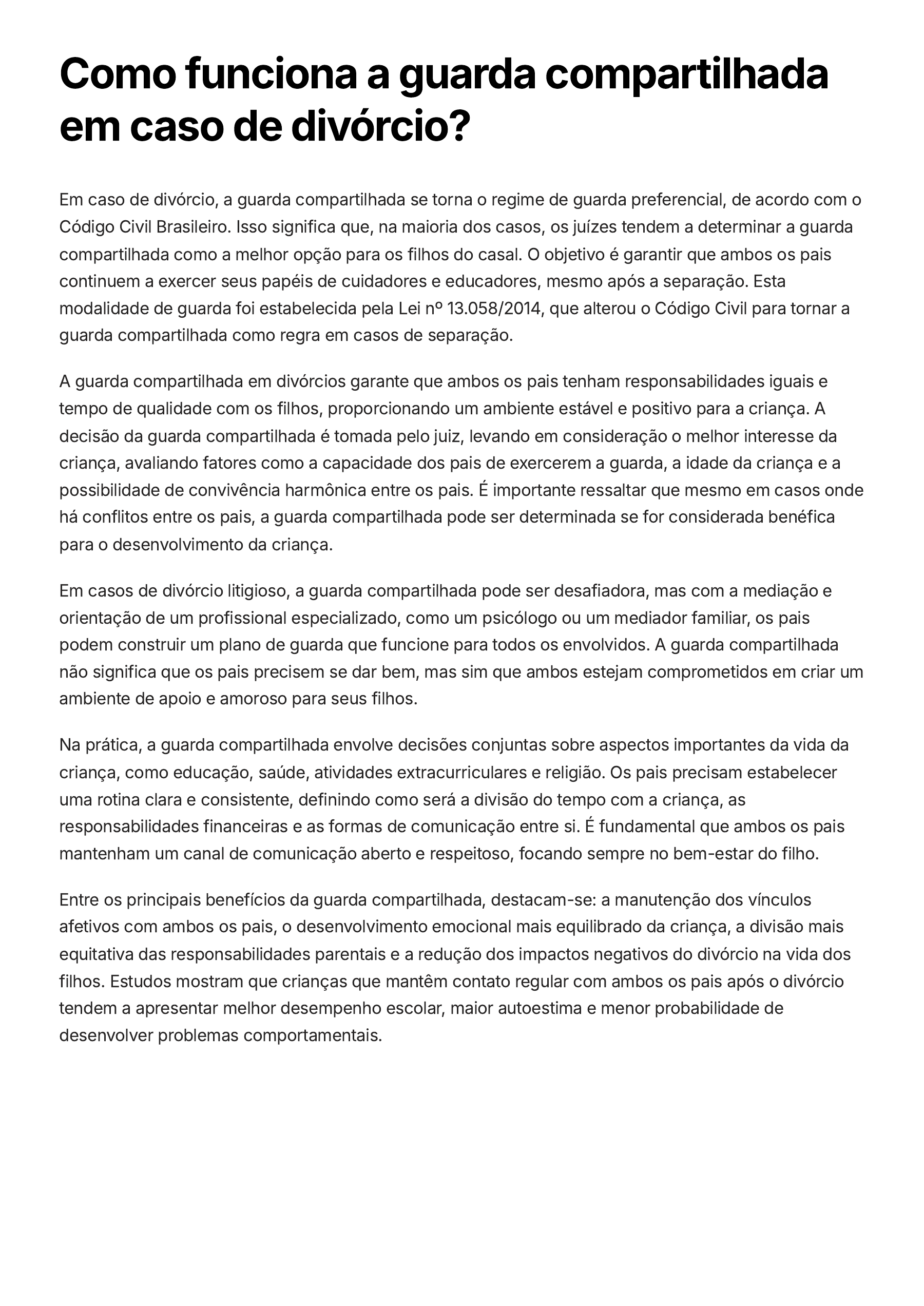 Como funciona a guarda compartilhada em caso de divórcio? Em caso de divórcio, a guarda compartilhada se torna o regime de guarda preferencial, de acordo com o Código Civil Brasileiro. Isso significa que, na maioria dos casos, os juízes tendem a determinar a guarda compartilhada como a melhor opção para os filhos do casal. O objetivo é garantir que ambos os pais continuem a exercer seus papéis de cuidadores e educadores, mesmo após a separação. Esta modalidade de guarda foi estabelecida pela Lei nº 13.058/2014, que alterou o Código Civil para tornar a guarda compartilhada como regra em casos de separação. A guarda compartilhada em divórcios garante que ambos os pais tenham responsabilidades iguais e tempo de qualidade com os filhos, proporcionando um ambiente estável e positivo para a criança. A decisão da guarda compartilhada é tomada pelo juiz, levando em consideração o melhor interesse da criança, avaliando fatores como a capacidade dos pais de exercerem a guarda, a idade da criança e a possibilidade de convivência harmônica entre os pais. É importante ressaltar que mesmo em casos onde há conflitos entre os pais, a guarda compartilhada pode ser determinada se for considerada benéfica para o desenvolvimento da criança. Em casos de divórcio litigioso, a guarda compartilhada pode ser desafiadora, mas com a mediação e orientação de um profissional especializado, como um psicólogo ou um mediador familiar, os pais podem construir um plano de guarda que funcione para todos os envolvidos. A guarda compartilhada não significa que os pais precisem se dar bem, mas sim que ambos estejam comprometidos em criar um ambiente de apoio e amoroso para seus filhos. Na prática, a guarda compartilhada envolve decisões conjuntas sobre aspectos importantes da vida da criança, como educação, saúde, atividades extracurriculares e religião. Os pais precisam estabelecer uma rotina clara e consistente, definindo como será a divisão do tempo com a criança, as responsabilidades financeiras e as formas de comunicação entre si. É fundamental que ambos os pais mantenham um canal de comunicação aberto e respeitoso, focando sempre no bem-estar do filho. Entre os principais benefícios da guarda compartilhada, destacam-se: a manutenção dos vínculos afetivos com ambos os pais, o desenvolvimento emocional mais equilibrado da criança, a divisão mais equitativa das responsabilidades parentais e a redução dos impactos negativos do divórcio na vida dos filhos. Estudos mostram que crianças que mantêm contato regular com ambos os pais após o divórcio tendem a apresentar melhor desempenho escolar, maior autoestima e menor probabilidade de desenvolver problemas comportamentais.