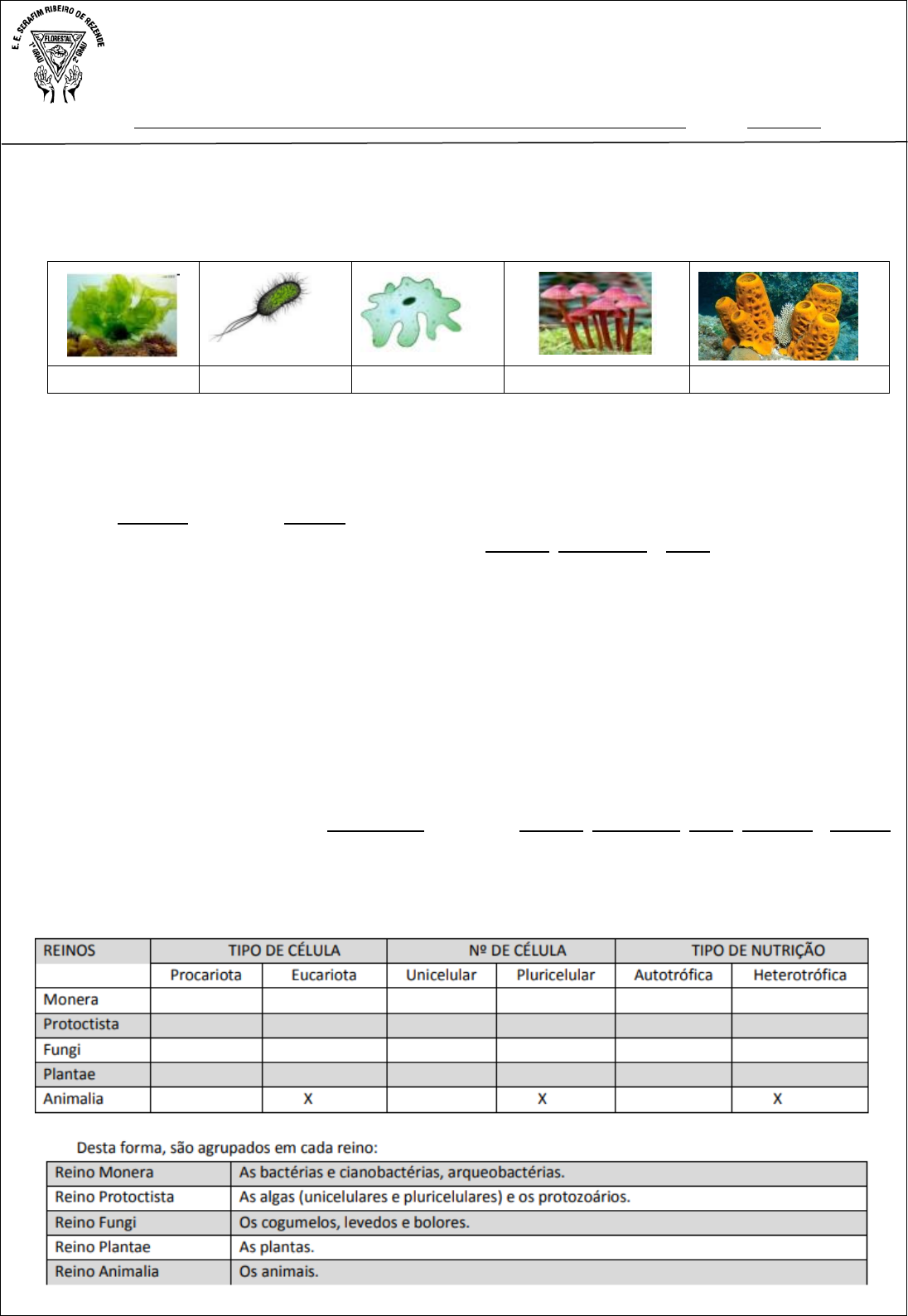Escola Estadual Serafim Ribeiro de Rezende Rua Benedito Valadares, 689 - Florestal - Minas Gerais. Avaliação Bimestral de Ciências Turma: ____ Data: ___/___/___ Valor: _____ NOME: TURMA: Leia o texto com atenção. Com frequência ouvimos de crianças pequenas, que já estão aprendendo a classificar o mundo, a seguinte pergunta: “Olhe! É bicho ou é planta?”. Agora, observe atentamente os organismos a seguir. Alga Bactéria Ameba Cogumelo de chapéu Esponja-do-mar Como você responderia a uma criança que, olhando para as mesmas imagens, lhe fizesse o mesmo questionamento? Percebe-se que animal e planta são respostas insuficientes para rotular todos os organismos que existem em nosso mundo. Animal (Animalia) e Planta (Plantae) são dois grandes reinos que agrupam os animais e os vegetais, respectivamente. Mas existem outros três grandes reinos: Monera, Protoctista e Fungi. Desta maneira, para você responder corretamente a pergunta inicial deverá dizer que a alga e a ameba são Protoctistas; a bactéria é Monera; o cogumelo é Fungi ou Fungo e, por fim, a esponja-do-mar é um Animal. A taxonomia é o ramo da Biologia que organiza e classifica os seres vivos. Como existem milhões de seres vivos em nosso planeta, esta classificação é de extrema importância para a pesquisa científica. Com essas informações, por exemplo, podemos estudar as relações de parentescos entre os organismos e suas histórias evolutivas. Para agrupar os seres vivos em reinos são usados critérios de classificação, que são: o tipo de célula (procariota ou eucariota), se o organismo é capaz ou não de fabricar o próprio alimento (autotrófico ou heterotrófico) e a quantidade de célula (unicelular ou pluricelular). De acordo com esses critérios determinado organismo será classificado em um dos cinco reinos existentes: Monera, Protoctista, Fungi, Animalia e Plantae. 1- Complete o quadro a seguir assinalando a característica de cada reino. Observe que a linha correspondente ao reino Animalia já foi preenchida como exemplo. Trata-se de um reino que agrupa organismos eucariontes, pluricelulares e heterotróficos. Diante de toda a biodiversidade encontrada em nosso planeta, os cinco reinos não são o suficiente para organizarmos os seres vivos de nosso planeta, de modo a tornar os estudos científicos mais eficientes. Isso porque dentro de um mesmo reino ainda são agrupados organismos muito diferentes, como por exemplo, as esponja-do-mar e nós, seres humanos, pertencemos ao reino Animal. Para suprir a necessidade de organizar a biodiversidade, existem outras categorias taxonômicas. Como visto anteriormente, o reino é uma categoria, mas não é a única. Em ordem temos as seguintes categorias taxonômicas: Reino, Filo, Classe, Ordem, Família, Gênero e Espécie. Enquanto o reino é a categoria taxonômica que agrupa uma diversidade grande de seres vivos, a espécie biológica é uma categoria taxonômica que se refere apenas a um grupo de indivíduos geneticamente semelhantes, que podem se reproduzir em condições naturais, gerando filhotes férteis, ou seja, que também serão capazes de reproduzirem quando adultos. Por exemplo, humanos, lobos, coiotes, leões pertencem ao reino Animal. Mas a espécie Homo sapiens se refere apenas a nossa espécie. Observe que existe uma forma científica para escrever nome de espécie. O nome científico da espécie humana é Homo sapiens. Cada espécie receberá seu nome científico: Canis latrans, Canis lupus e Canis aureus. Eles são os nomes científicos usados para o coiote, lobo cinzento e chacal- dourado, respectivamente. Enquanto o nome comum é escrito na língua nativa do país, os nomes científicos são escritos em latim ou latinizados. Desta forma, independentemente do país que você esteja, o lobo cinzento é chamado, cientificamente, de Canis lupus. Por isso, os nomes científicos são considerados universais. E há uma regra para escrevê-los de modo que quem esteja lendo um texto científico saiba que aquele nome se refere a uma espécie biológica. É importante seguir as normas de nomenclatura ao escrever nomes científicos para evitar confusões. Regras de nomenclatura (estabelecidas por Lineu) são as seguintes: 1º) O nome científico é binominal (formado por duas palavras); 2º) A primeira palavra indica a categoria taxonômica gênero e é escrita com inicial maiúscula; 3º) A segunda palavra é o termo específico da espécie e é escrita com inicial minúscula; 4º) A espécie é identificada pelas duas palavras juntas (gênero + termo específico) 5º) O nome científico deve ser destacado do texto utilizando-se uma das duas formas abaixo: a) Em itálico (Homo sapiens) b) Sublinhado .................. (Homo sapiens) Responda: 2- Quais são os cinco Reinos citados no texto? 3- Quais são os critérios usados para classificar os seres vivos? 4- Segundo o texto qual a importância de existir uma classificação científica dos organismos? 5- Segundo o texto qual o conceito biológico de espécie? 6- Considere o conceito biológico de espécie. Qual das observações a seguir nos permite afirmar que as duas variedades de mariposas são da mesma espécie? a) Vivem em ambientes semelhantes. b) Apresentam hábitos alimentares semelhantes. c) Desempenham o mesmo papel ecológico em seus respectivos ambientes. d) O cruzamento entre indivíduos dessas populações gerou descendentes férteis. 7 - Relacione corretamente as duas colunas abaixo. I. Animais II. Vegetais III. Protistas IV. Fungos V. Bactérias VI. Vírus ( ) compreendem os protozoários e as algas. ( ) São parasitas intracelulares ( ) compreende as bactérias e as cianobactérias (algas azuis ou cianofíceas). ( ) cogumelos, mofos, orelhas de pau, líquens são exemplos desse reino. ( ) é formado por organismos autótrofos (produzem seu próprio alimento) e clorofilados. ( ) são seres que apresentam capacidade de locomoção e grande parte gera descendentes por re