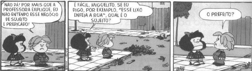 <p>ATIVIDADES DE ANÁLISE SINTÁTICA – GRAMÁTICA – SUJEITO E PREDICADO – 7º ANO</p><p>Identifique os termos das orações abaixo.</p><p>1. Minha colega é muito curiosa.</p><p>A) Sujeito: ________________________________________________________________</p><p>B) Predicado: ____________________________________________________________</p><p>C) Núcleo do sujeito: ______________________________________________________</p><p>D) Tipo de sujeito: _________________________________________________________</p><p>2. Os alunos do 7º ano estão estudando os tipos de sujeito.</p><p>A) Sujeito: ________________________________________________________________</p><p>B) Predicado: ____________________________________________________________</p><p>C) Núcleo do sujeito: ______________________________________________________</p><p>D) Tipo de sujeito: _________________________________________________________</p><p>3. Nina e Flóris são melhores amigos.</p><p>A) Sujeito: ________________________________________________________________</p><p>B) Predicado: ____________________________________________________________</p><p>C) Núcleo do sujeito: ______________________________________________________</p><p>D) Tipo de sujeito: _________________________________________________________</p><p>4. Lemos uma HQ na aula passada.</p><p>A) Sujeito: ________________________________________________________________</p><p>B) Predicado: _____________________________________________________________</p><p>C) Núcleo do sujeito: _______________________________________________________</p><p>D) Tipo de sujeito: _________________________________________________________</p><p>I. Leia a tira a seguir.</p><p>5. O que Mafalda e Miguelito estão fazendo? Onde eles estão?</p><p>___________________________________________________________________________________________</p><p>6. Mafalda faz uma pergunta a Miguelito. A expressão dela no 3º quadrinho indica que não ficou satisfeita</p><p>com a resposta do menino. Explique por quê.</p><p>_______________________________________________________________________________________</p><p>_______________________________________________________________________________________</p><p>7. De acordo com a gramática, qual seria o sujeito da oração “Esse lixo enfeia a rua”? E o predicado?</p><p>Sujeito: ______________________________________________________________________________</p><p>Predicado: ____________________________________________________________________________</p><p>8. Qual é o núcleo do sujeito da oração acima? _____________________________________</p><p>9. E o tipo de sujeito?</p><p>( ) Sujeito simples ( ) Sujeito composto ( ) Sujeito oculto ou desinencial</p><p>10. Na oração “Miguelito e Mafalda são amigos”, qual é o sujeito da oração?</p><p>____________________________________________________________</p><p>11. E o predicado? _______________________________________________________</p><p>12. Qual é o tipo de sujeito da oração “Miguelito e Mafalda são amigos”?</p><p>( ) Sujeito simples ( ) Sujeito composto ( ) Sujeito oculto ou desinencial</p><p>13. Na oração “Eu não entendo esse negócio de sujeito e predicado”, qual é o sujeito da oração? E o predicado?</p><p>Sujeito = ____________________________________________________________________________</p><p>Predicado = __________________________________________________________________________</p><p>14. De acordo com a gramática, qual seria o sujeito da oração “Tenho muitos amigos”? E o predicado?</p><p>Sujeito = _________________________________________________________________________</p><p>Predicado = _______________________________________________________________________</p><p>15. Qual é o núcleo do sujeito da oração “Tenho muitos amigos”? __________________________</p><p>16. E o tipo de sujeito?</p><p>( ) Sujeito simples ( ) Sujeito composto ( ) Sujeito oculto ou desinencial</p><p>17. Leia os enunciados abaixo. Acrescente as vírgulas que foram retiradas.</p><p>A) Oi amor de mãe!</p><p>B) Fui eu mãe!</p><p>C) Está bem mãe!</p><p>D) Parabéns Maria!</p><p>E) Maria de Lourdes você conhece esse rapaz?</p><p>F) Oi tudo bem?</p><p>G) Está bem me desculpe!</p><p>H) Entendeu né?</p><p>I) Filha venha aqui!</p><p>J) Uma criança meu Deus!</p><p>18. Crie três orações: uma com sujeito simples, uma com sujeito composto e a outra com sujeito oculto.</p><p>As orações criadas não podem ser copiadas dos exercícios anteriores. Sejam criativos!</p><p>1________________________________________________________________________</p><p>2_________________________________________________________________________</p><p>3_________________________________________________________________________</p>