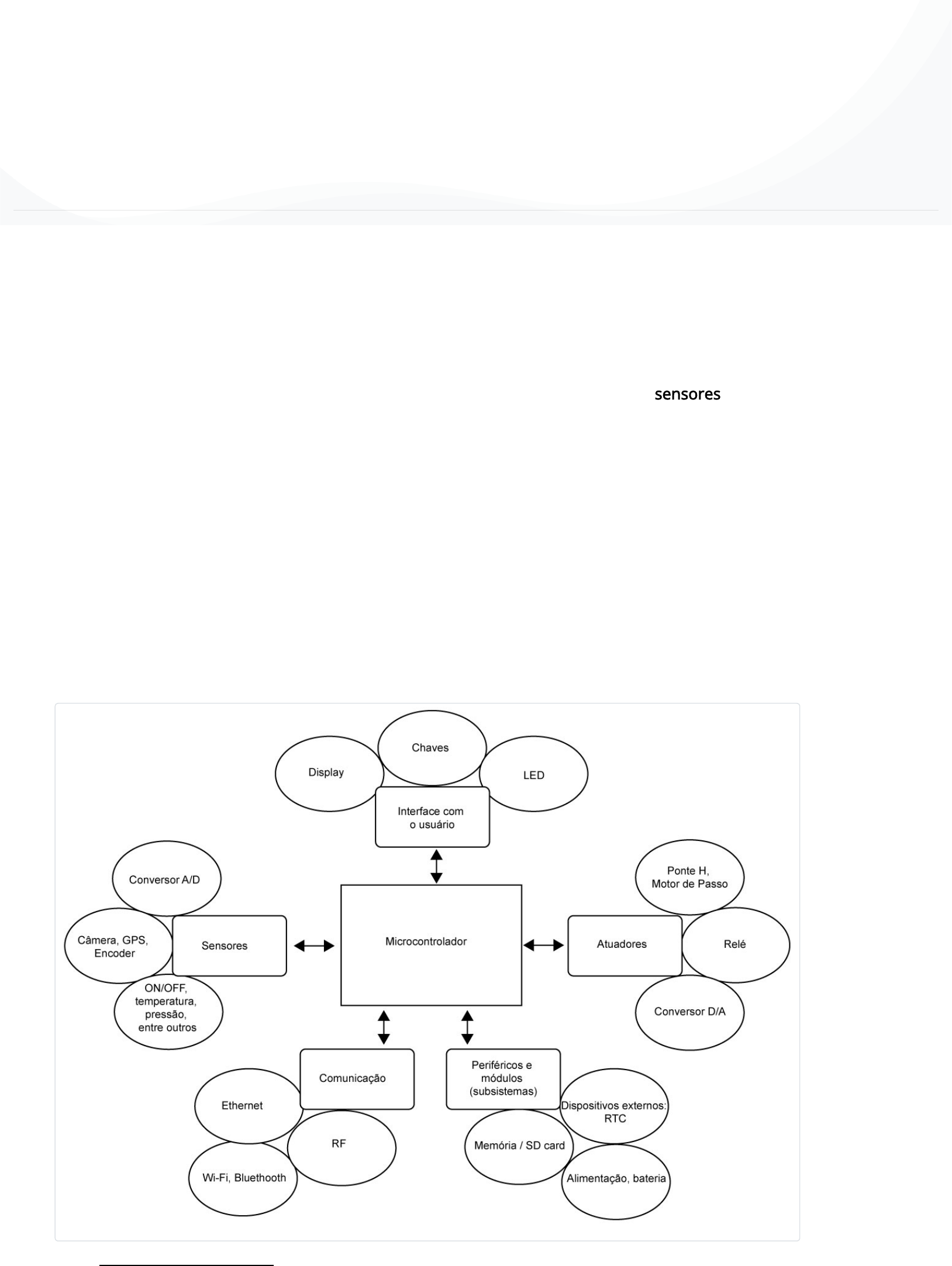 Nessa webaula será apresentado informações sobre sensores e atuadores. Os sensores permitem aos sistemas embarcados sentir e se equilibrar. Por sua vez, os atuadores é um mecanismo capaz de atuar no meio externo. Sensor e atuador Em se tratando de Internet das Coisas, a fronteira com o meio-ambiente está nos sensores, para captar diversos tipos de sinais pela tradução de grandezas físicas diversas (temperatura, luminosidade, umidade etc.) em uma intensidade elétrica proporcional. E a forma de o dispositivo reagir está nos atuadores, que fazem o outro lado do caminho, traduzindo sinais elétricos em alguma ação física no meio externo, seja movimentando um motor ou acionando uma chave, contato ou mesmo piscando um simples LED (THOMAZINI; ALBUQUERQUE, 2011). Entre o sensor e o atuador, temos o microcontrolador, como o Arduino, que atua como cérebro do sistema, processando os sinais lidos dos sensores e controlando os atuadores com base em suas instruções de programa. Vamos pensar em como seria um sistema embarcado qualquer de uma forma mais generalista, possuindo sensores para entrada de dados, atuadores para agir no meio-ambiente, além de interfaces com outros periféricos que permitem ao mesmo ter comunicação com outros dispositivos, armazenar dados, alimentação elétrica, além de interagir com o usuário, como mostrado no diagrama. Diagrama geral de componentes presentes em um sistema embarcado com microcontrolador Fonte: encurtador.com.br/sAM18. Acesso em: 22 set. 2019. Internet das Coisas Redes de sensores Você sabia que seu material didático é interativo e multimídia? Isso signi�ca que você pode interagir com o conteúdo de diversas formas, a qualquer hora e lugar. Na versão impressa, porém, alguns conteúdos interativos �cam desabilitados. Por essa razão, �que atento: sempre que possível, opte pela versão digital. Bons estudos! https://www.embarcados.com.br/sistemas-embarcados-e-microcontroladores/ No esquema há um bloco muito importante chamado comunicação, que engloba os possíveis componentes capazes de permitir ao equipamento interagir e comunicar com uma rede de computadores, com a internet e inclusive com outros equipamentos. Em se tratando de comunicação, há um módulo que merece destaque, o ESP8266, capaz de conectar o sistema embarcado a uma rede Wi-Fi, de forma que o sistema poderá se comunicar com outros dispositivos em rede e com a internet, caso a rede tenha acesso à internet. Com relação aos sinais presentes no ESP8266 , podemos descrever: TX – Sinal para transmissão de dados via Serial, conectado no sinal RX da outra parte. RX – Sinal para recepção de dados via Serial, conectado no sinal TX da outra parte. RST – Sinal de Reset do módulo, reinicia o módulo em nível lógico Baixo (0). 3.3 V – Sinal de alimentação positiva do módulo, em 3.3 V. GND – Sinal de terra do módulo. CH_PD – Sinal de Chip Power Down, ativa hibernação em nível lógico Baixo (0). GPIO2 – Sinal de controle de GPIO de número 2. GPIO0 – Sinal de controle de GPIO de número 0 Para conectar o ESP8266 com o Arduino UNO é preciso tomar cuidado com o seguinte fato: O ESP8266 é um componente que funciona em 3.3 V, e o Arduino Uno funciona em 5 V. Para contornar esse problema, fazemos uso de divisores de tensão para equilibrar as tensões de operação entre as partes. Con�guração e leitura de sensores via Internet Considerando um sistema microcontrolado com um módulo capaz de conectar a uma rede com Internet, é possível realizar a leitura de dados de sensores e assim transmitir os dados lidos pela rede. No nosso caso, o Arduino poderá ler dados de sensores e transmiti-los por meio do ESP8266, bastando programar no Arduino como será feita a leitura do sensor e a interação com o ESP8266 para transmitir os dados para outro dispositivo local ou na internet. Observação: O dispositivo ESP8266 está disponível na ferramenta TinkerCad, porém não é possível simular por meio da ferramenta. Nos exemplos que serão listados na presente seção teremos algumas funções que simbolicamente destacarão pontos no código onde devem ser realizados processos de con�guração, leitura e escrita de dados no ESP8266 para comunicação via rede, a saber: Con�guraEsp8266() – Con�gura o ESP8266 para conectar e operar em uma rede WiFi. EnviaDadoEsp8266(dado) – Con�gura o ESP8266 para enviar o dado para um outro dispositivo na rede local ou internet. Dado = recebeDadoEsp8266() – Requisita ao ESP8266 a leitura de algum dado que tenha chegado da rede local ou da internet. Uma aplicação cada vez mais comum é a integração de sensores de presença conectados. Isso permite a empresas a gestão de salas de reuniões, e até mesmo o monitoramento inteligente para alarmes residenciais, por exemplo. Nessa webaula foi apresentada, teoricamente, algumas características referente ao sensor e o atuador. Como futuros pro�ssionais é importante estudar, através do livro didático, a construção prática de sensores e atuadores.
