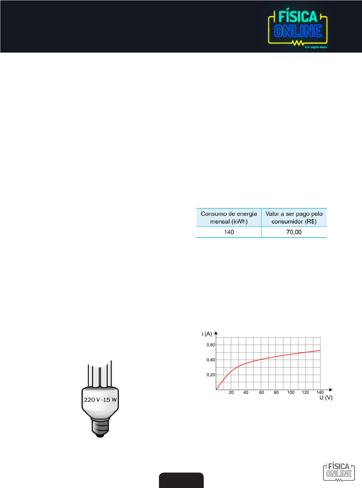 247 Fí si ca - 1. 00 0 Q ue st õe s ENERGIA ELÉTRICA II 1. Uma família que utiliza em sua residência um chuveiro elétrico de 6.000 W de potência decide reduzir em 30 minutos a utilização diária desse chuveiro. Sabendo que a companhia elétrica dessa região cobra R$ 0,30 por kWh utilizado, a economia que a família terá após 30 dias será de A) R$ 16,20 B) R$ 162,00 C) R$ 27,00 D) R$ 90,00 E) R$ 0,90 2. Uma clínica de fisioterapia, querendo reduzir o consumo de energia elétrica, resolve fazer uma avaliação dos aparelhos existentes e pensou em trocar o aparelho de ar condicionado por quatro ventiladores de teto. As especificações dos aparelhos elétricos eram: ar condicio- nado 15.000 BTU – 2.000 W – 220 V, usado durante 10 h por dia, e o ventilador de teto 100 W – 110 V, usado durante 8 h por dia. Considerando o preço do kWh de R$ 0,60, a economia mensal de energia seria cerca de: A) R$ 58,00 B) R$ 302,00 C) R$ 662,00 D) R$ 3.600,00 3. Observe a ilustração. Os valores descritos nessa lâmpada fluorescente com- pacta garantem que ela A) queima imediatamente ao ser ligada em uma tensão elétrica de 110 V. B) possui uma resistência aproximada de 3.300 Ω, que favorece a passagem de corrente. C) consome uma energia elétrica de 0,36 kwh em um período de 24 h. D) permite a passagem de uma corrente de 14,6A atra- vés do gás no tubo da lâmpada. 4. A tabela apresenta parte das informações contidas em uma conta de energia elétrica de determinada residência. Considere que, nessa residência, 8 lâmpadas de 60 W fiquem acessas durante 4 horas por dia, durante um mês de 30 dias. O valor a ser pago por esse consumo será de A) R$ 28,80 B) R$ 21,60 C) R$ 25,20 D) R$ 14,40 E) R$ 3,60 5. O gráfico mostra a relação entre a intensidade da corrente elétrica que atravessa uma lâmpada e a diferença de potencial aplicada entre seus terminais. Considere que essa lâmpada seja ligada a uma diferença de potencial de 120 V e funcione normalmente. Após 10 minutos de funcionamento, a energia elétrica consumida por essa lâmpada terá sido A) 1,8 × 104 J B) 2,4 × 104 J C) 3,6 × 104 J D) 1,2 × 105 J E) 6,0 × 104 J 248 Fí si ca - 1. 00 0 Q ue st õe s 6. A tabela a seguir mostra alguns componentes eletroeletrônicos de uma residência, com a respectiva potência nominal e o tempo médio de uso diário em horas, por elemento. Componentes Quandades Potência (W) Tempo de uso diário (h) Lâmpadas fluorescentes 10 15 4,0 Televisor 3 100 6,0 Lavadora de louça 1 1800 2,0 Freezer horizontal 1 200 24 Ferro elétrico 1 1200 1,0 Sabendo-se que mensalmente o consumo total de energia dessa residência é 400 kWh, o componente da tabela que detém 27% desse valor é representado por A) lâmpada uorescente. B) televisor. C) lavadora de louça. D) freezer horizontal. E) ferro elétrico. 7. O Forno de Bier, um dos dispositivos mais antigos da termoterapia utilizados pela fisioterapia, é assim denominado em homenagem ao seu inventor Dr. August Bier. É um compartimento que se coloca por sobre a região a ser tratada, dentro do qual é gerado calor a partir de resistências elétricas. Consiste em uma peça confeccionada com andre e madeira, em forma de semicilindro, aberto nas duas extremidades. Quando o paciente é introduzido no seu interior, cobre-se o equipamento com um cobertor de flanela, para que haja um mínimo de perda de calor do forno para o meio externo, através das aberturas existentes em suas extremidades. Uma faixa de aplicação confiável fica em torno de . Para que o efeito terapêutico seja 45 a 60°C atingido nos tecidos, é importante que o tempo de aplicação fique em torno de 20 a 30 minutos. DETALHES DO PRODUTO FORNO DE BIER SANTA LUZIA - calor superficial que pode ser aplicado para tronco e membros, para lombalgias, relaxamento muscular e preparação para cinesioterapia - estrutura confeccionada em madeira revestida em material cerâmico composto por fibras de aramida e lã de rocha e borracha NBR isolante - externamente é revestido com chapa de alumínio - resistências internas de níquel cromo de alta durabilidade, protegidas com isolante térmico cerâmico - termostato para regulagem de temperatura - desligamento automático - potência máxima: 1500 W - dimensões: 57 x 65 x 41 - 3 meses de garantia http://www.cirurgicazonasul.com.br/forno-de-bier-com-termostato/ Acessado em: 27/03/2016 Se em uma clínica de fisioterapia são realizadas 10 aplicações diárias, de 30 minutos cada uma, com o forno de Bier espe- cificado ao lado em sua potência máxima, qual o custo mensal, em reais, para essa clínica, devido ao uso desse aparelho, considerando-se 21 dias úteis e o custo do kWh de R$ 0,20? A) 31,50 B) 63,00 C) 157,50 D) 1.500,00 249 Fí si ca - 1. 00 0 Q ue st õe s 8. Nobel de Física vai para 3 japoneses por iluminação a LED 9W 100W Copenhague – Os japoneses Isamu Akasaki, Hiroshi Amano e Shuji Nakamura (foto), este último naturaliza- do americano, foram agraciados nesta terça-feira com o Prêmio Nobel de Física 2014 pela invenção, nos anos 90, do LED azul. A descoberta se inscreve no “espírito de Alfred Nobel” de fazer invenções que geram grande benefício à humanidade, afirmou o comitê do Nobel no Instituto Karolinska, em Estocolmo, na Suécia. Por muitos anos, a indústria teve à sua disposição LED de cor vermelha e verde. No entanto, para obter a luz branca, era necessário ter a componente azul. A importância vem do fato que era impossível criar lâm- padas com luz branca sem o uso do azul. “Para fazer qualquer coisa, você precisa das três cores primárias (vermelho, verde e azul). Vermelho era mais fácil por causa do arsenieto de gálio que já estava disponível, mas ninguém sabia como fazer o azul”, disse akamura em uma entrevista em 2009. Disponível em: http://exame.abril.com.br/tecnologia/noticias/nobelde- -fisica-vai-para-3-japoneses-por-iluminacao-a-led. (Adaptado). Empolgado com a divulgação da n