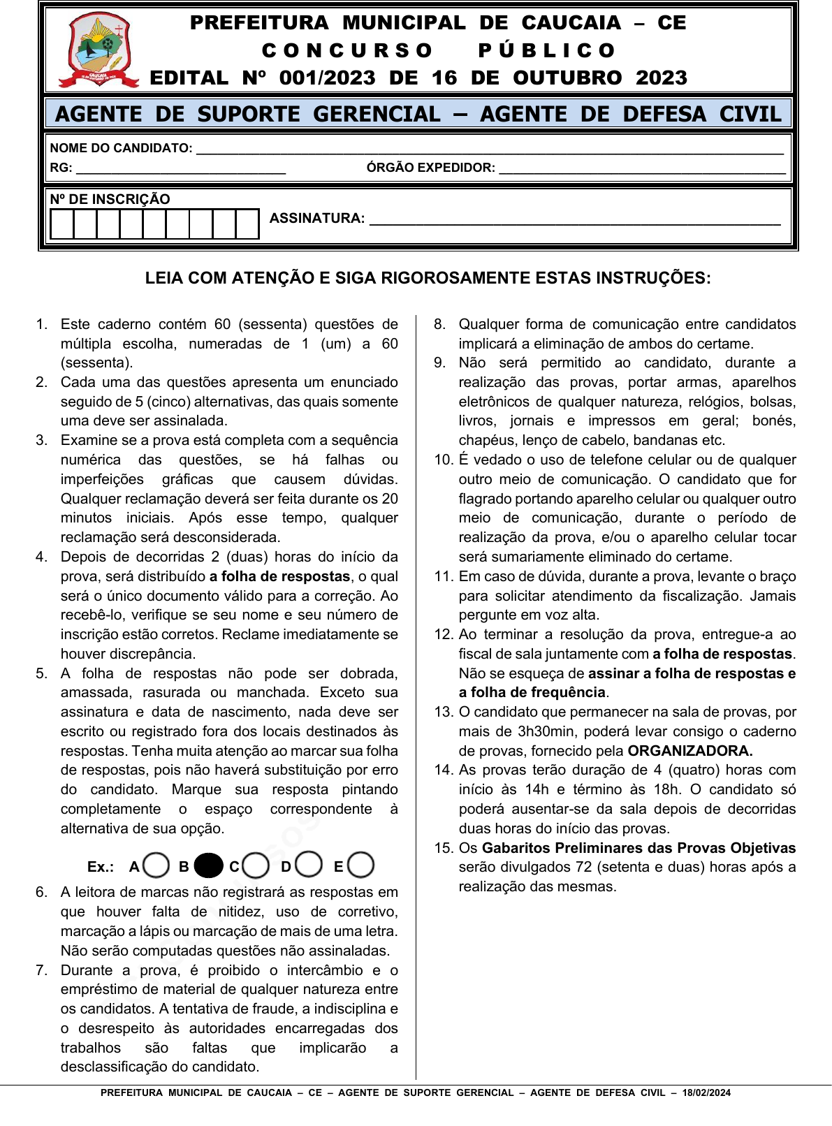 PREFEITURA MUNICIPAL DE CAUCAIA – CE – AGENTE DE SUPORTE GERENCIAL – AGENTE DE DEFESA CIVIL – 18/02/2024