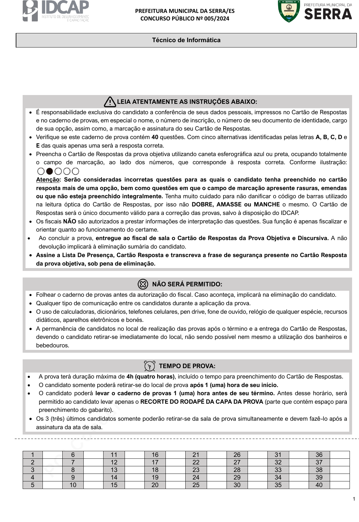 pcimarkpci MDAwMDowMDAwOjAwMDA6MDAwMDowMDAwOmZmZmY6MmQ4YzpjMGQ3:V2VkLCAyNyBOb3YgMjAyNCAwMToyMjoxNCAtMDMwMA== www.pciconcursos.com.br PREFEITURA MUNICIPAL DA SERRA/ES CONCURSO PÚBLICO Nº 005/2024 LEIA ATENTAMENTE AS INSTRUÇÕES ABAIXO: • É responsabilidade exclusiva do candidato a conferência de seus dados pessoais, impressos no Cartão de Respostas e no caderno de provas, em especial o nome, o número de inscrição, o número de seu documento de identidade, cargo de sua opção, assim como, a marcação e assinatura do seu Cartão de Respostas. • Verifique se este caderno de prova contém 40 questões. Com cinco alternativas identificadas pelas letras A, B, C, D e E das quais apenas uma será a resposta correta. • Preencha o Cartão de Respostas da prova objetiva utilizando caneta esferográfica azul ou preta, ocupando totalmente o campo de marcação, ao lado dos números, que corresponde à resposta correta. Conforme ilustração: Atenção: Serão consideradas incorretas questões para as quais o candidato tenha preenchido no cartão resposta mais de uma opção, bem como questões em que o campo de marcação apresente rasuras, emendas ou que não esteja preenchido integralmente. Tenha muito cuidado para não danificar o código de barras utilizado na leitura óptica do Cartão de Respostas, por isso não DOBRE, AMASSE ou MANCHE o mesmo. O Cartão de Respostas será o único documento válido para a correção das provas, salvo à disposição do IDCAP. • Os fiscais NÃO são autorizados a prestar informações de interpretação das questões. Sua função é apenas fiscalizar e orientar quanto ao funcionamento do certame. • Ao concluir a prova, entregue ao fiscal de sala o Cartão de Respostas da Prova Objetiva e Discursiva. A não devolução implicará à eliminação sumária do candidato. • Assine a Lista De Presença, Cartão Resposta e transcreva a frase de segurança presente no Cartão Resposta da prova objetiva, sob pena de eliminação. NÃO SERÁ PERMITIDO: • Folhear o caderno de provas antes da autorização do fiscal. Caso aconteça, implicará na eliminação do candidato. • Qualquer tipo de comunicação entre os candidatos durante a aplicação da prova. • O uso de calculadoras, dicionários, telefones celulares, pen drive, fone de ouvido, relógio de qualquer espécie, recursos didáticos, aparelhos eletrônicos e bonés. • A permanência de candidatos no local de realização das provas após o término e a entrega do Cartão de Respostas, devendo o candidato retirar-se imediatamente do local, não sendo possível nem mesmo a utilização dos banheiros e bebedouros. TEMPO DE PROVA: • A prova terá duração máxima de 4h (quatro horas), incluído o tempo para preenchimento do Cartão de Respostas. • O candidato somente poderá́ retirar-se do local de prova após 1 (uma) hora de seu início. • O candidato poderá́ levar o caderno de provas 1 (uma) hora antes de seu término. Antes desse horário, será permitido ao candidato levar apenas o RECORTE DO RODAPÉ DA CAPA DA PROVA (parte que contém espaço para preenchimento do gabarito). • Os 3 (três) últimos candidatos somente poderão retirar-se da sala de prova simultaneamente e devem fazê-lo após a assinatura da ata de sala. 1 6 11 16 21 26 31 36 2 7 12 17 22 27 32 37 3 8 13 18 23 28 33 38 4 9 14 19 24 29 34 39 5 10 15 20 25 30 35 40 Técnico de Informática 1 pcimarkpci MDAwMDowMDAwOjAwMDA6MDAwMDowMDAwOmZmZmY6MmQ4YzpjMGQ3:V2VkLCAyNyBOb3YgMjAyNCAwMToyMjoxNCAtMDMwMA== www.pciconcursos.com.br PREFEITURA MUNICIPAL DA SERRA/ES CONCURSO PÚBLICO Nº 005/2024 RASCUNHO 2 pcimarkpci MDAwMDowMDAwOjAwMDA6MDAwMDowMDAwOmZmZmY6MmQ4YzpjMGQ3:V2VkLCAyNyBOb3YgMjAyNCAwMToyMjoxNCAtMDMwMA== www.pciconcursos.com.br Língua Portuguesa O texto seguinte servirá de base para responder às questões de 1 a 2. A relação entre consumo de álcool e o câncer A Agência Internacional de Pesquisa sobre o Câncer (IARC, na sigla em inglês) acaba de lançar um manual para incentivar a redução e a cessação do consumo de bebidas alcoólicas, como forma de prevenção contra diversos tipos de tumores. Em 2020, segundo a entidade, mais de 741 mil novos casos de câncer foram atribuídos ao consumo de álcool, o que equivale a 4,1% de todos os registros da doença no mundo. O manual "Redução ou Cessação do Consumo de Bebidas Alcoólicas" detalha as informações de um artigo publicado no fim do ano passado no The New England Journal of Medicine, com dados epidemiológicos e análises feitas por um grupo de trabalho de 15 especialistas internacionais independentes. Os pesquisadores avaliaram a eficácia da redução ou cessação do consumo de álcool na diminuição do risco de câncer mais comumente relacionado ao etilismo, como tumores da cavidade oral, faringe, laringe, esôfago, fígado, colorretal e mama. São abordados temas como os mecanismos que estimulam o desenvolvimento dos tumores no organismo, a ligação entre o tabagismo e o etilismo e as alterações na microbiota, nas respostas inflamatórias e no sistema imune com o consumo de álcool. Desde 2012 a IARC considera as bebidas alcoólicas como cancerígenas para humanos (Grupo 1) com base em evidências suficientes de causalidade para diferentes tipos de neoplasias, alertando que não há limite seguro para o consumo da substância. Em consonância com o órgão internacional, o Instituto Nacional do Câncer (INCA) divulgou no fim do ano passado um documento em apoio a intervenções para redução do consumo de bebidas alcoólicas no Brasil. Uma das medidas seria um imposto seletivo cobrado sobre produtos que geram danos à saúde ou ao meio ambiente, além de ações de combate ao consumo de álcool no âmbito da Política Nacional de Prevenção e Controle do Câncer no âmbito dotexto escrito com expressões injuriantes, discriminatórias e/ou abusivas. Observe, ainda: ✓ O rascunho da redação deverá ser feito no espaço apropri