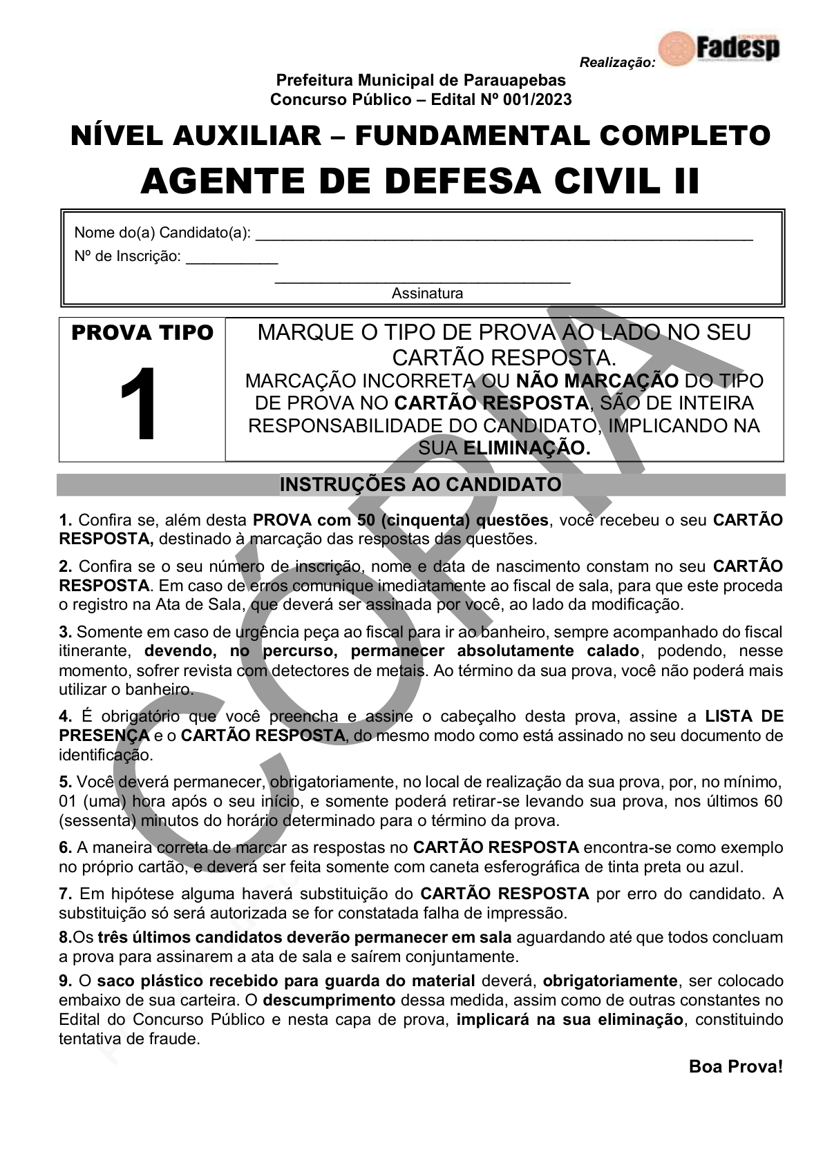 pcimarkpci MDAwMDowMDAwOjAwMDA6MDAwMDowMDAwOmZmZmY6MmQ4YzpjMGQ3:V2VkLCAyNyBOb3YgMjAyNCAwMTowNToyNyAtMDMwMA== www.pciconcursos.com.br Realização: Prefeitura Municipal de Parauapebas Concurso Público – Edital Nº 001/2023 NÍVEL AUXILIAR – FUNDAMENTAL COMPLETO AGENTE DE DEFESA CIVIL II PROVA TIPO 1 MARQUE O TIPO DE PROVA AO LADO NO SEU CARTÃO RESPOSTA. MARCAÇÃO INCORRETA OU NÃO MARCAÇÃO DO TIPO DE PROVA NO CARTÃO RESPOSTA, SÃO DE INTEIRA RESPONSABILIDADE DO CANDIDATO, IMPLICANDO NA SUA ELIMINAÇÃO. INSTRUÇÕES AO CANDIDATO 1. Confira se, além desta PROVA com 50 (cinquenta) questões, você recebeu o seu CARTÃO RESPOSTA, destinado à marcação das respostas das questões. 2. Confira se o seu número de inscrição, nome e data de nascimento constam no seu CARTÃO RESPOSTA. Em caso de erros comunique imediatamente ao fiscal de sala, para que este proceda o registro na Ata de Sala, que deverá ser assinada por você, ao lado da modificação. 3. Somente em caso de urgência peça ao fiscal para ir ao banheiro, sempre acompanhado do fiscal itinerante, devendo, no percurso, permanecer absolutamente calado, podendo, nesse momento, sofrer revista com detectores de metais. Ao término da sua prova, você não poderá mais utilizar o banheiro. 4. É obrigatório que você preencha e assine o cabeçalho desta prova, assine a LISTA DE PRESENÇA e o CARTÃO RESPOSTA, do mesmo modo como está assinado no seu documento de identificação. 5. Você deverá permanecer, obrigatoriamente, no local de realização da sua prova, por, no mínimo, 01 (uma) hora após o seu início, e somente poderá retirar-se levando sua prova, nos últimos 60 (sessenta) minutos do horário determinado para o término da prova. 6. A maneira correta de marcar as respostas no CARTÃO RESPOSTA encontra-se como exemplo no próprio cartão, e deverá ser feita somente com caneta esferográfica de tinta preta ou azul. 7. Em hipótese alguma haverá substituição do CARTÃO RESPOSTA por erro do candidato. A substituição só será autorizada se for constatada falha de impressão. 8.Os três últimos candidatos deverão permanecer em sala aguardando até que todos concluam a prova para assinarem a ata de sala e saírem conjuntamente. 9. O saco plástico recebido para guarda do material deverá, obrigatoriamente, ser colocado embaixo de sua carteira. O descumprimento dessa medida, assim como de outras constantes no Edital do Concurso Público e nesta capa de prova, implicará na sua eliminação, constituindo tentativa de fraude. Boa Prova! Nome do(a) Candidato(a): ______________________________________________________ Nº de Inscrição: __________ ________________________________ Assinatura pcimarkpci MDAwMDowMDAwOjAwMDA6MDAwMDowMDAwOmZmZmY6MmQ4YzpjMGQ3:V2VkLCAyNyBOb3YgMjAyNCAwMTowNToyNyAtMDMwMA== www.pciconcursos.com.br pcimarkpci MDAwMDowMDAwOjAwMDA6MDAwMDowMDAwOmZmZmY6MmQ4YzpjMGQ3:V2VkLCAyNyBOb3YgMjAyNCAwMTowNToyNyAtMDMwMA== www.pciconcursos.com.br 3 PORTUGUÊS LEIA O TEXTO E DEPOIS RESPONDA ÀS QUESTÕES 01 a 10 Em homenagem ao Círio de Nazaré e aos romeiros da maior manifestação católica do povo amazônida, o Tribunal de Contas do Estado do Pará (TCE-PA) lançará no dia 2 de outubro, às 17 horas, a 13ª Exposição “Canoas de Promesseiros 2023: a inclusão embarca aqui”, nos espelhos d’água do prédio-sede, no bairro de Nazaré, em Belém. O tema deste ano é um chamamento à maior participação de pessoas com o espectro autista na programação alusiva à festa religiosa. A exposição com barquinhos de miriti faz referência à Procissão Fluvial, que é uma das romarias que fazem parte da programação do Círio, e destaca o trabalho dos artesãos do município de Abaetetuba, na região tocantina, responsáveis pela confecção das peças que se tornaram um dos símbolos mais evidentes do período nazareno. A beleza do cenário formado pelos barcos em miniatura, que também conta com uma iluminação especial, encanta a todos que transitam pelo entorno do prédio-sede, que está localizado na esquina da avenida Nazaré, por onde passam a trasladação, no sábado, e a grande procissão, que ocorrerá no dia 8 de outubro. A Exposição “Canoas de Promesseiros” foi idealizada pelo Conselheiro aposentado do TCE Nelson Chaves. Após o fim da exposição, marcado para o dia 16 de outubro, os barquinhos de miriti serão doados a alunos da rede pública estadual de ensino. A inclusão embarca aqui, embarque você também. (www.portaltcepa.tc.br/comunicacao. Texto adaptado) 01 A finalidade do texto é divulgar a (A) procissão da trasladação. (B) exposição “Canoas de Promesseiros 2023” nos espelhos d’água do prédio-sede Tribunal de Contas do Estado do Pará. (C) restauração do prédio-sede Tribunal de Contas do Estado do Pará. (D) recepção de turistas durante o Círio de Nazaré. 02 De acordo com o texto, a exposição “Canoas de Promesseiros 2023” objetiva (A) vender brinquedos de miriti. (B) valorizar o Círio do município de Abaetetuba. (C) inscrever os alunos na rede pública estadual de ensino. (D) homenagear o Círio de Nazaré em Belém e os romeiros dessa manifestação católica. 03 A temática da exposição “Canoas de Promesseiros 2023” é inclusiva porque pretende (A) reunir turistas nacionais e internacionais. (B) apresentar músicas e danças da região tocantina. (C) envolver o maior número de pessoas com o espectro autista na programação alusiva à festa religiosa. (D) avaliar o melhor brinquedo de miriti para crianças. 04 Após o término da exposição, os barquinhos de miriti (A) serão doados a alunos da rede pública estadual de ensino. (B) ficarão na brinquedoteca do prédio-sede do Tribunal de Contas do Pará. (C) permanecerão no mesmo local como atrativo a visitantes. (D) receberão nova pintura. 05 A frase “A inclusão embarca aqui, embarque você também.” (quinto parágrafo) apresenta sentido predominantemente (A) denotativo. (B) 