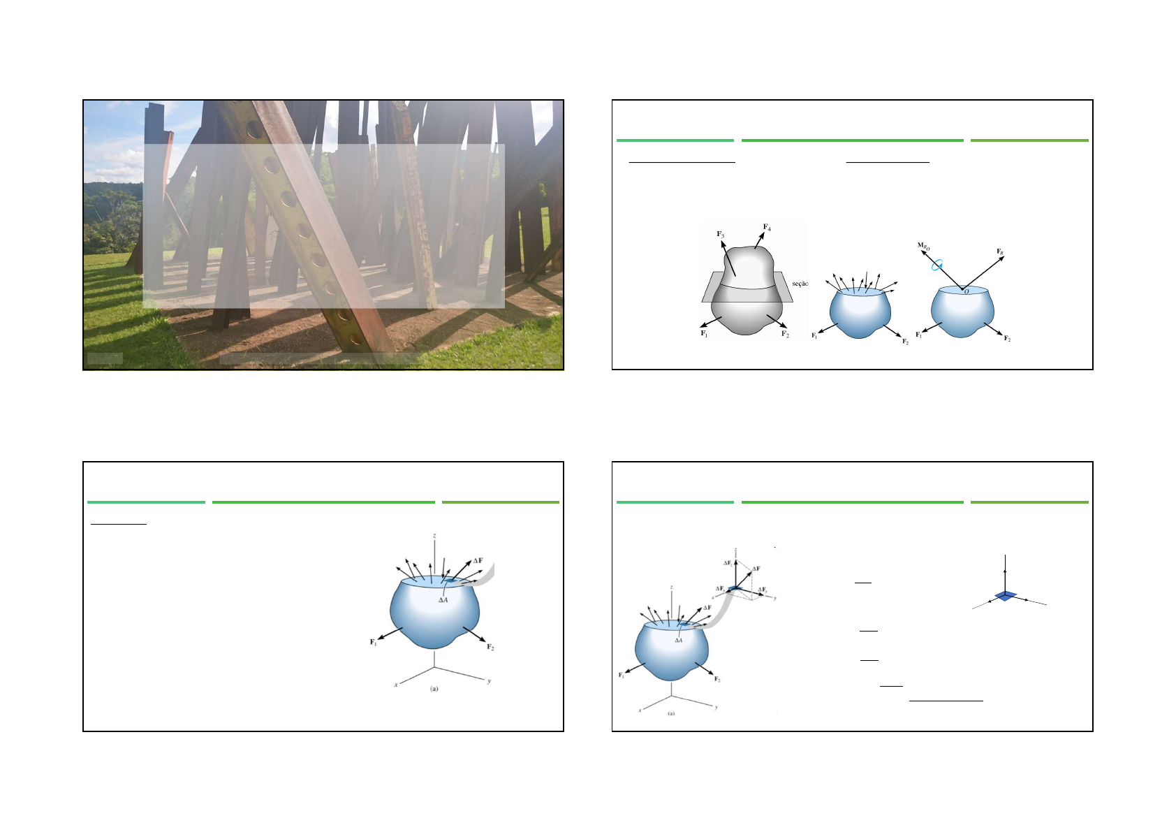 07/03/2024 1 Resistência dos Materiais III Prof.ª Fernanda Lins Gonçalves Pereira 07/03/2024 Resistência dos Materiais III - Prof.ª Fernanda Lins G. Pereira (UERJ - Eng. Civil) 1 Tensão • Método das seções para determinar as cargas internas que atuam em uma região específica no interior corpo. • D.C.L. e Equações de Equilíbrio → Força Resultante FR e Momento MRO em qualquer ponto específico O. 07/03/2024 Resistência dos Materiais III - Prof.ª Fernanda Lins G. Pereira (UERJ - Eng. Civil) 2 Tensão Hipóteses em relação às propriedades do material: • O material é contínuo – sem vazios • O material é o coeso – sem trincas, separações ou outras falhas Área pequena – ΔA, Força pequena – ΔF 07/03/2024 Resistência dos Materiais III - Prof.ª Fernanda Lins G. Pereira (UERJ - Eng. Civil) 3 Tensão Área pequena – ΔA, Força pequena – ΔF Três componentes: ΔFx, ΔFy e ΔFz (tangentes e normal) Tensão normal, 𝜎 = lim → Tensão de cisalhamento, 𝜏 = lim → 𝜏 = lim → O eixo de z especifica a orientação da área, enquanto x e y referem-se às retas de direção de cisalhamento 07/03/2024 Resistência dos Materiais III - Prof.ª Fernanda Lins G. Pereira (UERJ - Eng. Civil) 4 𝑥 𝑦 𝑧 𝜎 𝜏 𝜏 07/03/2024 2 Tensão 07/03/2024 Resistência dos Materiais III - Prof.ª Fernanda Lins G. Pereira (UERJ - Eng. Civil) 5 𝑥 𝑦 𝑧 𝜎 𝜏 𝜏 Tensão normal, 𝜎 = lim → Tensão de cisalhamento, 𝜏 = lim → 𝜏 = lim → Fonte: @engmatheusborges Tensão 07/03/2024 Resistência dos Materiais III - Prof.ª Fernanda Lins G. Pereira (UERJ - Eng. Civil) 6 𝑥 𝑦 𝑧 𝜎 𝜏 𝜏 Tensão • Estado de Tensões em um Ponto Tensor das Tensões 07/03/2024 Resistência dos Materiais III - Prof.ª Fernanda Lins G. Pereira (UERJ - Eng. Civil) 7 σX XY XZ σY YXYZ σZ ZY ZX σX XY XZ σY YX YZ X Y Z 𝜎 𝜏 𝜏 𝜏 𝜎 𝜏 𝜏 𝜏 𝜎 Tensão UNIDADES • S.I. – Sistema Internacional de Unidades • Força N (newton) • Comprimento (metro) • Tensão newton por metro quadrado – chamada de pascal 1 Pa=1N/m² – unidade muito pequena, utiliza-se então 1 kPa=1x10³N/m² , 1 MPa=1x106N/m2 ou 1GPa=1x109N/m² • U.S.C.S. – United States Customary System – Sistema americano de unidades • Força lbf (pound-force ou libra-força) • Comprimento in ou pol (inch ou polegada) e pé, sendo 1 pé = 12 pol • Tensão expressa em libras por polegada quadrada “psi” ou quilolibras por polegada quadrada “ksi”. • Conversão de unidades: 1 psi = 6895 Pa e 1 pol = 2,54 cm 07/03/2024 Resistência dos Materiais III - Prof.ª Fernanda Lins G. Pereira (UERJ - Eng. Civil) 8 07/03/2024 3 Tensão psi= pounds per square inch = libras por polegada quadrada psf= pounds per square foot = libras por pé quadrado 1 pé=12 in 07/03/2024 Resistência dos Materiais III - Prof.ª Fernanda Lins G. Pereira (UERJ - Eng. Civil) 9 1 psi=6895 Pa 1Pa=1,45x10-4 psi 1 psi=6,895 kPa 1kPa=1,45x10-1 psi 1 ksi=6,895 MPa 1MPa=1,45x10+2 psi 1000 ksi=6,895 GPa 1GPa=1,45x10+5 psi 1 psf=47,88 Pa 1 Pa=0,02089 psf Tensão 07/03/2024 Resistência dos Materiais III - Prof.ª Fernanda Lins G. Pereira (UERJ - Eng. Civil) 10 Tensão Normal Média em uma Barra com Carga Axial Hipóteses: • Barra permanece reta e seção transversal permanece plana • Linhas horizontais e verticais deformam-se uniformemente • Não consideraremos as regiões próximas às extremidades (distorções localizadas) • Carga aplicada ao longo do centroide da seção transversal e o material seja homogêneo (mesmas propriedades físicas e mecânicas em todo seu volume) e isotrópico (possui essas mesmas propriedades em todas as direções) 07/03/2024 Resistência dos Materiais III - Prof.ª Fernanda Lins G. Pereira (UERJ - Eng. Civil) 11 Tensão Normal Média em uma Barra com Carga Axial • Distribuição de tensão normal média: Cada área Δ𝐴, está sujeita a uma força Δ𝐹 = 𝜎Δ𝐴 Se Δ𝐴 → 𝑑𝐴 e Δ𝐹 → 𝑑𝐹, admitindo 𝜎 constante ∑ 𝐹 = ∫ 𝑑𝐹 = ∫ 𝜎𝑑𝐴 𝑃 = 𝜎𝐴 𝜎 = 07/03/2024 Resistência dos Materiais III - Prof.ª Fernanda Lins G. Pereira (UERJ - Eng. Civil) 12 07/03/2024 4 Tensão Normal Média em uma Barra com Carga Axial • Convenção de sinais: Um valor positivo para s indica uma tensão de tração. Ou seja, a tensão devida a uma força DF puxa a área na qual ela age. Um valor negativo para s indica uma tensão de compressão. Ou seja, a tensão devida a uma força DF empurra a área na qual ela age. 07/03/2024 Resistência dos Materiais III - Prof.ª Fernanda Lins G. Pereira (UERJ - Eng. Civil) 13 Tensão Normal Média em uma Barra com Carga Axial • Tensão Média em A 𝜎 é = 𝐹 𝐴 = 𝑃 𝐴 • Tensão Média em B 𝜎 é = 𝐹 𝐴 = 𝑃 𝐴 07/03/2024 Resistência dos Materiais III - Prof.ª Fernanda Lins G. Pereira (UERJ - Eng. Civil) 14 Tensão normal média – Exemplo 1 • Um empreiteiro prendeu um cabo de aço em um olhal, ponto A, no seu compressor, e com a haste de sua ponte rolante içou o compressor. Se o compressor pesar 600 libras e o diâmetro do cabo for 3/16 polegadas, qual será a tensão trativa no cabo? 07/03/2024 Resistência dos Materiais III - Prof.ª Fernanda Lins G. Pereira (UERJ - Eng. Civil) 15 Tensão normal média – Exemplo 1 • Peso do compressor = 600 lb; diâmetro do cabo = 3/16 pol; tensão no cabo? • D.C.L. 07/03/2024 Resistência dos Materiais III - Prof.ª Fernanda Lins G. Pereira (UERJ - Eng. Civil) 16 ∑ 𝐹 = 0 𝐹 − 600 𝑙𝑏 = 0 𝐹 = 600 𝑙𝑏 • Solução 𝜎 é = = = ⋅ ⋅ 𝜎 é = 21729,95psi=21,7ksi 07/03/2024 5 Tensão normal média – Para casa 07/03/2024 Resistência dos Materiais III - Prof.ª Fernanda Lins G. Pereira (UERJ - Eng. Civil) 17 Fonte: @engmatheusborges em MPa Tensão normal média – Para casa • Solução 𝜎 é = = ⋅ , ⋅ = 3,43𝑀𝑃𝑎 07/03/2024 Resistência dos Materiais III - Pr