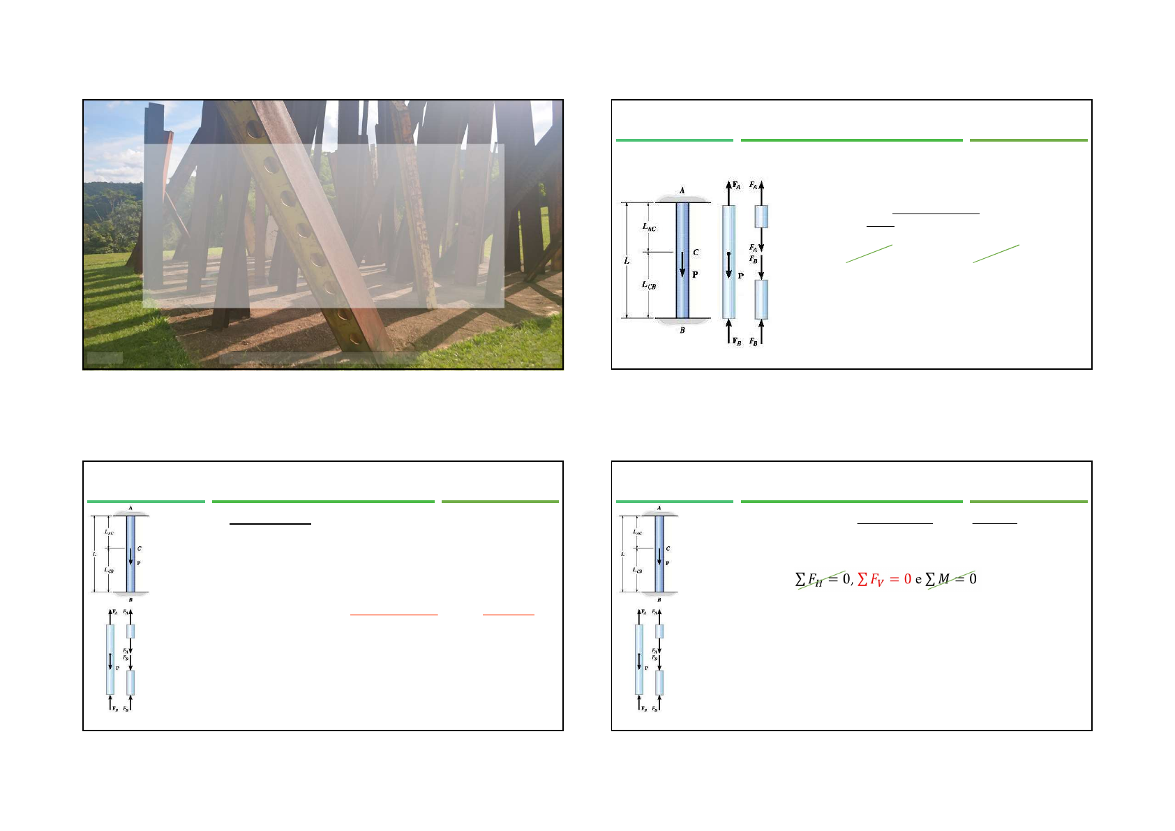 14/03/2024 1 Resistência dos Materiais III Prof.ª Fernanda Lins Gonçalves Pereira 14/03/2024 Resistência dos Materiais III - Prof.ª Fernanda Lins G. Pereira (UERJ - Eng. Civil) 1 Membros Estaticamente Indeterminados • D.C.L. → Reações nos apoios A (𝐹 ) e B (𝐹 ), e os respectivos esforços internos • Equações de equilíbrio • Como não temos cargas horizontais e como as cargas e reações são axiais, a primeira e a terceira equações são automaticamente satisfeitas ∑𝐹 = 0, ∑𝐹 = 0 e ∑𝑀 = 0 +↑ ∑𝐹 . = 0 ⇒𝐹 + 𝐹 − 𝑃 = 0 ∴ 𝐹 + 𝐹 = 𝑃 • Uma equação de equilíbrio disponível e duas incógnitas 𝐹 e 𝐹 • Matematicamente, esse é um sistema indeterminado 14/03/2024 Resistência dos Materiais III - Prof.ª Fernanda Lins G. Pereira (UERJ - Eng. Civil) 2 D.C.L. Membros Estaticamente Indeterminados • Estruturas estaticamente indeterminadas (hiperestáticas), são assim conhecidas, pelo fato das equações de equilíbrio não serem suficientes para resolvê-las. • A grande maioria das estruturas reais é hiperestática..... • Como resolver um sistema com mais incógnitas do que equações disponíveis? 14/03/2024 Resistência dos Materiais III - Prof.ª Fernanda Lins G. Pereira (UERJ - Eng. Civil) 3 Membros Estaticamente Indeterminados • Como resolver um sistema com mais incógnitas do que equações disponíveis ? Adicionando mais equações! • Porém, não existem outras equações de equilíbrio Então, vamos incluir outro tipo de equação .... • Uma equação que caracterize como a estrutura se desloca • Por exemplo, sabemos que o deslocamento relativo entre os pontos A e B é zero, 𝛿 / = 0 • Esse tipo de equação recebe o nome de Equação de compatibilidade de deslocamentos 14/03/2024 Resistência dos Materiais III - Prof.ª Fernanda Lins G. Pereira (UERJ - Eng. Civil) 4 14/03/2024 2 Membros Estaticamente Indeterminados Um sistema com mais incógnitas do que equações disponíveis, solução: • Equação de Equilíbrio +↑ ∑𝐹 . = 0 ⇒𝐹 + 𝐹 − 𝑃 = 0 ∴ 𝐹 + 𝐹 = 𝑃 • Equação de Compatibilidade de Deslocamentos 𝛿 / = 0 ⇒ 𝛿 / = ∫ ( ) ( ) 𝑑𝑥 = 0 𝛿 / = ∫ 𝑑𝑥 + ∫ 𝑑𝑥 = 0 ∫ 𝑑𝑥 + ∫ 𝑑𝑥 = 0 𝐿 + 𝐿 = 0 14/03/2024 Resistência dos Materiais III - Prof.ª Fernanda Lins G. Pereira (UERJ - Eng. Civil) 5 Membros Estaticamente Indeterminados Um sistema com mais incógnitas do que equações disponíveis, solução: • Equação de Equilíbrio +↑ ∑𝐹 . = 0 ⇒𝐹 + 𝐹 − 𝑃 = 0 ∴ 𝐹 + 𝐹 = 𝑃 • Equação de Compatibilidade de Deslocamentos 𝐿 + 𝐿 = 0 𝐿 − 𝐿 = 0 → 𝐹 = • Agora temos duas equações disponíveis e duas incógnitas 𝐹 e 𝐹 • Matematicamente, esse é um sistema determinado 14/03/2024 Resistência dos Materiais III - Prof.ª Fernanda Lins G. Pereira (UERJ - Eng. Civil) 6 Membros Estaticamente Indeterminados Um sistema com mais incógnitas do que equações disponíveis, solução: • Equação de Equilíbrio + Equação de Compatibilidade de Deslocamentos 𝐹 + 𝐹 = 𝑃 e 𝐹 = + 𝐹 = 𝑃 → 𝐹 = 𝑃 ⋅ → 𝐹 = 𝐹 = → 𝐹 = 14/03/2024 Resistência dos Materiais III - Prof.ª Fernanda Lins G. Pereira (UERJ - Eng. Civil) 7 Métodos Para Solução de Estruturas Estaticamente Indeterminadas • Um sistema com mais incógnitas do que equações disponíveis, solução: Equação de Equilíbrio + Equação de Compatibilidade de Deslocamentos • Para a solução de estruturas estaticamente indeterminadas, o conceito explicado acima pode ser formulado através de dois métodos: • Método das Forças (Método da Flexibilidade) Incógnitas FORÇAS • Método dos Deslocamentos (Método da Rigidez) Incógnitas DESLOCAMENTOS 14/03/2024 Resistência dos Materiais III - Prof.ª Fernanda Lins G. Pereira (UERJ - Eng. Civil) 8 14/03/2024 3 • 1° passo - A ideia principal do método das forças, é transformar a estrutura estaticamente indeterminada em uma estrutura estaticamente determinada, pela remoção de restrições; Método das Forças 14/03/2024 Resistência dos Materiais III - Prof.ª Fernanda Lins G. Pereira (UERJ - Eng. Civil) 9 Estrutura Estaticamente Indeterminada Estrutura Estaticamente Determinada Método das Forças 14/03/2024 Resistência dos Materiais III - Prof.ª Fernanda Lins G. Pereira (UERJ - Eng. Civil) 10 Estrutura Estaticamente Indeterminada Estrutura Estaticamente Determinada Ações Externas • 2º passo - À estrutura estaticamente determinada, são aplicadas, numa primeira etapa, as ações externas (forças, variação de temperatura, etc..), e deslocamentos são calculados (p.e. na extremidade onde a restrição foi removida); Método das Forças 14/03/2024 Resistência dos Materiais III - Prof.ª Fernanda Lins G. Pereira (UERJ - Eng. Civil) 11 Ações Externas D.C.L. • 2º passo - À estrutura estaticamente determinada, são aplicadas, numa primeira etapa, as ações externas (forças, variação de temperatura, etc..), e deslocamentos são calculados (p.e. na extremidade onde a restrição foi removida); 𝛿 / = 𝐿 + 𝐿 𝛿 / = − 𝐿 • 3º passo - A reação (incógnita) associada à restrição removida, é aplicada na estrutura estaticamente determinada e novamente os deslocamentos são calculados; Método das Forças 14/03/2024 Resistência dos Materiais III - Prof.ª Fernanda Lins G. Pereira (UERJ - Eng. Civil) 12 Estrutura Estaticamente Indeterminada Estrutura Estaticamente Determinada FA Reação (incógnita) 14/03/2024 4 • 3º passo - A reação (incógnita) associada à restrição removida, é aplicada na estrutura estaticamente determinada e novamente os deslocamentos são calculados; 𝛿 / = 𝐿 + 𝐿 𝛿 / = 𝐿 + 𝐿 𝛿 / = 𝐿 Método das Forças 14/03/2024 Resistência dos Materiais III - Prof.ª Fernanda Lins G. Pereira (UERJ - Eng. Civil) 13 FA Reação (incógnita) D.C.L. 𝐹 𝐹 𝐹 