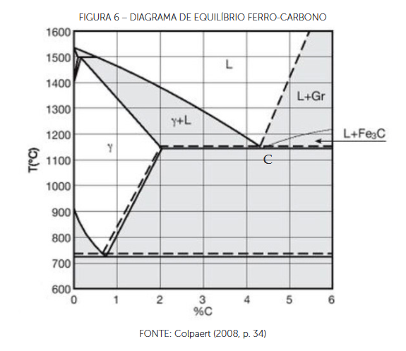 FIGURA 6 - DIAGRAMA DE FERRO-CARBONO 1600 1500 L 1400 L+Gr 1300 Y+L 1200 L+Fe3C Y 1100 C 1000 900 800 700 600 0 1 2 3 4 5 6 %C FONTE: Colpaert (2008, p. 34)