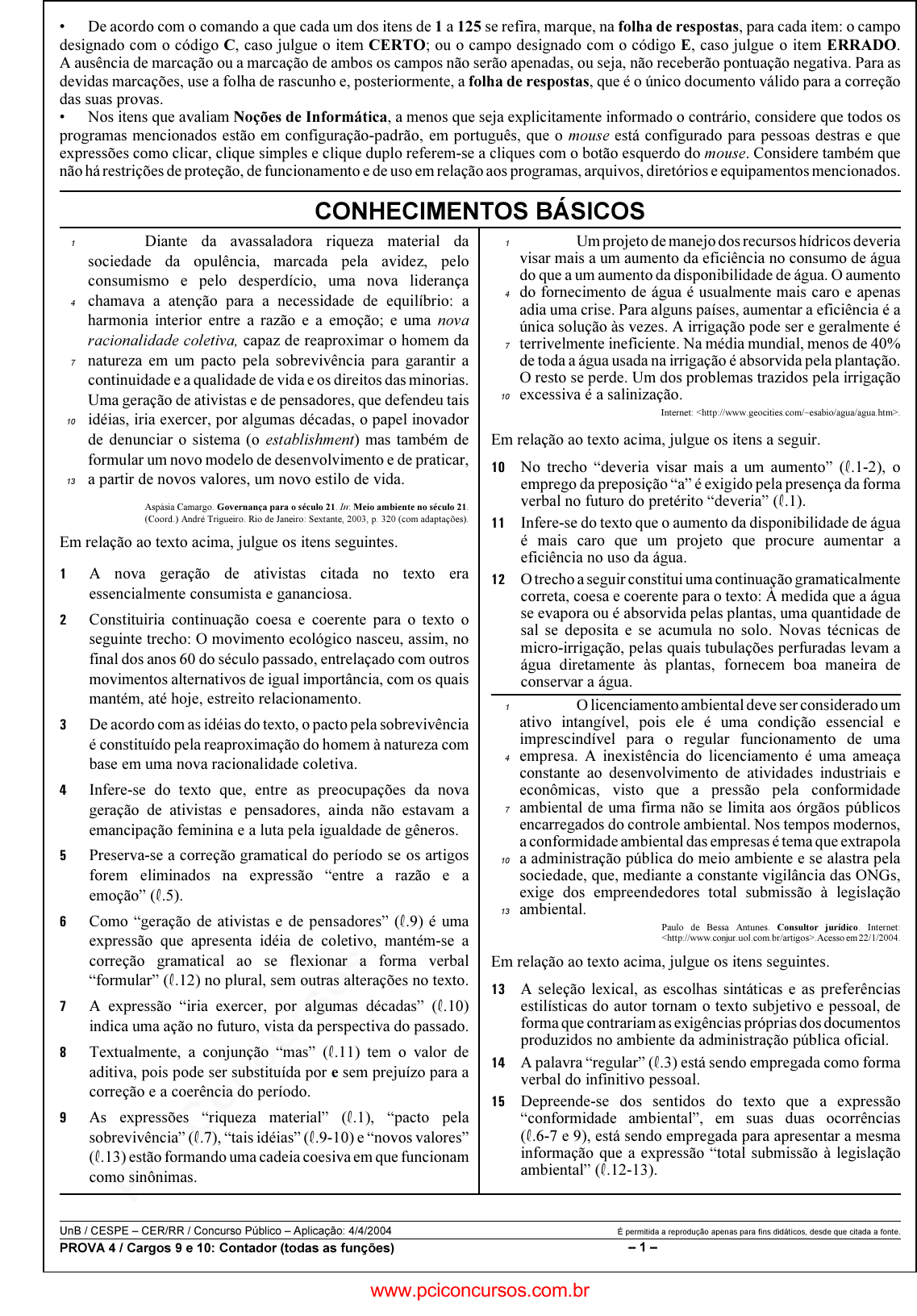 pcimarkpci MDAwMDowMDAwOjAwMDA6MDAwMDowMDAwOmZmZmY6MmQ4YzpjMGQ3:V2VkLCAyNyBOb3YgMjAyNCAwMDo1ODowNSAtMDMwMA== www.pciconcursos.com.br UnB / CESPE – CER/RR / Concurso Público – Aplicação: 4/4/2004 É permitida a reprodução apenas para fins didáticos, desde que citada a fonte. PROVA 4 / Cargos 9 e 10: Contador (todas as funções) – 1 – • De acordo com o comando a que cada um dos itens de 1 a 125 se refira, marque, na folha de respostas, para cada item: o campo designado com o código C, caso julgue o item CERTO; ou o campo designado com o código E, caso julgue o item ERRADO. A ausência de marcação ou a marcação de ambos os campos não serão apenadas, ou seja, não receberão pontuação negativa. Para as devidas marcações, use a folha de rascunho e, posteriormente, a folha de respostas, que é o único documento válido para a correção das suas provas. • Nos itens que avaliam Noções de Informática, a menos que seja explicitamente informado o contrário, considere que todos os programas mencionados estão em configuração-padrão, em português, que o mouse está configurado para pessoas destras e que expressões como clicar, clique simples e clique duplo referem-se a cliques com o botão esquerdo do mouse. Considere também que não há restrições de proteção, de funcionamento e de uso em relação aos programas, arquivos, diretórios e equipamentos mencionados. CONHECIMENTOS BÁSICOS Diante da avassaladora riqueza material da1 sociedade da opulência, marcada pela avidez, pelo consumismo e pelo desperdício, uma nova liderança chamava a atenção para a necessidade de equilíbrio: a4 harmonia interior entre a razão e a emoção; e uma nova racionalidade coletiva, capaz de reaproximar o homem da natureza em um pacto pela sobrevivência para garantir a7 continuidade e a qualidade de vida e os direitos das minorias. Uma geração de ativistas e de pensadores, que defendeu tais idéias, iria exercer, por algumas décadas, o papel inovador10 de denunciar o sistema (o establishment) mas também de formular um novo modelo de desenvolvimento e de praticar, a partir de novos valores, um novo estilo de vida.13 Aspásia Camargo. Governança para o século 21. In: Meio ambiente no século 21. (Coord.) André Trigueiro. Rio de Janeiro: Sextante, 2003, p. 320 (com adaptações). Em relação ao texto acima, julgue os itens seguintes. � A nova geração de ativistas citada no texto era essencialmente consumista e gananciosa. � Constituiria continuação coesa e coerente para o texto o seguinte trecho: O movimento ecológico nasceu, assim, no final dos anos 60 do século passado, entrelaçado com outros movimentos alternativos de igual importância, com os quais mantém, até hoje, estreito relacionamento. � De acordo com as idéias do texto, o pacto pela sobrevivência é constituído pela reaproximação do homem à natureza com base em uma nova racionalidade coletiva. � Infere-se do texto que, entre as preocupações da nova geração de ativistas e pensadores, ainda não estavam a emancipação feminina e a luta pela igualdade de gêneros. � Preserva-se a correção gramatical do período se os artigos forem eliminados na expressão “entre a razão e a emoção” (R.5). � Como “geração de ativistas e de pensadores” (R.9) é uma expressão que apresenta idéia de coletivo, mantém-se a correção gramatical ao se flexionar a forma verbal “formular” (R.12) no plural, sem outras alterações no texto. � A expressão “iria exercer, por algumas décadas” (R.10) indica uma ação no futuro, vista da perspectiva do passado. � Textualmente, a conjunção “mas” (R.11) tem o valor de aditiva, pois pode ser substituída por e sem prejuízo para a correção e a coerência do período. As expressões “riqueza material” (R.1), “pacto pela sobrevivência” (R.7), “tais idéias” (R.9-10) e “novos valores” (R.13) estão formando uma cadeia coesiva em que funcionam como sinônimas. Um projeto de manejo dos recursos hídricos deveria1 visar mais a um aumento da eficiência no consumo de água do que a um aumento da disponibilidade de água. O aumento do fornecimento de água é usualmente mais caro e apenas4 adia uma crise. Para alguns países, aumentar a eficiência é a única solução às vezes. A irrigação pode ser e geralmente é terrivelmente ineficiente. Na média mundial, menos de 40%7 de toda a água usada na irrigação é absorvida pela plantação. O resto se perde. Um dos problemas trazidos pela irrigação excessiva é a salinização. 10 Internet: . Em relação ao texto acima, julgue os itens a seguir. � No trecho “deveria visar mais a um aumento” (R.1-2), o emprego da preposição “a” é exigido pela presença da forma verbal no futuro do pretérito “deveria” (R.1). �� Infere-se do texto que o aumento da disponibilidade de água é mais caro que um projeto que procure aumentar a eficiência no uso da água. �� O trecho a seguir constitui uma continuação gramaticalmente correta, coesa e coerente para o texto: À medida que a água se evapora ou é absorvida pelas plantas, uma quantidade de sal se deposita e se acumula no solo. Novas técnicas de micro-irrigação, pelas quais tubulações perfuradas levam a água diretamente às plantas, fornecem boa maneira de conservar a água. O licenciamento ambiental deve ser considerado um1 ativo intangível, pois ele é uma condição essencial e imprescindível para o regular funcionamento de uma empresa. A inexistência do licenciamento é uma ameaça4 constante ao desenvolvimento de atividades industriais e econômicas, visto que a pressão pela conformidade ambiental de uma firma não se limita aos órgãos públicos7 encarregados do controle ambiental. Nos tempos modernos, a conformidade ambiental das empresas é tema que extrapola a administração pública do meio ambiente e se alastra pela10 sociedade, que, mediante a constante vigilânci