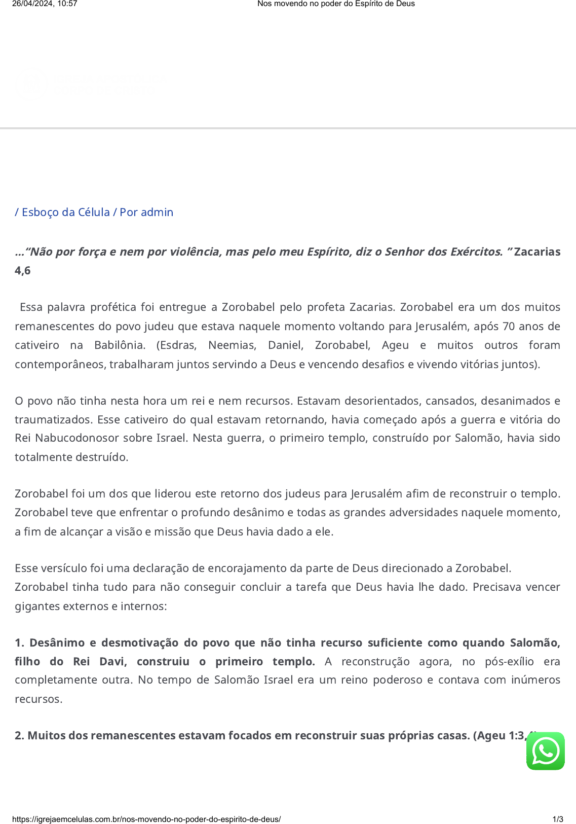 NOS MOVENDO NO PODER DO ESPÍRITO DE DEUS / Esboço da Célula / Por admin …“Não por força e nem por violência, mas pelo meu Espírito, diz o Senhor dos Exércitos. ” Zacarias 4,6 Essa palavra profética foi entregue a Zorobabel pelo profeta Zacarias. Zorobabel era um dos muitos remanescentes do povo judeu que estava naquele momento voltando para Jerusalém, após 70 anos de cativeiro na Babilônia. (Esdras, Neemias, Daniel, Zorobabel, Ageu e muitos outros foram contemporâneos, trabalharam juntos servindo a Deus e vencendo desa�os e vivendo vitórias juntos). O povo não tinha nesta hora um rei e nem recursos. Estavam desorientados, cansados, desanimados e traumatizados. Esse cativeiro do qual estavam retornando, havia começado após a guerra e vitória do Rei Nabucodonosor sobre Israel. Nesta guerra, o primeiro templo, construído por Salomão, havia sido totalmente destruído. Zorobabel foi um dos que liderou este retorno dos judeus para Jerusalém a�m de reconstruir o templo. Zorobabel teve que enfrentar o profundo desânimo e todas as grandes adversidades naquele momento, a �m de alcançar a visão e missão que Deus havia dado a ele. Esse versículo foi uma declaração de encorajamento da parte de Deus direcionado a Zorobabel. Zorobabel tinha tudo para não conseguir concluir a tarefa que Deus havia lhe dado. Precisava vencer gigantes externos e internos: 1. Desânimo e desmotivação do povo que não tinha recurso su�ciente como quando Salomão, �lho do Rei Davi, construiu o primeiro templo. A reconstrução agora, no pós-exílio era completamente outra. No tempo de Salomão Israel era um reino poderoso e contava com inúmeros recursos. 2. Muitos dos remanescentes estavam focados em reconstruir suas próprias casas. (Ageu 1:3,4) 26/04/2024, 10:57 Nos movendo no poder do Espírito de Deus https://igrejaemcelulas.com.br/nos-movendo-no-poder-do-espirito-de-deus/ 1/3 https://igrejaemcelulas.com.br/category/esboco-da-celula/ https://igrejaemcelulas.com.br/author/admin/ https://igrejaemcelulas.com.br/ https://igrejaemcelulas.com.br/ 3. Tinham muitos traumatizados e cansados. O choro dos anciãos se misturava com gritos de júbilo dos mais jovens. (Esdras 3,12) 4. Havia muitas propostas tentadoras de outros povos para “ajudar” na reconstrução. (Esdras 4,1e 2) 5. Havia tramas e mentiras de povos inimigos que não queriam a reconstrução do Templo. (Esdras 4, 4 a 6). Neste contexto o povo precisava ser lembrado de que apesar de suas falhas e limitações que os havia levado àquela situação, Deus não falharia em cumprir o seu propósito; portanto levantou profetas como Zacarias e Ageu para fortalece-los: Deus disse: “…segundo a palavra da aliança que �z convosco, quando saíram do Egito; o meu Espírito habita no meio de vós; não temais!” (Ageu 2,5). Deus disse pelo profeta Ageu 2:9): “A glória desta última casa será maior do que a da primeira; diz o Senhor.” A declaração: “não por força nem por violência, mas pelo meu Espírito” é muito mais do que uma mensagem para Zorobabel e para o povo judeu que tinha acabado de sair dum cativeiro, ela é e será eternamente uma palavra de encorajamento para todos que estão envolvidos na obra de Deus, bem como um alerta a todos que pensam que há mérito humano no que é realizado para Deus. Somente quando vivemos pelo Espírito, guiados por Ele, poderemos experimentar o verdadeiro sucesso espiritual que alcança todas as demais áreas da nossa vida. O Espírito do Senhor é a fonte de toda virtude que possamos demonstrar; o seu poder é a força e o vigor para toda boa obra que possamos realizar. Jamais devemos cair no erro de pensar que a obra de Deus e as guerras e lutas que enfrentamos nesta vida depende somente da força do nosso braço ou da nossa sabedoria, e jamais devemos fazer alianças estranhas na tentativa de trazer recursos do mundo para realizar coisas para Deus. Para vencermos sempre; precisaremos ser �éis con�ando totalmente em Deus que é Fiel e poderoso para cumprir com todas as suas promessas feitas ao Seu povo. Deus os abençoe com essa dependência total ao Seu Espírito! Oração Final: Ore Pela cadeira vazia (para que venham visitantes), pela cadeira do milagre, por motivos especí�cos da célula e da igreja… Avisos: Façam a inscrição do encontro e vejam quando começa o Prê-Encontro. 26/04/2024, 10:57 Nos movendo no poder do Espírito de Deus https://igrejaemcelulas.com.br/nos-movendo-no-poder-do-espirito-de-deus/ 2/3 Copyright © 2024 Imprimir Amamos a sua vida! ← Post anterior Post seguinte → 26/04/2024, 10:57 Nos movendo no poder do Espírito de Deus https://igrejaemcelulas.com.br/nos-movendo-no-poder-do-espirito-de-deus/ 3/3 https://www.facebook.com/iacc12 https://www.instagram.com/iacc_12 https://www.youtube.com/iacc12 https://igrejaemcelulas.com.br/em-cristo-jesus-somos-mais-que-vencedores/ https://igrejaemcelulas.com.br/o-resultado-dos-sete-mergulhos-de-naama/