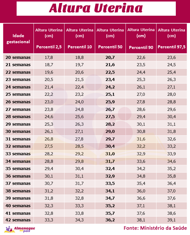 Altura Uterina Altura Uterina Altura Uterina Altura Uterina Altura Uterina Altura Uterina Idade (cm) (cm) (cm) (cm) (cm) gestacional Percentil 2,5 Percentil 10 Percentil 50 Percentil 90 Percentil 97,5 20 semanas 17,8 18,8 20,7 22,6 23,6 21 semanas 18,7 19,7 21,6 23,5 24,5 22 semanas 19,6 20,6 22,5 24,4 25,4 23 semanas 20,5 21,5 23,4 25,3 26,3 24 semanas 21,4 22,4 24,2 26,1 27,1 25 semanas 22,2 23,2 25,1 27,0 28,0 26 semanas 23,0 24,0 25,9 27,8 28,8 27 semanas 23,8 24,8 26,7 28,6 29,6 28 semanas 24,6 25,6 27,5 29,4 30,4 29 semanas 25,3 26,3 28,2 30,1 31,1 30 semanas 26,1 27,1 29,0 30,8 31,8 31 semanas 26,8 27,8 29,7 31,6 32,6 32 semanas 27,5 28,5 30,4 32,2 33,2 33 semanas 28,2 29,2 31,0 32,9 33,9 34 semanas 28,8 29,8 31,7 33,6 34,6 35 semanas 29,4 30,4 32,4 34,2 35,2 36 semanas 30,1 31,1 32,9 34,8 35,8 37 semanas 30,7 31,7 33,5 35,4 36,4 38 semanas 31,2 32,2 34,1 36,0 37,0 39 semanas 31,8 32,8 34,7 36,6 37,6 40 semanas 32,3 33,3 35,2 37,1 38,1 41 semanas 32,8 33,8 35,7 37,6 38,6 42 semanas 33,3 34,3 36,2 38,1 39,1 Almanaque Fonte: Ministério da Saúde
