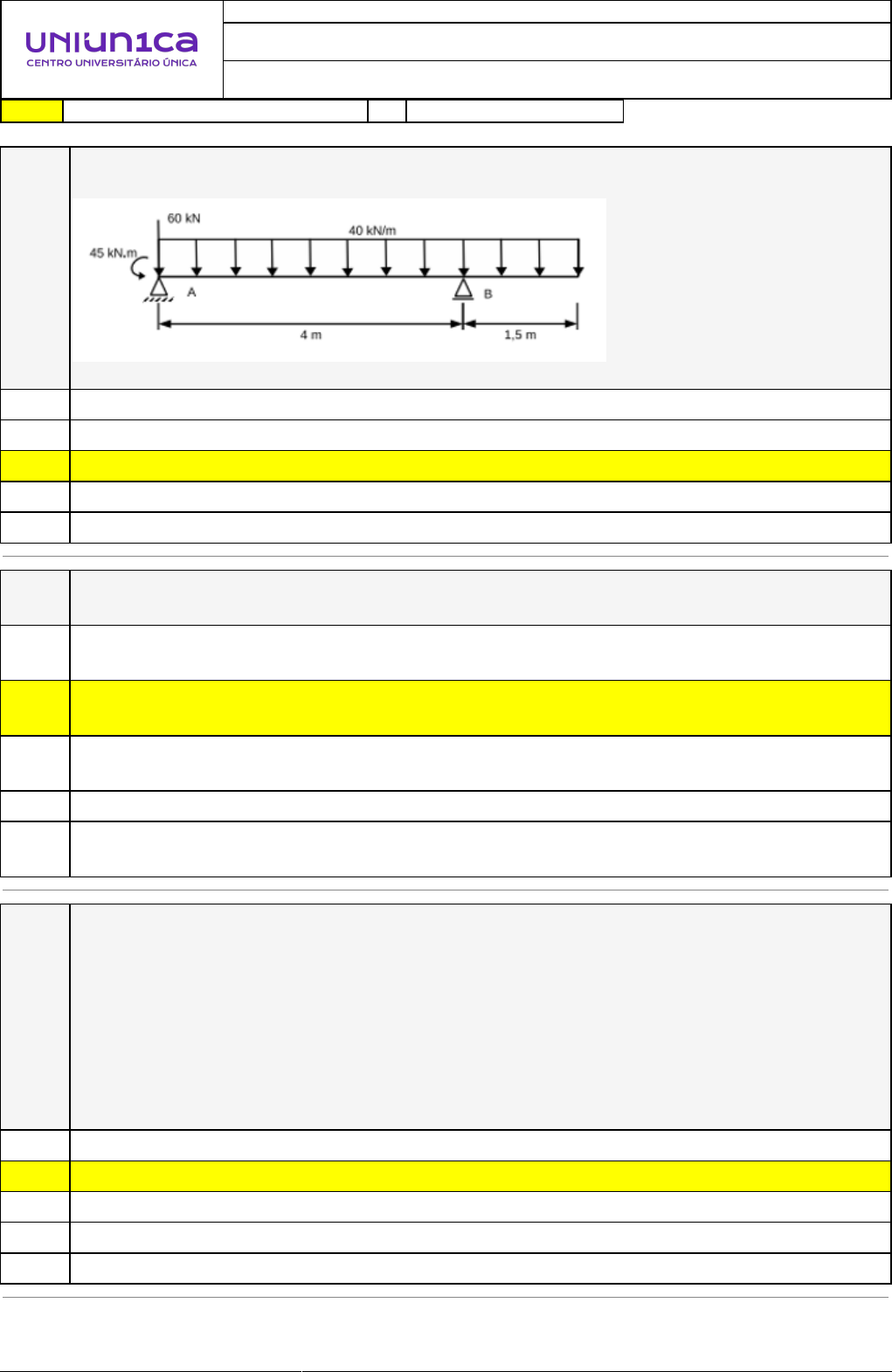 26/11/2024 19:36:25 1/3 REVISÃO DE SIMULADO Nome: PAULO SERGIO DOS SANTOS SUBTIL Disciplina: Sistemas Estruturais I Respostas corretas são marcadas em amarelo X Respostas marcardas por você. Questão 001 (UFMG – Apostila de Exercícios) Para a viga indicada abaixo, calcule as reações de apoio: Assinale a alternativa correta: A) HA: 0; RA: 80 kN; RB:80 kN. X B) HA: 10; RA: 140 kN; RB:140 kN. C) HA: 0; RA: 140 kN; RB:140 kN. D) HA: 0; RA: 100 kN; RB:140 kN. E) HA: 0; RA: 120 kN; RB:140 kN. Questão 002 (Adaptado de FUNDEP, 2019) Com relação aos tipos de estrutura e seus componentes, assinale a alternativa incorreta. A) A capacidade de uma coluna esbelta depende da contenção fornecida em suas extremidades. X B) Cabos não têm nenhuma rigidez à flexão, só podem transmitir força de compressão direta. C) Quando uma viga é carregada perpendicularmente ao seu eixo longitudinal, cortante e momento desenvolvem-se para transmitir as cargas aplicadas para os apoios. D) Os arcos são estruturas que suportam apenas compressão axial. E) Se treliças de nós articulados são carregadas apenas nos nós, desenvolve-se um carregamento axial em todas as barras. Questão 003 Sobre elementos estruturais: I. Os tirantes, conhecidos como cabos de suspensão ou barras de contraventamento, são elementos alongados sujeitos às forças axiais de tração. II. As vigas são componentes lineares sujeitas a cargas perpendiculares ao seu eixo longitudinal, provocando deformações suaves no elemento estrutural. III. Os cabos são estruturas flexíveis que suportam forças axiais de tração. IV. Os pórticos, também conhecidos como vigas-pilares, são estruturas sólidas formadas pela interação entre vigas e pilares. Assinale a alternativa CORRETA: A) As afirmativas II, III e IV estão corretas. X B) As afirmativas I e II estão corretas. C) As afirmativas III e IV estão corretas. D) Todas as afirmativas estão corretas. E) As afirmativas I, II e III estão corretas. 26/11/2024 19:36:25 2/3 Questão 004 (ELABORADO PELO AUTOR, 2023): Apoios são dispositivos que ligam pontos do sistema material a outros sistemas, impedindo determinados movimentos destes pontos ou do sistema como um todo. Analise as figuras a seguir e classifique os apoios apresentados. A) Rótula (do primeiro gênero); Engaste (ou apoio do terceiro gênero) e Apoio simples (do segundo gênero). B) Rótula (do segundo gênero); Engaste (ou apoio do terceiro gênero) e Apoio simples (do primeiro gênero). C) Apoio simples (do primeiro gênero); Engaste (ou apoio do terceiro gênero) e Rótula (apoio de segundo gênero ou articulação). D) Engaste (ou apoio do segundo gênero); Apoio simples (apoio do terceiro gênero) e Rótula (do primeiro gênero). X E) Apoio simples (apoio de segundo gênero ou articulação); Engaste (ou apoio do terceiro gênero) e Rótula (do primeiro gênero). Questão 005 Trechos é um segmento de barra delimitado pela seção transversal. Marque a alternativa em que está correta a condição a ser atendida. X A) Insere-se duas novas barras ou mais, ou uma articulação, dentre outros. B) Introduz-se uma carga distribuída. C) Todas as alternativas estão corretas. D) A equação que rege a posição do eixo da barra é alterada. E) Mantém um carregamento distribuído. Questão 006 (UFMG – Apostila de Exercícios) Para a viga da figura abaixo, que é uma estrutura hiperestática, foi informado o valor da reação nos apoios A e B. Calcule as demais reações de apoio: A) MC: 30 kN e RC: 30 kN. B) MC: 15 kN e RC: 45 kN. C) MC: 10 kN e RC: 50 kN. D) MC: 60 kN e RC: 0. 26/11/2024 19:36:25 3/3 X E) MC: 0 e RC: 60 kN. Questão 007 (ELABORADO PELO AUTOR, 2023): Elemento estrutural é cada uma das partes nas quais pode ser dividida uma estrutura para efeitos de seu projeto. Lajes, pilares, fundações e vigas são os principais elementos estruturais de uma construção. Avalie as assertivas dispostas a seguir, em relação aos esforços internos em estruturas isostáticas, indicando a opção correta. X A) Grelhas: Também conhecidos como vigas-pilares, são estruturas sólidas formadas pela interação entre vigas e pilares. B) Treliças: consistem de pilares e vigas, de diferentes tamanhos e combinados para formar pórticos. C) Vigas: é um elemento estrutural sujeito a cargas transversais. D) Cabos: estruturas reticuladas, ou seja, formadas por barras (em que uma direção é predominante) de eixo reto, ligadas por rótulas ou articulações (nós). E) Pórtico: é uma associação de vigas simples, entrelaçadas entre si, extremamente flexíveis, capazes de resistir a esforços de tração. Questão 008 De acordo com as figuras abaixo, marque a alternativa que corresponde ao número de restrições: A) 1, 2 e 3. X B) 2, 1 e 3. C) 2, 1 e 0. D) 1, 1 e 3. E) 3, 2 e 1.