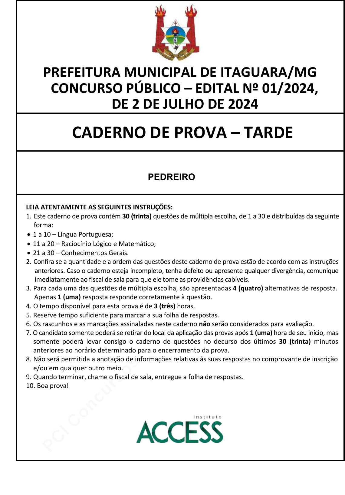 pcimarkpci MjgwNDowMDE4OjA4NjE6MjcyZDo1MGQ1OmFjNDc6MDk2ZDozODU1:V2VkLCAyNyBOb3YgMjAyNCAxODoxMjo0NSAtMDMwMA== www.pciconcursos.com.br PREFEITURA MUNICIPAL DE ITAGUARA/MG CONCURSO PÚBLICO – EDITAL Nº 01/2024, DE 2 DE JULHO DE 2024 CADERNO DE PROVA – TARDE LEIA ATENTAMENTE AS SEGUINTES INSTRUÇÕES: 1. Este caderno de prova contém 30 (trinta) questões de múltipla escolha, de 1 a 30 e distribuídas da seguinte forma: • 1 a 10 – Língua Portuguesa; • 11 a 20 – Raciocínio Lógico e Matemático; • 21 a 30 – Conhecimentos Gerais. 2. Confira se a quantidade e a ordem das questões deste caderno de prova estão de acordo com as instruções anteriores. Caso o caderno esteja incompleto, tenha defeito ou apresente qualquer divergência, comunique imediatamente ao fiscal de sala para que ele tome as providências cabíveis. 3. Para cada uma das questões de múltipla escolha, são apresentadas 4 (quatro) alternativas de resposta. Apenas 1 (uma) resposta responde corretamente à questão. 4. O tempo disponível para esta prova é de 3 (três) horas. 5. Reserve tempo suficiente para marcar a sua folha de respostas. 6. Os rascunhos e as marcações assinaladas neste caderno não serão considerados para avaliação. 7. O candidato somente poderá se retirar do local da aplicação das provas após 1 (uma) hora de seu início, mas somente poderá levar consigo o caderno de questões no decurso dos últimos 30 (trinta) minutos anteriores ao horário determinado para o encerramento da prova. 8. Não será permitida a anotação de informações relativas às suas respostas no comprovante de inscrição e/ou em qualquer outro meio. 9. Quando terminar, chame o fiscal de sala, entregue a folha de respostas. 10. Boa prova! PEDREIRO pcimarkpci MjgwNDowMDE4OjA4NjE6MjcyZDo1MGQ1OmFjNDc6MDk2ZDozODU1:V2VkLCAyNyBOb3YgMjAyNCAxODoxMjo0NSAtMDMwMA== www.pciconcursos.com.br pcimarkpci MjgwNDowMDE4OjA4NjE6MjcyZDo1MGQ1OmFjNDc6MDk2ZDozODU1:V2VkLCAyNyBOb3YgMjAyNCAxODoxMjo0NSAtMDMwMA== www.pciconcursos.com.br LÍNGUA PORTUGUESA O texto seguinte servirá de base para responder às questões de 1 a 7. Mortes por câncer já ocupam primeiro lugar em algumas regiões do Brasil O câncer já é a primeira causa de morte em algumas regiões do Brasil, ocupando o lugar das doenças cardiovasculares. Um estudo inédito revela uma transição epidemiológica no país, tendência que já vem sendo observada em nações ricas. O trabalho, conduzido por pesquisadores da Universidade Federal de São Paulo (Unifesp) e outras instituições, como Fundação Getúlio Vargas e Universidade Federal de Uberlândia, em Minas Gerais, acaba de ser publicado no The Lancet Regional Health − Americas. Para chegar ao resultado, os autores analisaram dados de 5.570 municípios brasileiros fornecidos pelo Sistema de Informações de Mortalidade (SIM) entre os anos de 2000 e 2019. Também foram avaliadas as mortes prematuras, aquelas que ocorrem na faixa dos 30 aos 69 anos, que não são atribuídas ao envelhecimento. Nesse período, as taxas de mortalidade por doenças cardiovasculares caíram em 25 dos 27 estados, enquanto as de câncer cresceram em 15. O número de municípios em que o câncer é a principal causa de morte quase dobrou, passando de 7% para 13%. E, enquanto a mortalidade por problemas cardiovasculares caiu drasticamente, quase 40%, a de câncer reduziu apenas 10%. Embora as doenças cardiovasculares ainda liderem as mortes, alguns fatores explicam essa transição. "Os avanços no diagnóstico e no tratamento, bem como as campanhas antitabagismo, por exemplo, tiveram grande impacto na queda da mortalidade cardiovascular. O câncer, por outro lado, engloba mais de cem doenças com diferentes causas e alguns são mais fáceis de prevenir, outros mais limitados", analisa Leandro Rezende, um dos autores do estudo e coordenador do programa de pós-graduação em Saúde Coletiva da Escola Paulista de Medicina, da Unifesp. Já as doenças cardiovasculares, segundo Rezende, são mais sensíveis a hábitos e medidas terapêuticas. "O resultado mostra que, quanto maior o acesso a tratamento e prevenção, menor a mortalidade", observa o pesquisador. Apesar de o câncer e as doenças cardiovasculares compartilharem muitos fatores de risco — como tabagismo, sedentarismo, obesidade e má alimentação —, as particularidades de cada tipo de tumor dificultam a prevenção e o tratamento. Além disso, enquanto o tratamento das doenças cardiovasculares sempre envolve mudanças no estilo de vida, no câncer o foco acaba sendo erradicar a doença de forma localizada. Assim, é possível reduzir as mortes por infartos e derrames cuidando da pressão alta, do colesterol alto e do diabetes, por exemplo, mas o prognóstico dos tumores acaba prejudicado com diagnósticos tardios e dificuldade de acesso a tratamentos sofisticados. Para os autores do novo estudo, é preciso desenvolver políticas específicas para cada região, capazes de melhorar o acesso à saúde nos municípios menores e mais vulneráveis e, éclaro, atuar na prevenção primária. "Isso envolve políticas públicas, incluindo campanhas antitabaco, controle do álcool e o grande desafio da obesidade, que é um fator de risco para vários tumores. Sabe-se que o estilo de vida está associado a cerca de 20 tipos de câncer, e um terço das mortes poderia ser evitado com mudanças nos hábitos de vida", destaca Rezende. https://www.cnnbrasil.com.br/saude/mortes-por-cancer-ja-ocupam-prim eiro-lugar-em-algumas-regioes-do-brasil/ Questão 01 De acordo com o texto, qual é a relação entre o acesso a tratamento e prevenção e a mortalidade por doenças cardiovasculares? (A) O acesso a tratamentos e prevenção não influencia na mortalidade por doenças cardiovasculares. (B) A mortalidade por doenças cardiovasculares é independente de fatores de risco como tabagismo e sedentarismo. (C) Quanto maior o acesso a tratamento e prevenção, maior a mortalidade por doença