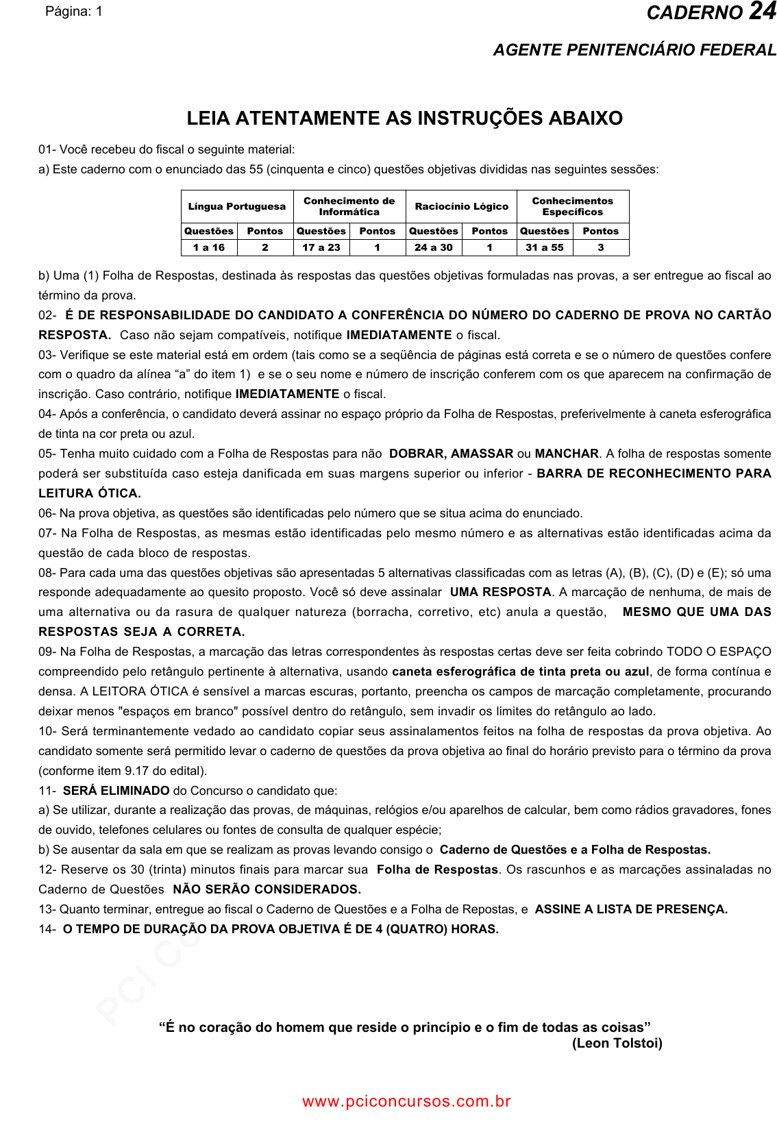 pcimarkpci MjgwNDowMDE4OjA4NjE6MjcyZDo1MGQ1OmFjNDc6MDk2ZDozODU1:V2VkLCAyNyBOb3YgMjAyNCAxOTo0MzowMyAtMDMwMA== www.pciconcursos.com.br Página: 1 AGENTE PENITENCIÁRIO FEDERAL CADERNO 24 LEIA ATENTAMENTE AS INSTRUÇÕES ABAIXO 01- Você recebeu do fiscal o seguinte material: a) Este caderno com o enunciado das 55 (cinquenta e cinco) questões objetivas divididas nas seguintes sessões: b) Uma (1) Folha de Respostas, destinada às respostas das questões objetivas formuladas nas provas, a ser entregue ao fiscal ao término da prova. 02- É DE RESPONSABILIDADE DO CANDIDATO A CONFERÊNCIA DO NÚMERO DO CADERNO DE PROVA NO CARTÃO RESPOSTA. Caso não sejam compatíveis, notifique IMEDIATAMENTE o fiscal. 03- Verifique se este material está em ordem (tais como se a seqüência de páginas está correta e se o número de questões confere com o quadro da alínea “a” do item 1) e se o seu nome e número de inscrição conferem com os que aparecem na confirmação de inscrição. Caso contrário, notifique IMEDIATAMENTE o fiscal. 04- Após a conferência, o candidato deverá assinar no espaço próprio da Folha de Respostas, preferivelmente à caneta esferográfica de tinta na cor preta ou azul. 05- Tenha muito cuidado com a Folha de Respostas para não DOBRAR, AMASSAR ou MANCHAR. A folha de respostas somente poderá ser substituída caso esteja danificada em suas margens superior ou inferior - BARRA DE RECONHECIMENTO PARA LEITURA ÓTICA. 06- Na prova objetiva, as questões são identificadas pelo número que se situa acima do enunciado. 07- Na Folha de Respostas, as mesmas estão identificadas pelo mesmo número e as alternativas estão identificadas acima da questão de cada bloco de respostas. 08- Para cada uma das questões objetivas são apresentadas 5 alternativas classificadas com as letras (A), (B), (C), (D) e (E); só uma responde adequadamente ao quesito proposto. Você só deve assinalar UMA RESPOSTA. A marcação de nenhuma, de mais de uma alternativa ou da rasura de qualquer natureza (borracha, corretivo, etc) anula a questão, MESMO QUE UMA DAS RESPOSTAS SEJA A CORRETA. 09- Na Folha de Respostas, a marcação das letras correspondentes às respostas certas deve ser feita cobrindo TODO O ESPAÇO compreendido pelo retângulo pertinente à alternativa, usando caneta esferográfica de tinta preta ou azul, de forma contínua e densa. A LEITORA ÓTICA é sensível a marcas escuras, portanto, preencha os campos de marcação completamente, procurando deixar menos "espaços em branco" possível dentro do retângulo, sem invadir os limites do retângulo ao lado. 10- Será terminantemente vedado ao candidato copiar seus assinalamentos feitos na folha de respostas da prova objetiva. Ao candidato somente será permitido levar o caderno de questões da prova objetiva ao final do horário previsto para o término da prova (conforme item 9.17 do edital). 11- SERÁ ELIMINADO do Concurso o candidato que: a) Se utilizar, durante a realização das provas, de máquinas, relógios e/ou aparelhos de calcular, bem como rádios gravadores, fones de ouvido, telefones celulares ou fontes de consulta de qualquer espécie; b) Se ausentar da sala em que se realizam as provas levando consigo o Caderno de Questões e a Folha de Respostas. 12- Reserve os 30 (trinta) minutos finais para marcar sua Folha de Respostas. Os rascunhos e as marcações assinaladas no Caderno de Questões NÃO SERÃO CONSIDERADOS. 13- Quanto terminar, entregue ao fiscal o Caderno de Questões e a Folha de Repostas, e ASSINE A LISTA DE PRESENÇA. 14- O TEMPO DE DURAÇÃO DA PROVA OBJETIVA É DE 4 (QUATRO) HORAS. Língua Portuguesa Questões Pontos 21 a 16 Conhecimento de Informática Questões Pontos 117 a 23 Raciocínio Lógico Questões Pontos 124 a 30 Conhecimentos Específicos Pontos 331 a 55 “É no coração do homem que reside o princípio e o fim de todas as coisas” (Leon Tolstoi) Questões www.pciconcursos.com.br pcimarkpci MjgwNDowMDE4OjA4NjE6MjcyZDo1MGQ1OmFjNDc6MDk2ZDozODU1:V2VkLCAyNyBOb3YgMjAyNCAxOTo0MzowMyAtMDMwMA== www.pciconcursos.com.br Página: 2 AGENTE PENITENCIÁRIO FEDERAL CADERNO 24 * LÍNGUA PORTUGUESA * Questão 1 Qual a única série de palavras que contém dígrafos consonantais? A) através – problemas – crateras – caboclos. B) ternura – caspa – resultado – êxtase. C) tampas – ventania – sintoma – fundação. D) hálito – hélice – hino – humilde. E) farrista – aquecido – exceto – milharal. Questão 2 “Senhoras e senhores, chamo ao palco neste momento o Professor Doutor Simão Bacamarte, ilustre Paraninfo das turmas concluintes do Ensino Médio de nosso querido Colégio”. A função textual das duas vírgulas dessa frase é separar, respectivamente, A) o sujeito e o predicativo. B) os substantivos e os adjetivos. C) o vocativo e o aposto. D) o verbo e o nome. E) o acessório e o enfático. Questão 3 Após a partida, o jogador confirmou na entrevista coletiva que ia abandonar o futebol, mas disse também que estava muito triste por se despedir de sua carreira de maneira tão melancólica. O redator dessa notícia transmitiu, com suas próprias palavras, a essência do depoimento do jogador, o que é uma técnica redacional chamada de A) discurso indireto. B) referência livre. C) ponto de vista. D) discurso direto. E) ponto de referência. Questão 4 Para esse trabalho, você precisará utilizar uma caneta, uma prancheta e um bloco de papel em que fará as anotações diárias. Todo esse material será fornecido pela empresa contratante. A informação acima usa o hiperônimo “material” para A) englobar os hipônimos “caneta”, “prancheta” e “bloco de papel”. B) substituir os sinônimos “caneta”, “prancheta” e “bloco de papel”. C) evitar a ambiguidade de “caneta”, “prancheta” e “bloco de papel”. D) desfazer a polissemia de “caneta”, “prancheta” e “bloco de papel”. E) ampliar a conotatividade de “caneta”, “prancheta