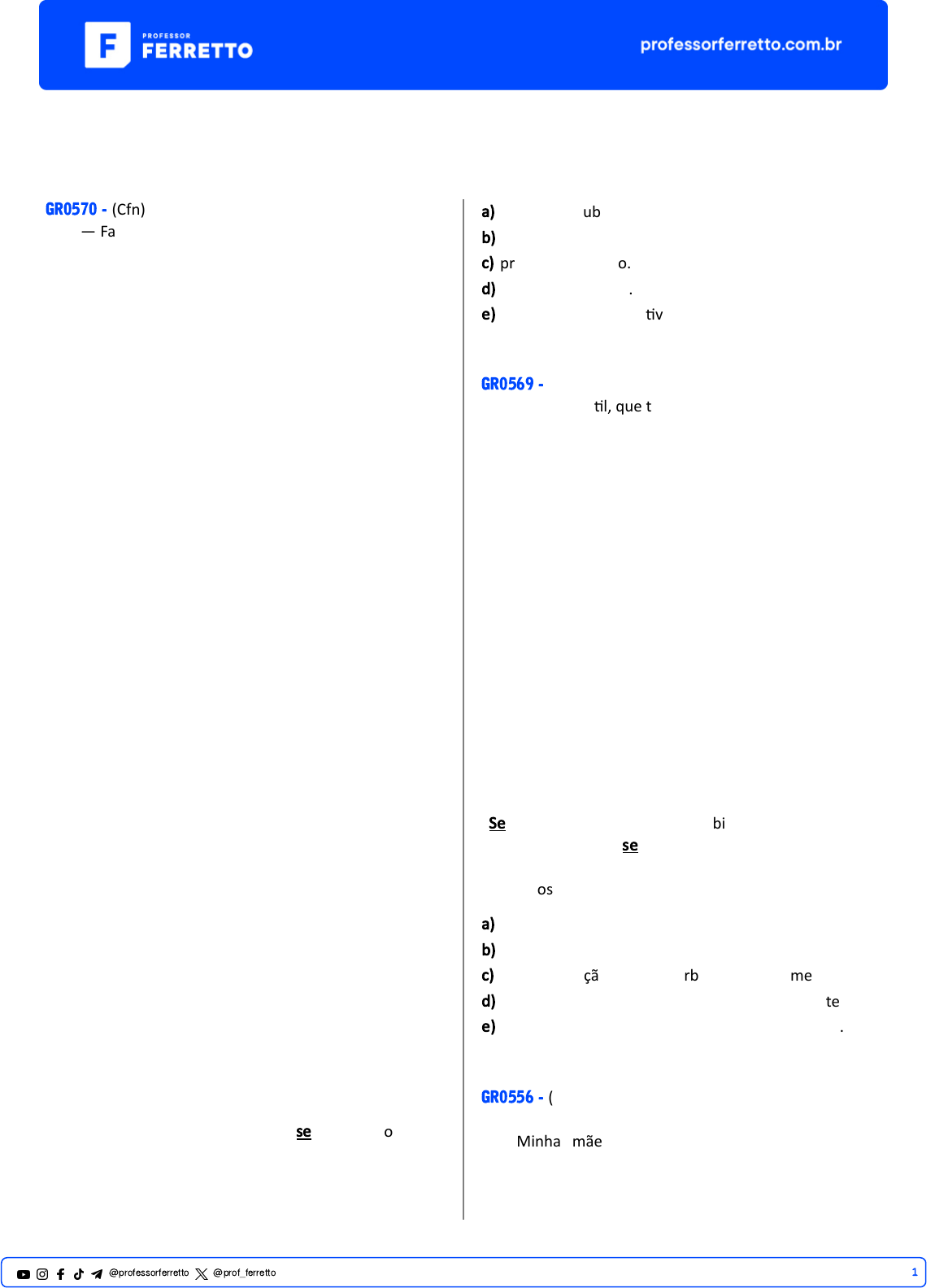Funções do Que e do Se GR0570 - (Cfn) — Falar português não é di�cil — me diz um francês residente no Brasil —, o diabo é que, mal consigo aprender, a língua portuguesa já ficou diferente. Está sempre mudando. (1) E como! No Brasil as palavras envelhecem e caem como folhas secas (8). Ainda bem a gente não conseguiu aprender uma nova expressão, já vem o pessoal com outra. Não é somente pela gíria que a gente é apanhado. (Aliás, já não se usa mais a primeira pessoa, tanto do singular como do plural: tudo é "a gente".) A própria linguagem corrente vai se renovando (7), e a cada dia uma parte do léxico cai em desuso. É preciso ficar atento, para não con�nuar usando palavras que já morreram, vocabulário de velho que só velho entende. (10) Os que falariam ainda em cinematógrafo, auto- ônibus, (3) aeroplano, estes também já morreram e não sabem. Mas uma amiga minha, que vive preocupada com este assunto, me chama a atenção para os que falam assim: — Assis� a uma fita de cinema com um ar�sta que representa muito bem. (6) Os que acharem natural esta frase, cuidado! Não saberão dizer que viram um filme com um ator que trabalha bem. E irão ao banho de mar em vez de ir à praia (9), ves�dos de roupa de banho em vez de calção ou biquíni, carregando guarda-sol em vez de barraca. Comprarão um automóvel em vez de comprar um carro (4), pegarão um defluxo em vez de um resfriado, vão andar no passeio em vez de passear na calçada e percorrer um quarteirão em vez de uma quadra. Viajarão de trem de ferro acompanhados de sua esposa ou sua senhora em vez de sua mulher. (2) A lista poderia ser enorme, mas vou ficando por aqui, pois entre escrever e publicar há tempo suficiente para que tudo que eu disser caia em desuso — é dito e feito. (5) SABINO, Fernando. Folha de S. Paulo, São Paulo, 1984. Adaptado Considere a frase abaixo re�rada do texto: “A própria linguagem corrente vai se renovando (...)” – (ref. 7). O termo em destaque pode ser classificado como a) conjunção subordina�va condicional. b) substan�vo. c) pronome reflexivo. d) par�cula exple�va. e) conjunção subordina�va integrante. GR0569 - (Unesp) Alma minha gen�l, que te par�ste tão cedo desta vida descontente, repousa lá no Céu eternamente, e viva eu cá na terra sempre triste. Se lá no assento etéreo, onde subiste, memória desta vida se consente, não te esqueças daquele amor ardente que já nos olhos meus tão puro viste. E se vires que pode merecer-te alguma coisa a dor que me ficou da mágoa, sem remédio, de perder-te, roga a Deus, que teus anos encurtou, que tão cedo de cá me leve a ver-te, quão cedo de meus olhos te levou. Sonetos, 2001. “Se lá no assento etéreo, onde subiste, memória desta vida se consente,” (2ª estrofe) Os termos destacados cons�tuem a) Pronomes. b) Conjunções. c) Uma conjunção e um advérbio, respec�vamente. d) Um pronome e uma conjunção, respec�vamente. e) Uma conjunção e um pronome, respec�vamente. GR0556 - (Esc. Naval) Precisamos falar sobre fake news Minha mãe tem 74 anos e, como milhões de pessoas no mundo, faz uso frequente do celular. É com ele que, conversando por voz ou por vídeo, diariamente, vence a distância e a saudade dos netos e netas. 1@professorferretto @prof_ferretto Mas, para ela, assim como para milhares e milhares de pessoas, o celular pode ser também uma fonte de engano. De vez em quando, por acreditar no que chega por meio de amigos no seu WhatsApp, me envia uma ou outra mensagem contendo uma fake news. A úl�ma foi sobre um suposto problema com a vacina da gripe que, por um momento, diferente de anos anteriores, a fez desis�r de se vacinar. Eu e minha mãe, como boa parte dos brasileiros, não nascemos na era digital. Nesta sociedade somos os chamados migrantes e, como tais, a tecnologia nos gera um certo estranhamento (e até constrangimento), embora nos fascine e facilite a vida. Sejamos sinceros. Nada nem ninguém nos preparou para essas mudanças que revolucionaram a comunicação. Pior: é di�cil destrinchar o que é verdade em tempo de fake news. Um dos maiores estudos sobre a disseminação de no�cias falsas na internet, publicado ano passado na revista Science foi realizado pelo Ins�tuto de Tecnologia de Massachuse�s (MIT, na sigla em inglês), dos Estados Unidos, e concluiu que as no�cias falsas se espalham 70% mais rápido que as verdadeiras e alcançam muito mais gente. Isso porque as fake news se valem de textos alarmistas, polêmicos, sensacionalistas, com destaque para no�cias atreladas a temas de saúde, seguidas de informações men�rosas sobre tudo. Até pouco tempo atrás, a imprensa era a detentora do que chamamos de produção de no�cias. E os fatos obedeciam a critérios de apuração e checagem. O problema é que hoje mantemos essa mesma crença, quase que religiosa, junto a mensagens das quais não iden�ficamos sequer a origem, boa parte delas disseminada em redes sociais. Confia-se a ponto de compar�lhar, sem ques�onar. O impacto disso é preocupante. Par�ndo de pesquisas que mostram que no�cias e seus enquadramentos influenciam opiniões e constroem leituras da realidade, a disseminação das no�cias falsas tem criado versões alterna�vas do mundo, da História, das Ciências “ao gosto do cliente”, como dizem por aí. Os problemas gerados estão em todos os campos. No âmbito familiar, por exemplo, vai de pais que deixam de vacinar seus filhos a ponto de criar um grave problema de saúde pública de impacto mundial. E passa por jovens ví�mas de violência virtual e �sica. No mundo corpora�vo, estabelecimentos comerciais fecham portas, profissionais perdem suas reputações e produtos são desacreditados como resultado de uma foto descontextualizada, uma imagem alterada ou uma legenda falsa. A democracia também se fragiliza. O processo democrá�co corre o risco de ter sua força e credibilidade af