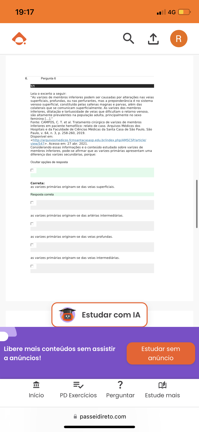 19:17 4G Q1R 6. Pergunta 6 1/1 Leia excerto a seguir: "As varizes de membros inferiores podem ser causadas por alterações nas veias superficiais, profundas, ou nas perfurantes, mas a preponderância é no sistema venoso superficial, constituído pelas safenas magnas e parvas, além das colaterais que se comunicam superficialmente. As varizes dos membros inferiores, dilatação e tortuosidade de veias que dificultam o retorno venoso, são altamente prevalentes na população principalmente no sexo feminino [...]." Fonte: C.T. et al. Tratamento cirúrgico de varizes de membros inferiores em paciente hemofílico: relato de Arquivos Médicos dos Hospitais e da Faculdade de Ciências Médicas da Santa Casa de São Paulo, São Paulo, 64, n. 3, p. 258-260, 2019. Disponível em: Acesso em: 27 abr. 2021. Considerando essas informações e o conteúdo estudado sobre varizes de membros inferiores, pode-se afirmar que as varizes primárias apresentam uma diferença das varizes secundárias, porque: Ocultar opções de resposta Correta: as varizes primárias originam-se das veias Resposta correta as varizes primárias originam-se das artérias as varizes primárias originam-se das veias profundas. as varizes primárias originam-se das veias Estudar com IA Libere mais conteúdos sem assistir Estudar sem a anúncios! anúncio ? Início PD Exercícios Perguntar Estude mais passeidireto.com