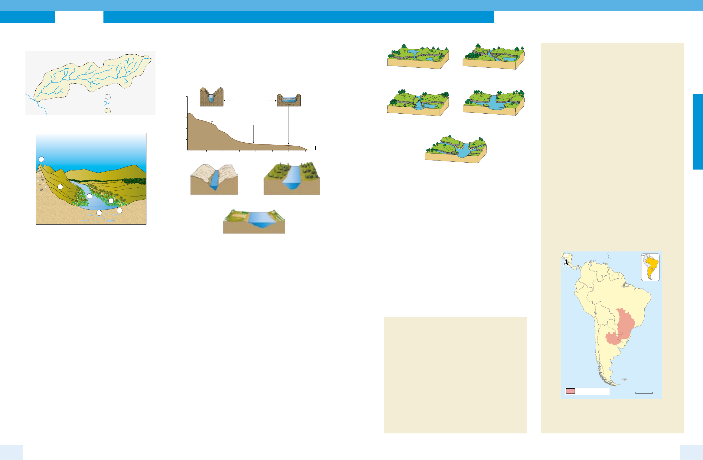 Bacia Hidrográfica Interflúvio Bacia hidrográfica Rede hidrográfica Perfil transversal de um vale fluvial 3 5 6 4 1 2 1 – Curso-d’água; 2 – Vereda; 3 – Leito; 4 – Encostas; 5 – Interflúvio; 6 – Talvegue. Quanto ao escoamento das águas fluviais, os tipos de drenagem podem ser: exorreico – a drenagem conduz diretamente para o mar; endorreico – a drenagem conduz para dentro do continente (outros rios, lagos, ou mares interiores); arreico – que aparece em áreas áridas nas quais a precipitação é baixa e os canais de drenagem não apresentam estruturações; e criptorreico – quando ocorrem rios subterrâneos, como nas áreas cársticas. O fluxo da água de um rio pode ser laminar ou turbulento. O fluxo é laminar quando escoa ao longo de um canal reto, suave e de baixa velocidade. Já o fluxo turbulento caracteriza-se por uma velocidade maior e movimentos caóticos, com muitas correntes secundárias contrárias ao fluxo principal. O caráter mais ou menos turbulento influencia diretamente o grau de erosão e o transporte de partículas de um rio. O alto curso corresponde ao trecho do rio próximo à nascente, situado geralmente em regiões de maior altitude e cuja topografia é mais acidentada. Nesse trecho, as águas apresentam maior velocidade de escoamento e predomínio do processo erosivo. No médio curso, coexistem processos de sedimentação e de erosão. O baixo curso corresponde ao trecho localizado próximo à foz, em áreas de menor altitude e de topografia geralmente mais plana. A rq ui vo B er no ul li A rq ui vo B er no ul li Nessas áreas, a velocidade de escoamento das águas é menor e há predomínio do processo de sedimentação. Em trechos de planície, muitas vezes, em função da baixa velocidade das águas fluviais, os rios podem formar meandros, ou seja, curvas. Altitude (metros) 2 500 2 000 1 500 1 000 500 0 700 600 500 400 300 200 100 0 Curso superior Curso médio Curso inferior Nível do mar Perfis transversais Perfil longitudinal 2 500 2 000 1 500 1 000 500 0 700 600 500 400 300 200 100 0 km Curso superior Curso médio Curso inferior ou final Hidrografia e relevo O curso de um rio, desde a nascente até o momento em que sua água se mistura com a água do mar, pode ser dividido em três fases: juventude, maturidade e velhice. Na fase inicial ou de juventude, no curso superior, os rios correm geralmente entre montanhas, o declive dos terrenos é acentuado e a força das águas é muito significativa. Assim, o desgaste na vertical é acentuado, e os vales apresentam vertentes abruptas: são os vales em V fechados. Nessa fase, podem surgir cataratas e corredeiras. Já na fase de maturidade, no curso médio, o declive do terreno já não é tão acentuado, e o desgaste faz-se na horizontal, alargando o leito do rio e formando vales mais abertos: são os vales em V abertos. Por fim, na fase de velhice, no curso inferior, o rio perde velocidade, há a deposição dos materiais (aluviões) que o rio transportou durante o seu percurso e formam-se vales de fundo largo e plano. Essas fases não sugerem relação alguma com a idade do rio nem com a do relevo, mas apenas com o tipo de processo (erosivo, deposicional ou de transporte) predominante em cada trecho do curso-d’água, visto que tais processos ocorrem, na maioria das vezes, simultaneamente. Deve-se ressaltar também que tais fases são passíveis de mudanças, que podem estar relacionadas a alterações climáticas e / ou tectônicas. Observe os blocos-diagramas a seguir. A rq ui vo B er no ul li E BA C D Inicialmente, o curso de água instala-se numa superfície recentemente formada, aproveitando os desníveis do relevo (A). Gradualmente, escava-se um vale mais fundo e abrem-se novos vales (B). Começa a se formar uma planície aluvial, devido à acumulação de sedimentos – materiais transportados pelo rio e resultantes do desgaste a montante (C). A continuação desse processo origina a formação de planícies aluviais nos vales de alguns afluentes, o alargamento da planície principal e a formação de meandros – curvas no leito do rio formadas pela maior acumulação de sedimentos na margem, onde a corrente tem menor velocidade (D). Ao aprofundar o seu leito, em várias fases de escavação, o rio esculpe o relevo, podendo até mesmo deixar evidências do trabalho erosivo em suas margens – como nos terraços aluviais (E). A rq ui vo B er no ul li É encontrado desde a superfície na cidade de Ribeirão Preto (SP) até a profundidade de 1 800 metros na região do Pontal do Paranapanema. A população atual na área de ocorrência do Aquífero está estimada em aproximadamente 29,9 milhões de habitantes. Os aspectos relevantes relativos ao Aquífero Guarani são: a sua extensão e volume; a sua transnacionalidade parcial (envolvendo os quatro países do Mercosul); o enorme potencial de suas águas para o abastecimento público e principalmente o seu uso termal (com múltiplas aplicações, gerando desenvolvimento socioeconômico); a falta de cultura de utilização de águas subterrâneas, o que gera o consequente uso restrito com relação ao seu potencial em volume e nas aplicações geotermais; a preocupação com a possibilidade da superexploração do recurso (determinando possíveis contaminações e a degradação deste); e a sua importância ambiental nas áreas de afloramento. Formação geológica O Aquífero Guarani é constituído de várias rochas predominantemente arenosas, que foram sedimentadas em ambientes flúvio-lacustres e eólicos do Triássico e do Jurássico. Os estratos do Triássico encontram-se na base do Aquífero e correspondem às unidades correlatas às formações Piramboia e Rosário do Sul, no Brasil, e Buena Vista, no Uruguai. Os estratos do Jurássico encontram-se no topo do Aquífero e correspondem às unidades correlatas da formação Botucatu (no Brasil), Misiones (no Paraguai) e Tacuarembó (no Uruguai e na Argentina). Paraguai Argent