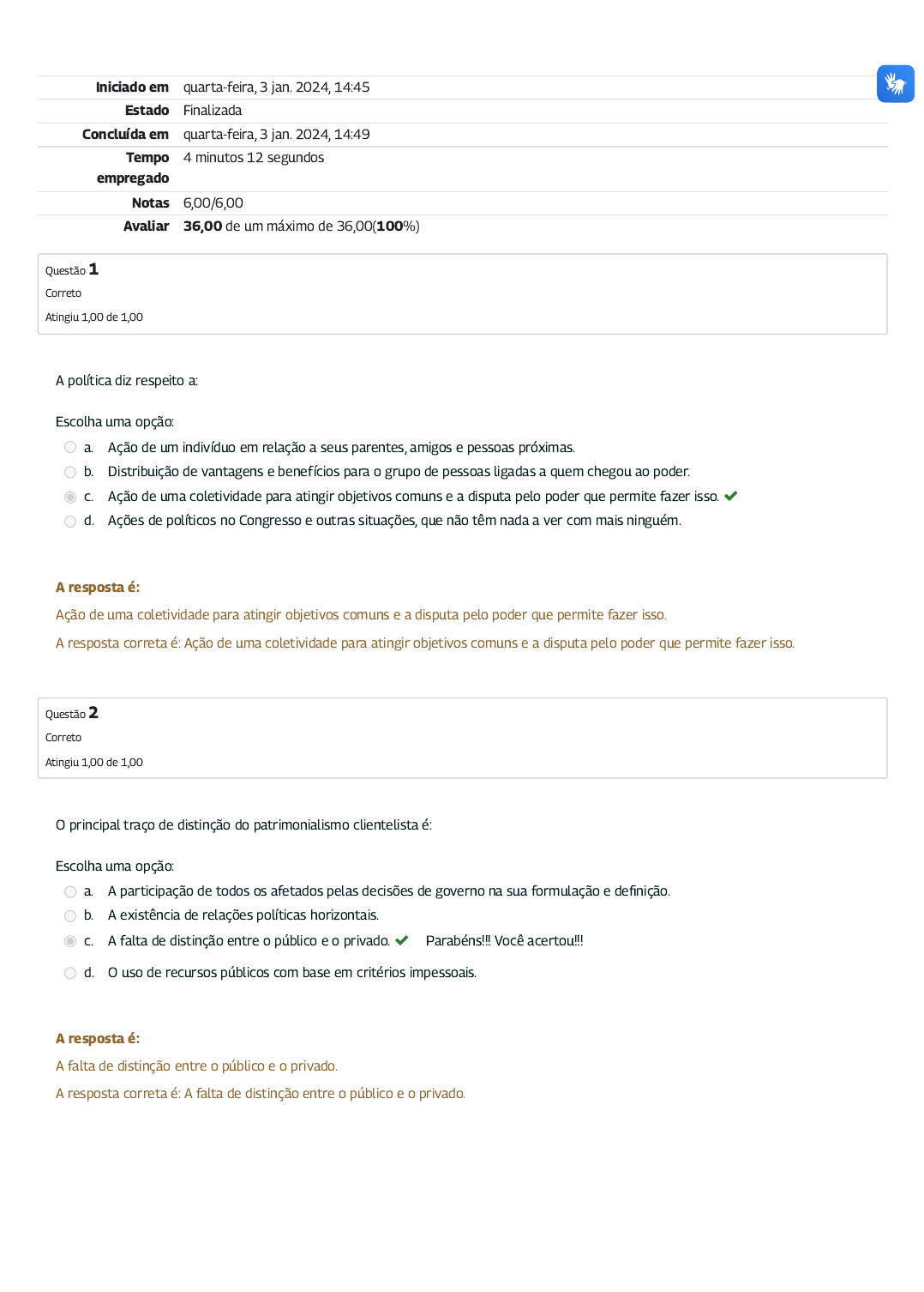 03/01/2024, 14:49 Exercício Avaliativo - Módulo 2: Revisão da tentativa https://mooc41.escolavirtual.gov.br/mod/quiz/review.php?attempt=1132646&cmid=22819 1/3 Iniciado em quarta-feira, 3 jan. 2024, 14:45 Estado Finalizada Concluída em quarta-feira, 3 jan. 2024, 14:49 Tempo empregado 4 minutos 12 segundos Notas 6,00/6,00 Avaliar 36,00 de um máximo de 36,00(100%) Questão 1 Correto Atingiu 1,00 de 1,00 Questão 2 Correto Atingiu 1,00 de 1,00 A política diz respeito a: Escolha uma opção: a. Ação de um indivíduo em relação a seus parentes, amigos e pessoas próximas. b. Distribuição de vantagens e benefícios para o grupo de pessoas ligadas a quem chegou ao poder. c. Ação de uma coletividade para atingir objetivos comuns e a disputa pelo poder que permite fazer isso. d. Ações de políticos no Congresso e outras situações, que não têm nada a ver com mais ninguém. A resposta é: Ação de uma coletividade para atingir objetivos comuns e a disputa pelo poder que permite fazer isso. A resposta correta é: Ação de uma coletividade para atingir objetivos comuns e a disputa pelo poder que permite fazer isso. O principal traço de distinção do patrimonialismo clientelista é: Escolha uma opção: a. A participação de todos os afetados pelas decisões de governo na sua formulação e de�nição. b. A existência de relações políticas horizontais. c. A falta de distinção entre o público e o privado. Parabéns!!! Você acertou!!! d. O uso de recursos públicos com base em critérios impessoais. A resposta é: A falta de distinção entre o público e o privado. A resposta correta é: A falta de distinção entre o público e o privado. 03/01/2024, 14:49 Exercício Avaliativo - Módulo 2: Revisão da tentativa https://mooc41.escolavirtual.gov.br/mod/quiz/review.php?attempt=1132646&cmid=22819 2/3 Questão 3 Correto Atingiu 1,00 de 1,00 Questão 4 Correto Atingiu 1,00 de 1,00 O conceito contemporâneo de cidadania inclui: Escolha uma opção: a. O usufruto de direitos civis, como a liberdade individual, o direito à propriedade, a liberdade de expressão, o direito de ir e vir, o direito à justiça. b. Direitos políticos como o de poder votar e ser votado, de eleições limpas, de ter acesso a informações sobre a administração do Estado. c. Direitos sociais, como educação pública de qualidade, serviços de saúde gratuitos, previdência e aposentadoria, renda mínima. d. Todas as alternativas anteriores. Parabéns!!! Você acertou!!! A resposta é: Todas as alternativas anteriores. A resposta correta é: Todas as alternativas anteriores. A democracia contemporânea corresponde a: Escolha uma opção: a. Eleição dos governantes por parte do cidadão, representação dos cidadãos por meio do voto para atuar em instituições legislativas, participação igualitária de todos os cidadãos capazes de deliberação e existência de condições para o exercício da cidadania. Parabéns!!! Você acertou!!! b. Tomada de decisões por um iluminado que sabe o que é bom para o povo. c. Controle do poder por um partido único, que representa o povo e fala em nome dele. d. Governo do povo de forma direta, com a participação de todos nas decisões em assembleias e escolha dos governantes por sorteio. A Resposta é: Eleição dos governantes por parte do cidadão, representação dos cidadãos por meio do voto para atuar em instituições legislativas, participação igualitária de todos os cidadãos capazes de deliberação e existência de condições para o exercício da cidadania. A resposta correta é: Eleição dos governantes por parte do cidadão, representação dos cidadãos por meio do voto para atuar em instituições legislativas, participação igualitária de todos os cidadãos capazes de deliberação e existência de condições para o exercício da cidadania. 03/01/2024, 14:49 Exercício Avaliativo - Módulo 2: Revisão da tentativa https://mooc41.escolavirtual.gov.br/mod/quiz/review.php?attempt=1132646&cmid=22819 3/3 Questão 5 Correto Atingiu 1,00 de 1,00 Questão 6 Correto Atingiu 1,00 de 1,00 O Estado diz respeito: Escolha uma opção: a. Ao governo de uma comunidade. b. À própria comunidade. c. Ao bem comum. d. A uma ordem jurídica e a uma estrutura administrativa territorialmente de�nida, que visa atender �nalidades dos cidadãos de uma coletividade. Parabéns!!! Você acertou!!! A resposta é: A uma ordem jurídica e a uma estrutura administrativa territorialmente de�nida, que visa atender �nalidades dos cidadãos de uma coletividade. A resposta correta é: A uma ordem jurídica e a uma estrutura administrativa territorialmente de�nida, que visa atender �nalidades dos cidadãos de uma coletividade. A prestação pública de contas ou accountability pode ser melhor de�nida como: Escolha uma opção: a. O orçamento do Estado. b. O conjunto das formas de controle e aperfeiçoamento dos serviços públicos pelos cidadãos. Parabéns!!! Você acertou!!! c. A divulgação das realizações do governo nos meios de comunicação. d. A �scalização do governo pelos partidos de oposição. A resposta é: O conjunto das formas de controle e aperfeiçoamento dos serviços públicos pelos cidadãos. A resposta correta é: O conjunto das formas de controle e aperfeiçoamento dos serviços públicos pelos cidadãos.