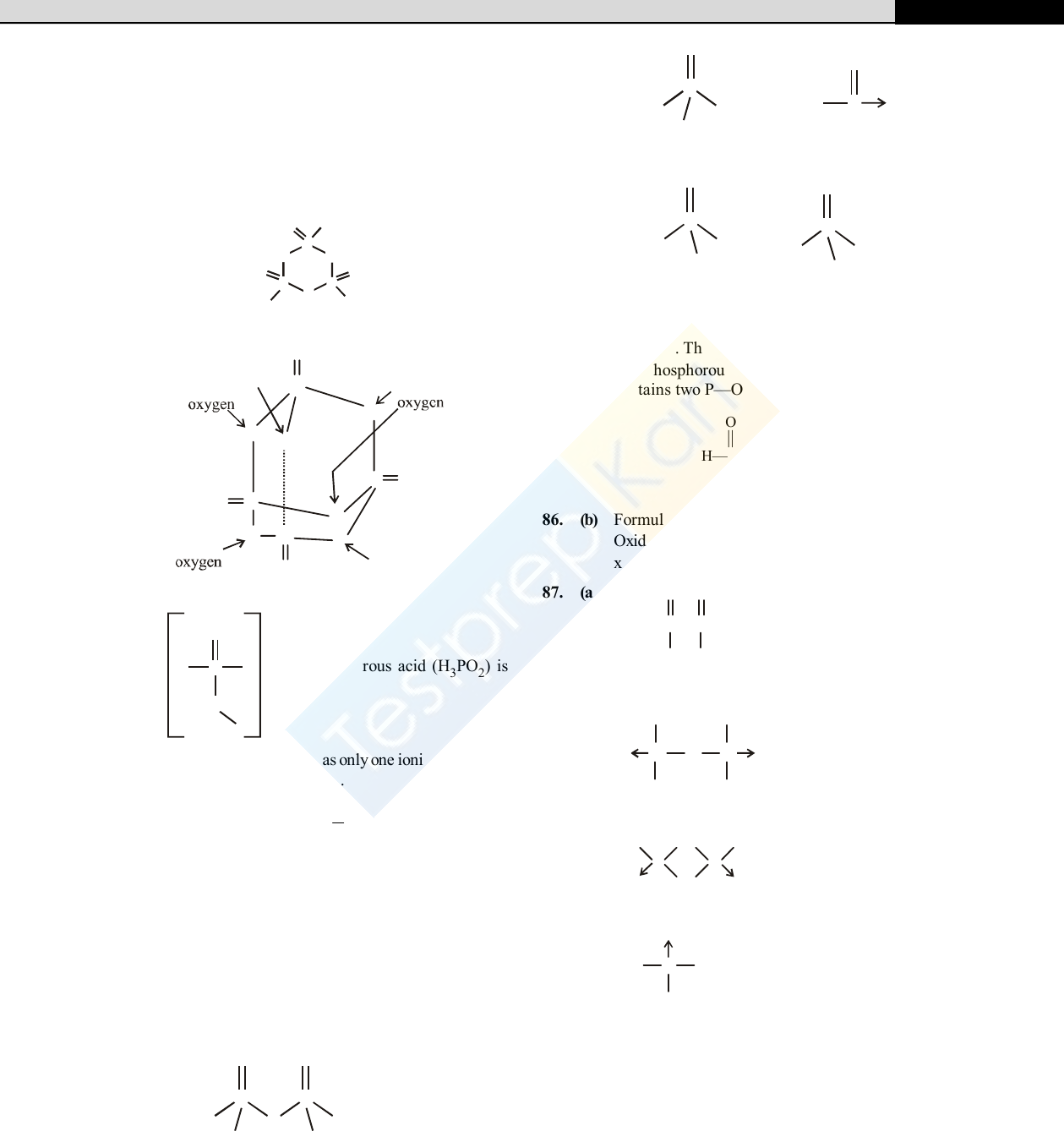 p-BLOCK ELEMENTS (GROUP 15, 16, 17 AND 18) 361 73. (c) Structure of hypophosphorous acid O H H POH | | Two H-atoms are attached to P atom. 74. (c) In cyclic metaphosporic acid number of P–O–P bonds is three. O O O HO O P PP O OH O OH 75. (d) 76. (b) O O O O O O P P O OO O P P bridging bridging bridging bridging oxygen 77. (b) H P H O H O Hypophosphorous acid (H3PO2) is a monobasic acid. i.e., it has only one ionisable hydrogen atom or one OH is present. 78. (c) Hybridisation in PCl5 = 50055 2 1 sp3d 79. (c) H5P5O15 (HPO3)5. It is metaphosphoric acid which is a cyclic phosphate. 80. (b) H4P2O5 is pyrophosphorous acid it contains P–O–P bond 81. (c) H3PO4 is tribasic 82. (a) Hypophosphorous acid is H3PO2 in which O.S. of P is +1 83. (c) 84. (d) Structures of given oxyacids are following (a) O O O OH OHOH HO P P H P O4 2 7 (b) O H H HO P H PO3 2 (c) O OHO P HPO3 (d) O OH OH HO P H PO43 (e) O OH OH H P H PO33 The H–atom of the –OH group is ionisable whereas H–atom which is directly linked to P–atom is non- ionisable. Thus H3PO3 is dibasic acid. 85. (a) Pyrophosphorous acid (H4P2O5) is a dibasic acid as it contains two P—OH bonds. O O H—P—O—P—H OH OH 86. (b) Formula of cyclotrimetaphosphoric acid is (HPO3)3 Oxidation state of ‘P’ is 3(+ 1 + x + 3 (– 2)) = 0 x + – 6 + 1 = 0 x = + 5 87. (a) O HO — P — P — OH HO OH Hypophosphoric acid O OH O P O P O OH OH OH Pyrophosphoric acid HO P O O O P OH O Metaphosphoric acid O P OH OHHO Orthophosphoric acid 88. (a) 89. (c) 90. (d) 91. (a) Electron affinity increases from left to right in period and decreases from top to bottom in a group but electron affinity of O is less than S due to small size. 92. (d) All exhibit polymorphism 93. (a) 362 THE p-BLOCK ELEMENTS (GROUP 15, 16, 17 AND 18) 94. (d) H2O is liquid but H2S is a gas. This can be attributed to the presence of intermolecular hydrogen bonding in case of H2O. 95. (b) 96. (a) 97. (a) H2O (due to intermolecular H - bonding) 98. (b) Oxygen being more electronegative 99. (a) SnO2 is an amphoteric oxide because it reacts with acids as well as with bases to form corresponding salts. SnO2 + 2H2SO4(conc) Sn(SO4)2 + 2H2O SnO2 + 2NaOH Na2SnO3 + H2O 100. (d) All hexafluorides of group 16 elements are gaseous in nature. 101. (b) Oxygen can be prepared by heating oxides of Hg, Pb, Ag, Mn and Ba. 2HgO 2Hg + O2 102. (c) It is paramagnetic with two unpaired electrons 103. (c) Total number of electrons in O2 is 16. It has 2 unpaired electrons, the rest 14 are paired. 104. (b) 23 O3KCl2KClO2 105. (c) In KMnO4 manganese is already present in its highest possible oxidation state i.e. +7.So no further oxidation is possible. 106. (c) Ozone layer is beneficial to us, because it stops harmful ultraviolet radiations from reaching the earth. 107. (b) 4KMnO2 2242 OMnO4MnOK 108. (d) Ozone is an allotrope of oxygen. 109. (d) 2Ag2O (s) 4Ag (s) + O2 (g) 2Pb3O4 (s) 6PbO (s) + O2 (g) 2PbO2 (s) 2PbO (s) + O2 (g) 110. (a) Mn2O7 is an acidic oxide. BaO and Na2O are basic oxides while N2O is a neutral oxides. 111. (c) It is 8 112. (c) S2 is paramagnetic. It contains two unpaired electrons in the antibonding * orbital 113. (a) 2SO2(g) + O2(g) 2 5V O 2SO3(g) 114. (b) S–O–O–= =O OH =O S=O OH O Peroxodisulphuric acid (H2S2O8) 115. (b) Conc. H2SO4 is a strong dehydrating agent due to which carbohydrates becomes charred on reaction with conc. H2SO4 acid. 116. (b) The key step in the manufacture of H2SO4 is catalystic oxidation of SO2 with O2 to give SO3 in presence of V2O5. 117. (a) In SO3, sp2 hybridisation 118. (c) 2 4 4 2 2Cu 2H SO (conc) CuSO SO 2H O 119. (b) 2 , one see structure 120. (c) H2SOHOH2SO 4222 . Bleaching action is due to reduction. 121. (d) Caro’s acid is 52SOH which contains one S – O – O – H peroxy linkage. It is also known as permonosulphuric acids. Caro's acid O || H – O – O – S – OH || O 122. (d) 123. (c) Oleum is 722 OSH )SOSOH( 342 which is obtained by dissolving SO3 in H2SO4 and is called fuming sulphuric acid. 124. (c) 125. (a) 126. (c) 127. (c) It is H2SO5. 128. (c) HCl2POCl2ClClSOPCl2OHSO.HO 3252 Sulphuryl chloride 129. (b) 422242 SOAgSOOH2SOH2Ag2 . Au, Pt does not react. Pb forms insoluble PbSO4 130. (c) 131. (a) 2&6;HOSOH || O O || 132. (a) In 42SOH , the S atom is present in its highest oxidation state of +6. Hence 42SOH can act an oxidant only by gain of electrons 133. (d) Ionisation potential decreases down the group. 134. (a) 135. (d) The lesser the bond energy, the weaker is the bond 136. (b) 3s2 3p5 is electronic configuration of Cl 137. (c) The electron gain enthalpy order for halogens is Cl > F > Br > I Due to small size of fluorine the extra electron to be added feels more electron-electron repulsion. Therefore fluorine has less value for electron affinity than chlorine. 138. (d) 139. (a) Reactivity follows the order F > Cl > Br > I 140. (d) 141. (b) Except ionisation potential other factors are true to explain the oxidising (strong) behaviour of 2F . 142. (b) 143. (d) Fluorine exhibit -ve oxidation state 144. (a) Since F2 is most oxidising, it is easily reduced 145. (c) Chlorine shows O.S. from –1,+1 to +7, whereas others show O.S. as Na +1 ; K +1 ; F –1 p-BLOCK ELEMENTS (GROUP 15, 16, 17 AND 18) 363 146. (c) Fluorine always exhibit –1 oxidation state. 147. (b) 0 1 1 2 2H O Br HOBr HBr Thus here oxidation number of Br increases from 0 to +1 and also decreases from 0 to –1. Thus it is oxidised as well as reduced. 148. (d) Since all the halogens have a strong tendency to accept electrons. Therefore halogens act as strong oxidising agents and their oxidising power decreases from fluorine to iodine. 149. (b) On moving from top to bottom of halogen group the bond dissociation energy of hydrogen halides decreases and so the heat of formation of halogen acids also decreases. 150. (a) HF, due to intermolecular H-bonding is weakest among HX acids 151. (c) Volatile character HCl > HBr >HI > HF 152. (d) Due to hydrogen bonding HF is a liquid 153