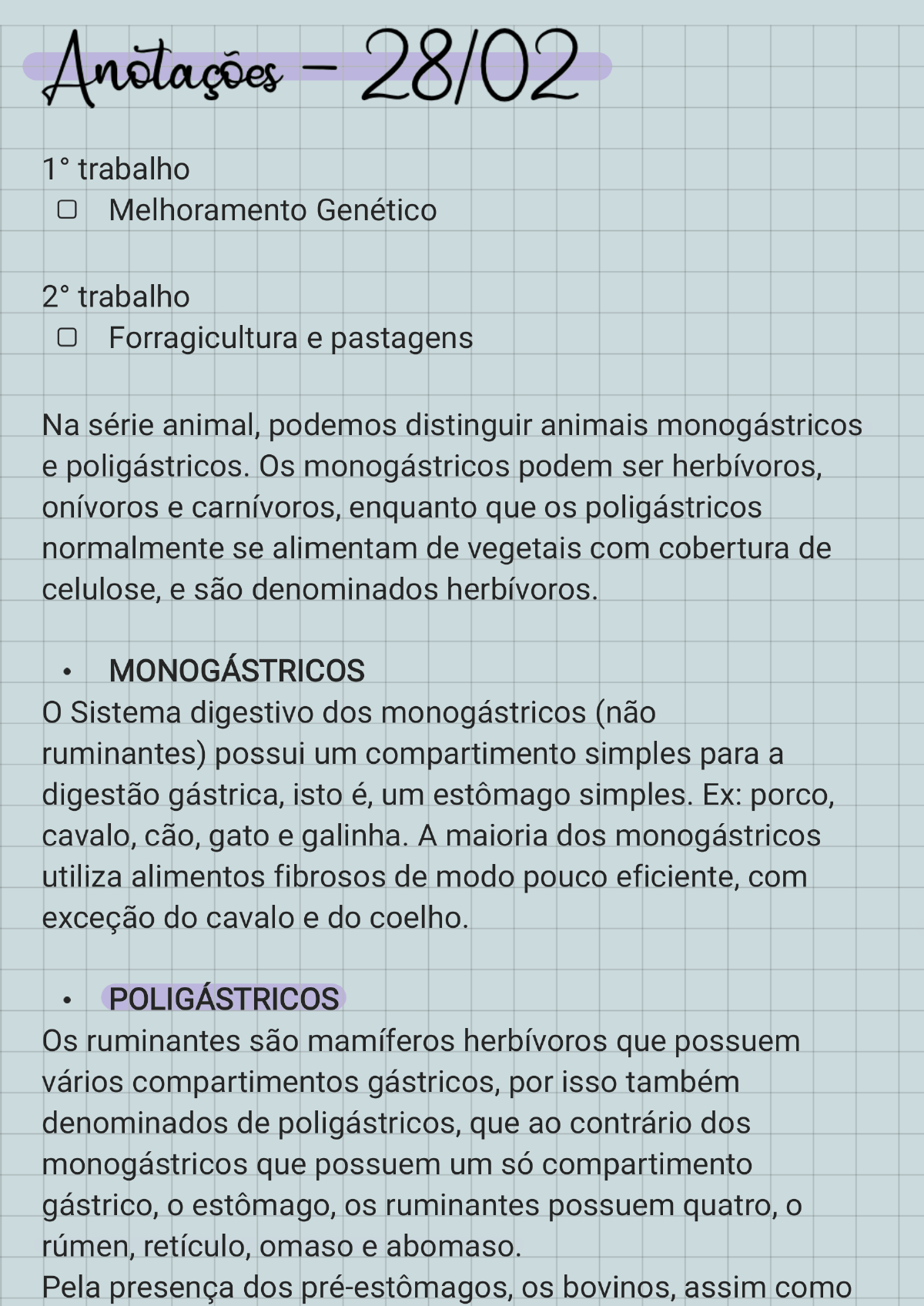 Anotagoes - 28/02 1° trabalho Melhoramento Genético 2° trabalho Forragicultura e pastagens Na série animal, podemos distinguir animais monogástricos e poligástricos. Os monogástricos podem ser herbívoros, onívoros e carnívoros, enquanto que os poligástricos normalmente se alimentam de vegetais com cobertura de celulose, e são denominados herbívoros. MONOGÁSTRICOS O Sistema digestivo dos monogástricos (não ruminantes) possui um compartimento simples para a digestão gástrica, isto é, um estômago simples. Ex: porco, cavalo, cão, gato e galinha. A maioria dos monogástricos utiliza alimentos fibrosos de modo pouco eficiente, com exceção do cavalo e do coelho. POLIGÁSTRICOS Os ruminantes são mamíferos herbívoros que possuem vários compartimentos gástricos, por isso também denominados de poligástricos, que ao contrário dos monogástricos que possuem um só compartimento gástrico, o estômago, os ruminantes possuem quatro, rúmen, retículo, omaso e abomaso. Pela presença dos pré-estômagos, os bovinos, assim comoa cabra, a ovelha, o búfalo, o camelo e os cervídeos, são classificados como poligástricos ou ruminantes, animais que têm capacidade de ruminar, consistindo na regurgitação dos alimentos ingeridos, na remastigação e em nova deglutição. Apresentam 3 pré-estômagos e 1 verdadeiro. Rúmen, retículo e omaso Abomaso Os ruminantes domésticos - de criação - - são: Os bovinos: Os bubalinos: E os pequenos ruminantes (ovinos e caprinos):Cursos CP APRESENTAÇÃO GERAL Troncos de raças bovinas. Há dois troncos de raças bovinas. Bos indicus ou Bos Taurus indicus = zebuínos = indianos Orelhas de Cupim tamanho + Rústicos Avantajado Médio a longo + adaptados +resistentes Referente ao: Barbela -clima tropical; +desenvolvida -A parasitas. Bos taurus (alguns utilizam Bos taurus taurus) = taurinos = europeus A1 Milk Producing Cow Breeds vs A2 Milk Producing Cow BreedsGir Holstein Friesian Karan Swiss Sahiwal Red Sindhi Jersey Brown Swiss Kankrej "Bos taurus" "Bos indicus" (European cattle - Taurine) (Indian cattle - Zebu) Os taurinos não possuem cupim, alguns têm gordura no pescoço, mas O cupim dos zebuínos é maior e deve ter forma de "castanha de caju". O cupim nos machos, é muito mais desenvolvido. Na época de seca ele dá uma "murchada", porém nos machos ainda é bem perceptível, já nas fêmeas ele quase desaparece. As orelhas dos zebuínos é alongada e voltada para baixo. Já as dos taurinos é curta, horizontais e voltadas para frente. A barbela tem como função aumentar a superfície corporal. Tem maior quantidade de glândulas sudoriparas (produzem suor, substância que atua na termoregulação do organismo e na eliminação de produtos que O corpo não necessita). A orelha serve como proteção te parasitas, como por exemplo a mosca do chifre - Os ectoparasitas como a mosca dos chifres e carrapatos causam diversos prejuízos à bovinocultura, ocasionando perda de peso,danos a qualidade do couro, transmissão de agentes causadores de doenças, diminuição da libido dos touros, entre outros prejuízos. Os zebuínos são menos produtivos (carne e leite) e menos precoces comparado aos taurinos. Precocidade significa atingir mais cedo determinada característica. Seja ela reprodutiva (maturidade sexual) ou precocidade para acabamento (características de ganho de peso e abate). Dentre os taurinos há uma subdivisão que é em raças britânicas e continentais. As britânicas são raças de pequeno porte, como por exemplo a raça Angus e Hereford. As britânicas apresentam maior precocidade que as continentais. Há também as taurinas continentais, que são as de grande porte. Como por exemplo Simental Outras continentais são por exemplo Limousin (francesa), Caracu (portuguesa). As continentais comparadas com as britânicas perdem em precocidade, porém, apresentam alto peso de carcaça. Tanto as taurinas quanto as zebuínas tem raças destinadas a produção de carne, também há raças destinadas a produção leiteira, bem como raças de dupla aptidão (servem para ambos) Tanto nas taurinas quanto nas zebuínas há raças que sempre terão chifre, há também raças que sempreserão mochas (sem chifre) e há ainda aquelas raças que isso é variável Modelo extensivo, ou seja, animais criados soltos. Binômio perfeito: Nelore X Brachiaria Nelore é a principal raça de corte que existe no Brasil. Brachiaria é esta forragem (capim) que é utilizado na alimentação. Haematobia irritans (mosca do chifre) Em animais de corte é comum e correto o bezerro ficar junto com a mãe. O desmame ocorre por volta dos 8 meses. A gestação de bovinos é de 9 meses. A vaca deve ter 1 bezerro por ano. 1 bezerro por ano, corresponde a 3 bezerros a cada 3 anos por exemplo, porém, a média do Brasil é de 2 bezerros a cada 3 anos Tanto os zebuínos quanto os taurinos possuem raças destinadas a corte, a leite e ambos (dupla aptidão). Quando ocorre gêmeos em bovino, devem ser de preferência do mesmo sexo. Vale ressaltar que a infertilidade devido à gestação de gêmeos só ocorrerá quando os sexos forem diferentes, ou seja, quando forem gêmeos de duas fêmeas ou dois machos não haverá problemas de fertilidade, pois quando são de sexos diferentes, a fêmea adquire as características do macho. Isso se chama Freemartinismo.A estação de monta (EM), ou período de monta, é uma prática da criação de bovinos em que as fêmeas em reprodução são expostas ao touro ou à inseminação artificial (IA) durante um determinado período do ano, com o objetivo de concentrar os partos e, em sequência, as operações (desmama, vacinações, vermifugações etc.). No geral, não é feito em gado de leite. Aqui no Brasil a estação de monta bovina se concentra no período das chuvas, o que corresponde aos meses entre outubro e janeiro, dependendo da região onde se encontra. Produtores que estejam adotando pela primeira vez, pode ampliar o períod