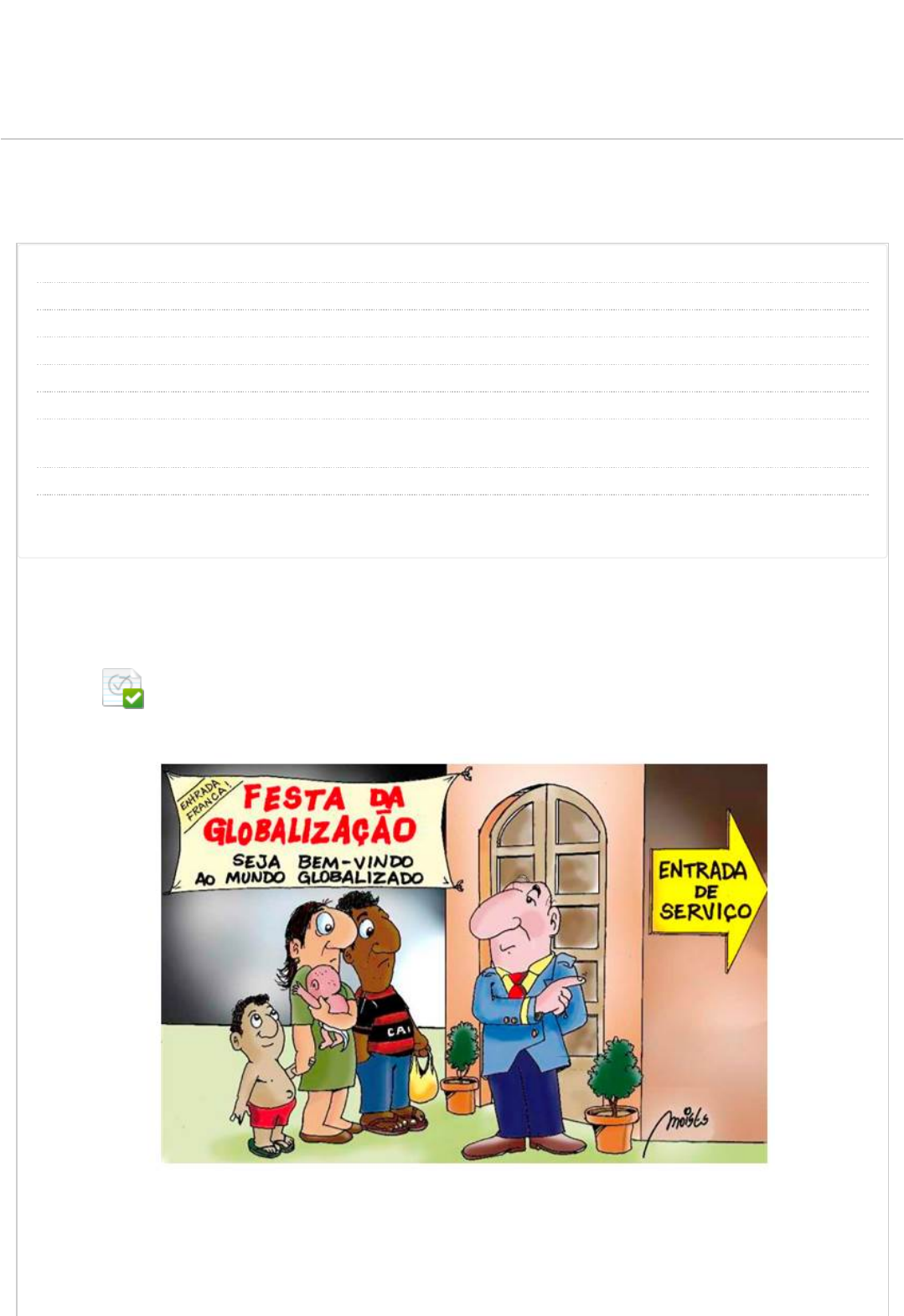 Revisar envio do teste: QUESTIONÁRIO UNIDADE II ESTUDOS DISCIPLINARES XII 6675-10_SEI_CT_0122_R_20242 CONTEÚDO Usuário beatriz.silva647 @aluno.unip.br Curso ESTUDOS DISCIPLINARES XII Teste QUESTIONÁRIO UNIDADE II Iniciado 25/11/24 15:11 Enviado 25/11/24 15:30 Status Completada Resultado da tentativa 5 em 5 pontos Tempo decorrido 19 minutos Resultados exibidos Todas as respostas, Respostas enviadas, Respostas corretas, Comentários, Perguntas respondidas incorretamente Pergunta 1 Sociedade e economia: globalização e desigualdade social. Veja a charge e leia o trecho de texto de Milton Santos a seguir: Disponível em: https://mcartuns.wordpress.com/2013/08/02/globalizacao-3/. Acesso em: 15 ago. 2017. De fato, para grande parte da humanidade a globalização está se impondo como uma fábrica de perversidades. O desemprego crescente torna-se crônico. A pobreza aumenta e as classes UNIP EAD BIBLIOTECAS MURAL DO ALUNO TUTORIAISCONTEÚDOS ACADÊMICOS 0,5 em 0,5 pontos http://company.blackboard.com/ https://ava.ead.unip.br/webapps/blackboard/execute/courseMain?course_id=_375584_1 https://ava.ead.unip.br/webapps/blackboard/content/listContent.jsp?course_id=_375584_1&content_id=_4280004_1&mode=reset https://ava.ead.unip.br/webapps/portal/execute/tabs/tabAction?tab_tab_group_id=_10_1 https://ava.ead.unip.br/webapps/portal/execute/tabs/tabAction?tab_tab_group_id=_27_1 https://ava.ead.unip.br/webapps/portal/execute/tabs/tabAction?tab_tab_group_id=_47_1 https://ava.ead.unip.br/webapps/portal/execute/tabs/tabAction?tab_tab_group_id=_29_1 https://ava.ead.unip.br/webapps/portal/execute/tabs/tabAction?tab_tab_group_id=_25_1 https://ava.ead.unip.br/webapps/login/?action=logout Resposta Selecionada: a. Respostas: a. b. c. d. e. Comentário da resposta: médias perdem em qualidade de vida. O salário médio tende a baixar. A fome e o desabrigo se generalizam em todos os continentes. A mortalidade infantil permanece, a despeito dos progressos médicos e da informação. A educação de qualidade é, cada vez mais, inacessível. Alastram-se e aprofundam-se os males espirituais e morais, como o egoísmo, o cinismo e a corrupção. A perversidade sistêmica que está na raiz dessa evolução negativa da humanidade tem relação com a adesão desenfreada aos comportamentos competitivos que, atualmente, caracterizam as ações hegemônicas. Todas essas mazelas são, direta ou indiretamente, imputáveis ao presente processo de globalização. Fonte: SANTOS, M. Por uma outra globalização, do pensamento único à consciência universal. Rio de Janeiro: Record, 2001. Com base na leitura, avalie as a�rmativas a seguir: I. A charge e o texto apresentam visões antagônicas sobre o processo de globalização, pois a charge mostra a inclusão de todos, e o texto critica a perversidade da economia global; II. Para Milton Santos, a perversidade caracterizada pelas desigualdades é intrínseca à globalização; III. A charge destaca o aumento das ofertas de emprego promovido pela globalização, ao contrário do texto, que a�rma que o desemprego é crescente e crônico; IV. A charge e o texto contrapõem-se ao discurso comum de que a globalização promove a igualdade e o crescimento a todos os países, e as classes sociais. É correto o que se a�rma, somente, em: II e IV. II e IV. I, II e IV. II, III e IV. I e III. II e III. Resposta: A Comentário: I e III. A�rmativas incorretas. JUSTIFICATIVA. A charge e o texto apresentam visões similares sobre a globalização. A charge mostra uma situação de exclusão social na Era da Globalização e não indica que esse processo gere o aumento na oferta de emprego. O texto a�rma que “para grande parte da humanidade a globalização está se impondo como uma fábrica de perversidades”. II. A�rmativa correta. JUSTIFICATIVA. Segundo o texto, “a perversidade sistêmica que está na raiz [da] evolução negativa da humanidade tem relação com a adesão desenfreada aos comportamentos competitivos que, atualmente, caracterizam as ações hegemônicas”. O autor prossegue a�rmando que “todas essas mazelas são, direta ou indiretamente, imputáveis ao presente processo de globalização”. IV. A�rmativa correta. JUSTIFICATIVA. Tanto a charge quanto o texto contrariam a ideia segundo a qual o processo de globalização seria capaz de levar à igualdade social e de promover o crescimento da totalidade das nações. Pergunta 2 Educação: ensino e evolução social. Veja a charge e leia o texto da professora Íris Rodrigues Oliveira, da UFRJ: Disponível em: http://educacaoecidadaniaucsal.blogspot.com.br. Acesso em: 27 jul. 2017. A educação não pode, sozinha, instaurar um estatuto de ascensão social para quem quer que seja. Não é um fato comprovado cienti�camente que alguém que tenha, por exemplo, curso universitário ascenda social, econômica e emocionalmente. A educação tem que ser aberta para todos e possibilitar que o homem tenha uma formação que o capacite a conhecer novos espaços, investir em novas aventuras, sejam cognitivas, afetivas, econômicas, sociais, de todos os tipos. O Brasil tem que lutar contra os fortes indicadores de exclusão social, econômica e �nanceira. Quando se fala em ascensão social, pensa-se em, apenas, uma das características, porque ninguém comprova que uma ascensão econômica leva a uma social. O que é uma ascensão social? Como é que você se sente incluído socialmente em uma cultura, em um grupo e em um lugar? Será que as pessoas de bom nível econômico, emocional, afetivo têm, também, um bom nível social? Será que as que têm bom nível social – que são aceitas socialmente e fazem parte de grupos – têm um nível econômico que lhes permita atender, minimamente, as suas necessidades básicas? É uma questão para se montar uma pesquisa e constatar, empiricamente, essas formulações. O Brasil vive lutando com as formas de incluir não, apenas, socialmente, mas, também, humanamente em 