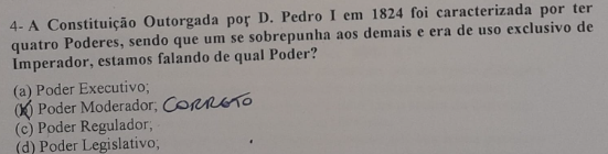 4- A Constituição Outorgada por D. Pedro I em 1824 foi caracterizada por ter quatro Poderes, sendo que um se sobrepunha aos demais e era de uso exclusivo de Imperador, estamos falando de qual Poder? (a) Poder (c) Poder Regulador; Moderador; CORRETO Poder (d) Poder Legislativo;