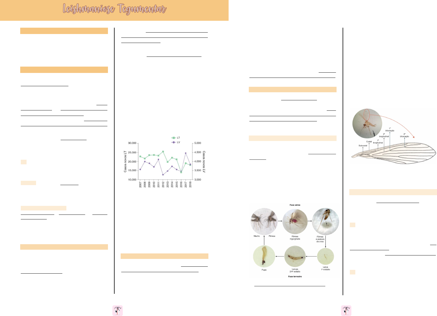 1 Júlia Morbeck – @med.morbeck Objetivos 1- Debater sobre a epidemiologia, etiologia, fatores de risco, fisiopatologia (ciclo), manifestações clínicas, diagnóstico e tratamento da leishmaniose tegumentar. (*leishmaniose difusa e a relação entre tegumentar e visceral). Leishmaniose Tegumentar ↠ A leishmaniose tegumentar (LT), também denominada úlcera de Bauru ou ferida brava, é uma doença infecciosa não contagiosa, com grande impacto à saúde pública (SIQUEIRA-BATISTA, 2020). ↠ A leishmaniose tegumentar americana é uma doença de evolução crônica que acomete a pele e as mucosas do nariz, da boca, da faringe e da laringe. É causada por protozoários do gênero Leishmania e transmitida por insetos conhecidos genericamente como flebotomíneos (FOCACCIA et. al., 5ª ed.). ↠ As leishmanioses são antropozoonoses consideradas um grande problema de saúde pública e representam um complexo de doenças com importante espectro clínico e diversidade epidemiológica (BRASIL, 2017). OBS.: As observações epidemiológicas iniciais levaram os pesquisadores a denominá-la “leishmaniose americana das florestas”, em alusão ao fato de que sua transmissão se associava ao ambiente silvestre (FOCACCIA et. al., 5ª ed.). IMPORTANTE: Apesar de ser uma zoonose, a moléstia acomete milhares de indivíduos a cada ano, deixando como resultado um vasto espectro de formas clínicas, abrangendo desde infecções sem sintomas até as mutilações graves que ocorrem nas formas mucosas (FOCACCIA et. al., 5ª ed.). TIPOS DE LEISHMANIOSE TEGUMENTAR: Estão incluídos nesse grupo a leishmaniose cutânea (LC), a mucocutânea (LMC) e a leishmaniose cutânea difusa (LCD). A LC é a forma de leishmaniose que resulta em lesões cutâneas limitadas, ulcerosas ou não. A LMC é a aquela em que surgem lesões ulcerosas destrutivas nas mucosas do nariz, da boca e da faringe. A forma cutânea difusa (LCD), não-ulcerosa, manifesta-se em indivíduos anérgicos, ou surge mais tardiamente, naqueles que foram tratados de calazar (SIQUEIRA-BATISTA, 2020). EPIDEMIOLOGIA ↠ Não existem, nas Américas, dados seguros para se avaliar o número de pessoas atingidas pela doença. No Brasil, as estatísticas oficiais têm registrado pelo menos 35 mil novos casos por ano, número este que não traduz a realidade, devido às deficiências no sistema de notificação das doenças transmissíveis (FOCACCIA et. al., 5ª ed.). ↠ Além disso, a assistência médica precária nas zonas rurais faz com que muitos doentes deixem que o mal se cure espontaneamente, passando sem registro (FOCACCIA et. al., 5ª ed.). ↠ A doença é endêmica no continente americano (do sul dos EUA ao norte da Argentina, com exceção do Chile, Uruguai e a maior parte das ilhas do Caribe) e no Velho Mundo (região mediterrânea e outras partes da Ásia e da África), com surtos epidêmicos esporádicos (BOGLIOGO, 10ª ed.). ↠ Estima-se que 0,7 a 1 milhão de novos casos de leishmaniose tegumentar ocorra a cada ano, 90% deles no Afeganistão, Paquistão, Síria, Arábia Saudita, Argélia, Irã, Brasil e Peru (BOGLIOGO, 10ª ed.). ↠ Em 2018, foram registrados 16.432 casos autóctones de LTA no Brasil, 91% deles em pessoas com idade superior a 10 anos e 74% em homens (BOGLIOGO, 10ª ed.). ↠ No Brasil, a leishmaniose tegumentar vem sendo registrada em todas as regiões, inclusive no Sul do país, onde predomina no estado do Paraná. As populações rurais do Norte, do Nordeste e do Centro-Oeste pagam maior tributo à moléstia, que assola extensas áreas de colonização recente, com florestas ainda abundantes. Pelo menos 75% dos casos registrados no país procedem das regiões Norte e Nordeste. No Nordeste, a endemia persiste também em áreas de colonização antiga, especialmente nas zonas serranas do Ceará, da Paraíba e da Bahia (FOCACCIA et. al., 5ª ed.). FATORES DE RISCO ↠ A expansão da LTA está relacionada com intervenções do homem no meio ambiente pela necessidade de novos espaços habitacionais em função do crescimento urbano e de migrações forçadas por conflitos, mormente na Ásia, ou para a expansão de atividades econômicas, que implicam em desmatamentos APG 26 – “O ÚLTIMO ZUMBI” 2 Júlia Morbeck – @med.morbeck e exploração de florestas primárias. Tais ações terminam por aumentar a exposição de hospedeiros intermediários e de humanos ao vetor e por adaptar ciclos de transmissão a ambientes peridomésticos (BOGLIOGO, 10ª ed.). ↠ A infecção por leishmânias, como nas infecções por outros organismos intracelulares (micobactérias, Histoplasma, Toxoplasma e tripanossomos), é exacerbada nas condições que interferem na função das células T, como a AIDS (ROBBINS & COTRAN). ETIOLOGIA ↠ É causada por protozoários flagelados do gênero Leishmania, parasito pertencente à família Trypanosomatidae, transmitido aos humanos pela picada das fêmeas de flebotomíneos do gênero Lutzomyia (Américas) ou Phlebotomus (Velho Mundo)., cujo nome popular é “mosquito-palha” ou “birigui” (SIQUEIRA- BATISTA, 2020). VETORES DAS LEISHMANIOSES ↠ Os insetos vetores das leishmanioses pertencem ao filo Arthropoda São conhecidos por flebotomíneos, ou flebótomos, e só estes apresentam espécies com importância em medicina humana e/ou veterinária (FERREIRA, 2020). ↠ Nas Américas, os flebotomíneos estão predominantemente associados a matas e florestas. No Brasil os flebotomíneos têm nomes regionais como mosquito-palha, birigui, cangalhinha, tatuquira, asa-dura, asa-branca ou anjinho (FERREIRA, 2020). ↠ Só as fêmeas são hematófagas e telmofágicas, isto é, durante a refeição sanguínea fazem pequenos movimentos de vaivém com suas peças bucais, dando origem a micro-hematomas na derme do vertebrado. O sangue coletado nesse local não coagula devido às enzimas que a saliva de tais insetos contém (FERREIRA, 2020). ↠ A atividade dos adultos é principalmente crepuscular e/ou no