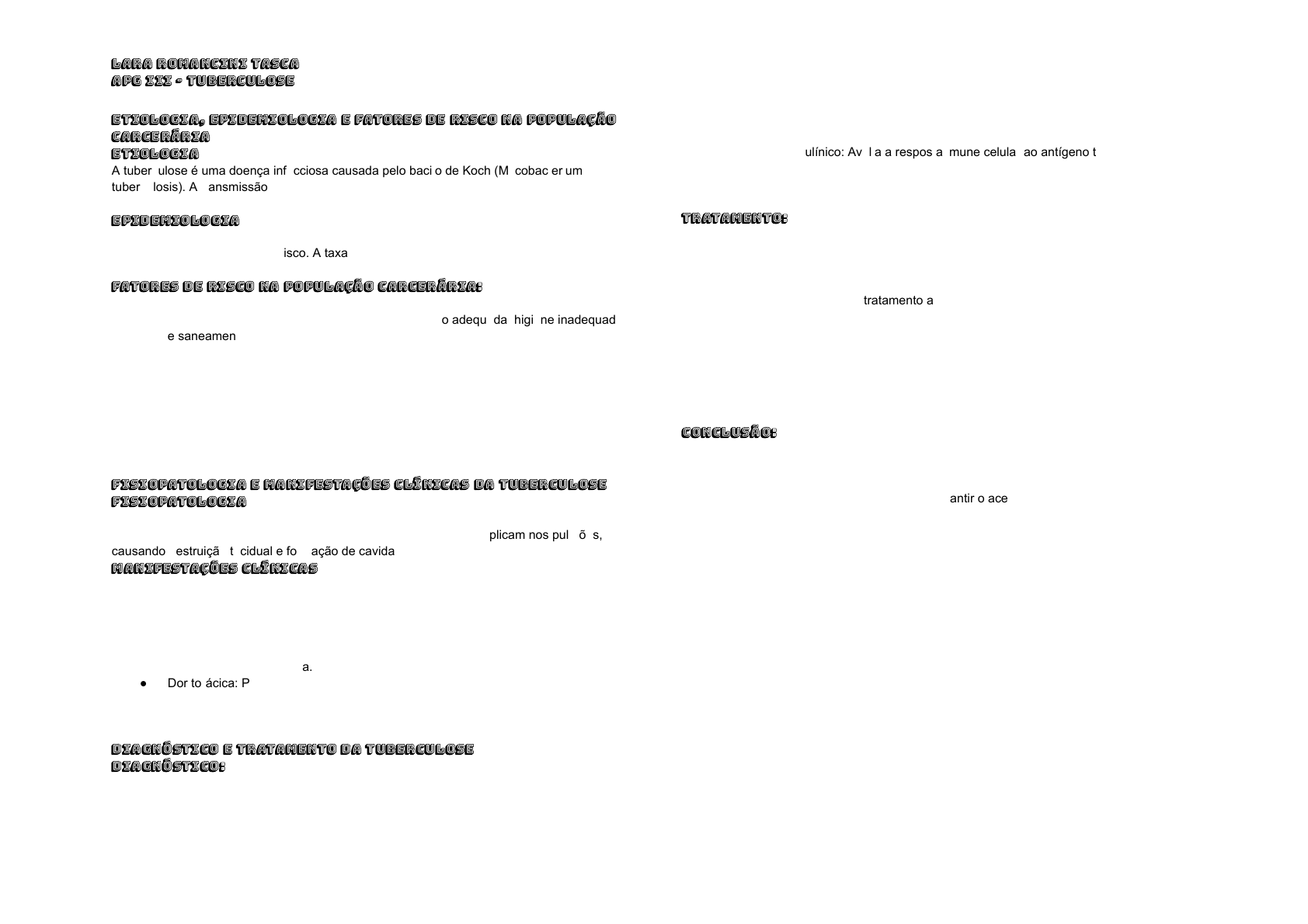 LARA ROMANCINI TASCA APG III - TUBERCULOSE Etiologia, Epidemiologia e Fatores de Risco na População Carcerária Etiologia A tuberculose é uma doença infecciosa causada pelo bacilo de Koch (Mycobacterium tuberculosis). A transmissão ocorre principalmente por via aérea, através de gotículas expelidas ao tossir, espirrar ou falar. Epidemiologia A tuberculose é um problema de saúde pública global e a população carcerária é considerada um grupo de alto risco. A taxa de incidência da tuberculose entre os detentos é significativamente maior do que na população em geral. Fatores de Risco na População Carcerária: ● Superlotação: A aglomeração facilita a transmissão da doença. ● Condições sanitárias precárias: Falta de ventilação adequada, higiene inadequada e saneamento básico deficiente aumentam o risco de transmissão. ● Desnutrição: A desnutrição enfraquece o sistema imunológico, tornando os indivíduos mais suscetíveis à doença. ● Uso de drogas: O uso de drogas injetáveis pode levar a outras infecções e comprometer o sistema imunológico. ● Comorbidades: Doenças como HIV/AIDS e diabetes aumentam o risco de desenvolver tuberculose ativa e de apresentar formas mais graves da doença. ● História pregressa de tuberculose: Indivíduos com história de tuberculose latente têm maior risco de reativação da doença. Fisiopatologia e Manifestações Clínicas da Tuberculose Fisiopatologia Após a inalação do bacilo de Koch, ocorre uma resposta imune que pode resultar em infecção ativa, latente ou doença. Na forma ativa, os bacilos se multiplicam nos pulmões, causando destruição tecidual e formação de cavidades. Manifestações Clínicas ● Tosse: Geralmente persistente, por mais de duas semanas. ● Febre: Baixa, vespertina. ● Suor noturno: Intenso. ● Fadiga: Sensação de cansaço excessivo. ● Perda de peso: Involuntária. ● Falta de apetite: Anorexia. ● Dor torácica: Pode ocorrer em casos de envolvimento pleural. ● Hemoptise: Tosse com sangue. Formas Extrapulmonares: A tuberculose pode acometer outros órgãos como rins, ossos, meninges e linfonodos. Diagnóstico e Tratamento da Tuberculose Diagnóstico: ● Baciloscopia: Exame microscópico de escarro para identificar bacilos álcool-ácido resistentes. ● Cultura: Permite a identificação da espécie de Mycobacterium e a realização de testes de sensibilidade a medicamentos. ● Teste tuberculínico: Avalia a resposta imune celular ao antígeno tuberculínico. ● Radiografia de tórax: Mostra alterações características da tuberculose pulmonar. ● Tomografia computadorizada: Pode ser utilizada para avaliar lesões pulmonares e extrapulmonares. Tratamento: O tratamento da tuberculose é feito com associação de vários antibióticos (poliquimioterapia) por um período prolongado (geralmente 6 a 9 meses). A adesão ao tratamento é fundamental para evitar o surgimento de resistência e a cura da doença. Medidas de Controle: ● Diagnóstico precoce e tratamento adequado: Identificar e tratar os casos de tuberculose o mais rápido possível. ● Isolamento: Isolar os pacientes com tuberculose bacilífera para evitar a transmissão. ● Investigação de contatos: Identificar e avaliar os indivíduos que tiveram contato com o paciente doente. ● Prevenção: Vacinação com BCG, melhoria das condições de vida e de trabalho, e promoção da educação em saúde. Conclusão: A tuberculose na população carcerária representa um desafio de saúde pública. A combinação de fatores de risco presentes nesse ambiente facilita a transmissão da doença e dificulta o controle. É fundamental implementar medidas de prevenção e controle da tuberculose nos sistemas prisionais, além de garantir o acesso ao diagnóstico e tratamento adequado para todos os detentos. LARA ROMANCINI TASCA APG III - DPOC E ASMA Etiologia, Epidemiologia e Fatores de Risco DPOC (Doença Pulmonar Obstrutiva Crônica) ● Etiologia: Principalmente causada pelo tabagismo, que desencadeia um processo inflamatório crônico nas vias aéreas inferiores, levando à obstrução ao fluxo aéreo. ● Epidemiologia: Alta prevalência em fumantes e ex-fumantes, especialmente em países desenvolvidos. A idade avançada é um fator de risco. ● Fatores de risco: Tabagismo, exposição à poluição do ar, infecções respiratórias na infância, deficiência de alfa-1-antitripsina. Asma ● Etiologia: Doença inflamatória crônica das vias aéreas, caracterizada por hiperresponsividade brônquica, inflamação e obstrução reversível. A causa exata é desconhecida, mas envolve fatores genéticos e ambientais. ● Epidemiologia: Afeta pessoas de todas as idades, com pico de incidência na infância. A prevalência tem aumentado nas últimas décadas. ● Fatores de risco: Alergias, infecções respiratórias na infância, exposição a poluentes, tabagismo, obesidade, fatores ocupacionais. Fisiopatologia e Manifestações Clínicas DPOC ● Fisiopatologia: A inflamação crônica leva à destruição dos alvéolos e das paredes brônquicas, resultando em limitação do fluxo aéreo não totalmente reversível. ● Manifestações clínicas: Tosse crônica, produção de muco, dispneia progressiva, sibilos, limitação da atividade física. Asma ● Fisiopatologia: A inflamação das vias aéreas causa espasmo muscular, edema e produção excessiva de muco, levando à obstrução variável e reversível. ● Manifestações clínicas: Episódios de sibilos, tosse, aperto no peito e dispneia, que podem ser desencadeados por alérgenos, exercício físico, infecções ou outros fatores. Diagnóstico e Tratamento DPOC ● Diagnóstico: Espirometria (demonstra obstrução ao fluxo aéreo), história clínica e exame físico. ● Tratamento: ○ Não farmacológico: Cessação do tabagismo, reabilitação pulmonar, vacinação contra influenza e pneumonia. ○ Farmacológico: Broncodilatadores (beta-2 