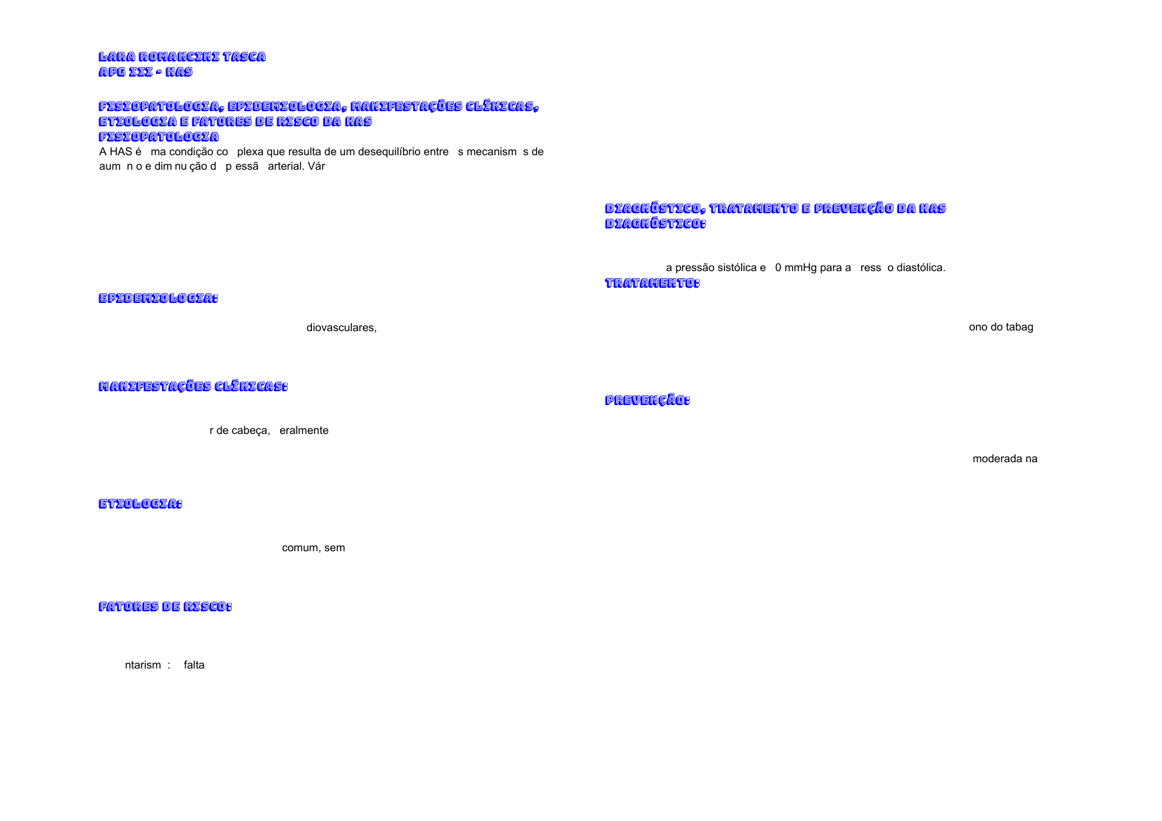 LARA ROMANCINI TASCA APG III - HAS Fisiopatologia, Epidemiologia, Manifestações Clínicas, Etiologia e Fatores de Risco da HAS Fisiopatologia A HAS é uma condição complexa que resulta de um desequilíbrio entre os mecanismos de aumento e diminuição da pressão arterial. Vários fatores podem contribuir para esse desequilíbrio, incluindo: Aumento da resistência vascular periférica: As artérias se contraem, dificultando o fluxo sanguíneo. Aumento do volume sanguíneo: O coração bombeia mais sangue para o sistema circulatório. Alterações na função renal: Os rins retêm mais sódio e água, aumentando o volume sanguíneo. Disfunção endotelial: O endotélio (camada interna dos vasos sanguíneos) perde sua função de relaxamento, contribuindo para a vasoconstrição. Epidemiologia: A HAS é uma doença crônica de alta prevalência global, afetando milhões de pessoas. É um importante fator de risco para doenças cardiovasculares, como infarto do miocárdio, acidente vascular cerebral e insuficiência cardíaca. A prevalência da HAS aumenta com a idade e está associada a diversos fatores de risco, como obesidade, sedentarismo, tabagismo e histórico familiar. Manifestações Clínicas: A HAS é frequentemente assintomática, sendo diagnosticada durante exames de rotina. Quando presentes, os sintomas podem incluir: - Cefaleia: Dor de cabeça, geralmente localizada na nuca ou têmporas. - Vertigem: Sensação de tontura ou instabilidade. - Zumbido nos ouvidos: Ruídos ou zumbidos persistentes. - Visão turva: Dificuldade em enxergar com nitidez. - Sangramento nasal: Episódios frequentes de sangramento nasal. Etiologia: A etiologia da HAS é multifatorial, ou seja, envolve diversos fatores que interagem entre si. As causas podem ser classificadas em: Hipertensão essencial: A forma mais comum, sem causa identificável, e geralmente relacionada a fatores de risco como idade, genética, obesidade e estilo de vida. Hipertensão secundária: Causada por outras doenças ou condições, como doenças renais, distúrbios endócrinos, uso de medicamentos e defeitos estruturais do coração. Fatores de Risco: Idade: A prevalência aumenta com a idade. Genética: Histórico familiar de hipertensão aumenta o risco. Obesidade: O excesso de peso aumenta a carga de trabalho do coração. Sedentarismo: A falta de atividade física contribui para o aumento da pressão arterial. Tabagismo: A nicotina causa vasoconstrição e aumenta a frequência cardíaca. Consumo excessivo de sal: O sódio aumenta a retenção de líquidos e eleva a pressão arterial. Consumo excessivo de álcool: O álcool pode aumentar a pressão arterial, especialmente em grandes quantidades. Diabetes: A diabetes mellitus aumenta o risco de desenvolver hipertensão. Dislipidemia: Níveis elevados de colesterol e triglicerídeos podem contribuir para a hipertensão. Estresse: O estresse crônico pode ativar o sistema nervoso simpático, aumentando a pressão arterial. Diagnóstico, Tratamento e Prevenção da HAS Diagnóstico: O diagnóstico da HAS é feito através da medida da pressão arterial em diferentes ocasiões. A pressão arterial é considerada elevada quando os valores são iguais ou superiores a 140 mmHg para a pressão sistólica e 90 mmHg para a pressão diastólica. Tratamento: O tratamento da HAS visa controlar a pressão arterial e prevenir complicações. Ele inclui: Mudanças no estilo de vida: Perda de peso, prática regular de atividade física, dieta saudável com baixo teor de sódio, redução do consumo de álcool e abandono do tabagismo. Medicamentos: Diuréticos, beta-bloqueadores, inibidores da enzima conversora de angiotensina (IECA), bloqueadores dos receptores de angiotensina II (BRA), bloqueadores dos canais de cálcio e outros. A escolha do medicamento dependerá da causa da hipertensão e das características do paciente. Prevenção: A prevenção da HAS envolve a adoção de um estilo de vida saudável, incluindo: Alimentação equilibrada: Reduzir o consumo de sódio, aumentar o consumo de frutas, legumes e verduras. Atividade física regular: Praticar pelo menos 30 minutos de atividade física moderada na maioria dos dias da semana. Manutenção do peso ideal: Controlar o peso através de uma dieta equilibrada e atividade física. Não fumar: O tabagismo é um fator de risco importante para a hipertensão. Moderar o consumo de álcool: Limitar o consumo de bebidas alcoólicas. Controle do estresse: Praticar técnicas de relaxamento e buscar apoio social. Monitoramento regular da pressão arterial: Pessoas com fatores de risco devem medir a pressão arterial regularmente. É importante ressaltar que a hipertensão é uma doença crônica que requer tratamento contínuo e acompanhamento médico regular.