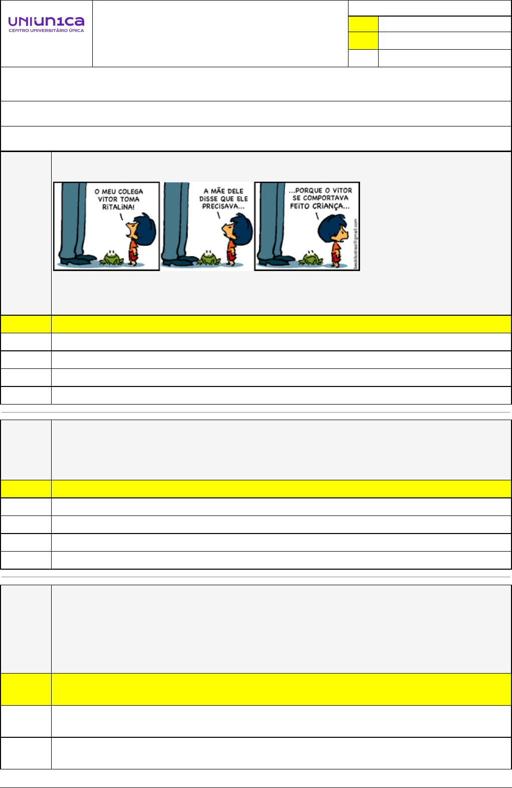 Pincel Atômico - 26/11/2024 08:59:38 1/7 GISELE CRISTINA SIMÕES PERROT Avaliação Online (Curso Online - Automático) Atividade finalizada em 25/11/2024 11:52:38 (1990956 / 1) LEGENDA Resposta correta na questão # Resposta correta - Questão Anulada X Resposta selecionada pelo Aluno Disciplina: PRÁTICA PEDAGÓGICA INTERDISCIPLINAR: TRANSTORNOS GLOBAIS DO DESENVOLVIMENTO [1106841] - Avaliação com 20 questões, com o peso total de 50,00 pontos [capítulos - Todos] Turma: Segunda Graduação: Segunda Graduação 6 Meses - Licenciatura em Educação Especial - Grupo: FPD-ABR/2024 - SGegu0A290424 [123279] Aluno(a): 91609262 - GISELE CRISTINA SIMÕES PERROT - Respondeu 15 questões corretas, obtendo um total de 37,50 pontos como nota [361019_1737 19] Questão 001 Leia a tirinha abaixo. Figura 5: A medicalização da infância Fonte: https://bit.ly/3HkcVXZ Acesso em: 16 abr. 2022. Considerando que a Ritalina é o nome comercial de um medicamento utilizado no tratamento do TDAH, é correto afirmar que o quadrinho: X Faz uma crítica ao uso de indiscriminado da Ritalina. Mostra que a criança está com inveja do Vitor, pois queria tomar Ritalina. Faz uma crítica aos pais que não medicam as crianças. Culpabiliza as famílias por não saberem educar as crianças. Faz uma crítica às crianças que não sabem se comportar. [361019_9489 5] Questão 002 Acima de 2 anos, a criança já consegue demonstrar habilidades com determinadas brincadeiras e atividades, além de conseguir reconhecer quais são as pessoas que fazem parte do seu convívio familiar e social. Contudo, professores e familiares devem estar atentos para alguns sinais discrepantes de um padrão de normalidade: X Desinteresse em sala de aula pelas brincadeiras e atividades. Facilidade para identificar letras e números. interação com os colegas, professor e demais profissionais da escola. Desenvolvimento satisfatório da fala. Adaptação em ambientes que não façam parte de sua rotina [361019_1737 04] Questão 003 (Adaptada de Secretaria de Estado de Educação/Minas). Na relação escola-família, um diretor, visando a ampliar as possibilidades dos alunos de sua escola, propõe ao coordenador pedagógico que organizem uma reunião com os pais com o objetivo de apoiá-los na consolidação de atitudes de valorização e estímulo à aprendizagem de seus filhos. Essa iniciativa contribui para a X Consolidação da parceria escola-comunidade, ao propiciar espaços de interação eficazes com foco na aprendizagem dos alunos. Mistura de papéis que acontece atualmente entre a família e a escola, em que cada uma dessas instituições delega à outra a educação formal dos alunos. Conscientização dos pais a respeito das dificuldades e dos desafios de educar crianças e jovens na atualidade. Pincel Atômico - 26/11/2024 08:59:38 2/7 Aumentar o trabalho das professoras sem uma justificativa, já que provavelmente não vai haver nenhum benefício advindo dessa ação. Desprofissionalização do professor, já que ao colocar os pais no lugar de educadores banaliza o exercício docente profissional. [361019_9468 4] Questão 004 (Q698595) No que se refere ao aluno com deficiência intelectual, é correto afirmar o seguinte: Os alunos com deficiência intelectual não requerem atenção especial, uma vez que são tão capazes quanto os alunos sem deficiência. Os alunos com deficiência intelectual necessitarão de acompanhamento psiquiátrico complementar ao atendimento educacional. O teste de quociente de inteligência é o principal instrumento que identifica a deficiência intelectual. X A definição de deficiência intelectual considera a interação entre as limitações e as possibilidades de adaptação ao meio social. As barreiras encontradas para a inclusão de alunos com deficiência intelectual requerem a acessibilidade física. [361019_9467 1] Questão 005 (Q698579 ) No que se refere ao atual processo de inclusão, pode-se afirmar que, atualmente, ele preconiza o reconhecimento X da igualdade de direitos e acessos. da incapacidade intelectual. do direito à diferença e à restrição. da deficiência intelectual enquanto deficiência física. do deficiente intelectual enquanto incapaz. [361019_1736 98] Questão 006 (VUNESP - UFTM – 2018). No livro Pedagogia da Autonomia – Saberes necessários à prática educativa, Paulo Freire aborda a “questão da formação docente ao lado da reflexão sobre a prática educativo-progressiva em favor da autonomia do ser dos educandos”. Nessa obra, Freire (1996) analisa as diferentes exigências do ensinar e, dentre elas, afirma que “ensinar exige respeito aos saberes dos educandos”. Para tal, o autor argumenta que a escola deve: Modelar o comportamento dos alunos pela apresentação de materiais em cuidadosa sequência. Adotar processos e estratégias neutros e eficazes para a aprendizagem dos alunos. Fazer com que os alunos compreendam que somente os conhecimentos formais são merecedores de crédito. X Estabelecer uma necessária “intimidade” entre os saberes curriculares fundamentais aos alunos e a experiência social que eles têm como indivíduos. Limitar-se a transferir os conteúdos aos alunos, uma vez que ela não é partido político para discutir a realidade em que vivem. [361019_9236 3] Questão 007 São consideradas características muito comuns do TGD: Facilidade na comunicação. Disortografia. Pincel Atômico - 26/11/2024 08:59:38 3/7 Preferência por brincadeiras coletivas. X Estereotipias. Contato visual fixo. [361019_1737 41] Questão 008 Quando constatado que um estudante apresenta dificuldade de aprendizagem a professora deve: I. Manter contato com a família do aluno. II. Acolher o estudante III. Manter o cronograma e metodologia exatamente como estavam planejados. IV. Não abordar essa dificuldade, pois essa é função exclusiva da coordenação pedagógica. Estão corretas as alternativas: X 1 e 2, apenas. 4, apenas. 3 e 4, apenas. 2, apenas. 