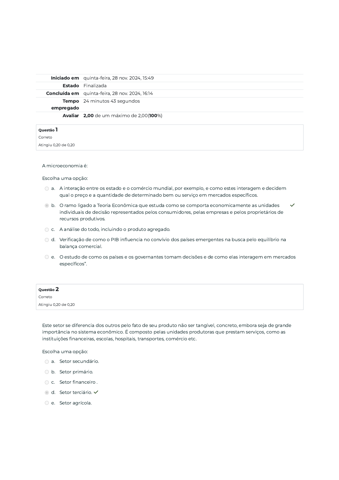 28/11/2024 ATIVIDADE ONLINE 1 - AV12024/4: Revisão da tentativa | Graduação EAD https://ava.graduacaoead.unicv.edu.br/mod/quiz/review.php?attempt=4732386&cmid=223002 1/6 Iniciado em quinta-feira, 28 nov. 2024, 15:49 Estado Finalizada Concluída em quinta-feira, 28 nov. 2024, 16:14 Tempo empregado 24 minutos 43 segundos Avaliar 2,00 de um máximo de 2,00(100%) Questão 1 Correto Atingiu 0,20 de 0,20 Questão 2 Correto Atingiu 0,20 de 0,20 A microeconomia é: Escolha uma opção: a. A interação entre os estado e o comércio mundial, por exemplo, e como estes interagem e decidem qual o preço e a quantidade de determinado bem ou serviço em mercados especí�cos. b. O ramo ligado a Teoria Econômica que estuda como se comporta economicamente as unidades individuais de decisão representados pelos consumidores, pelas empresas e pelos proprietários de recursos produtivos. ✓ c. A análise do todo, incluindo o produto agregado. d. Veri�cação de como o PIB in�uencia no convívio dos países emergentes na busca pelo equilíbrio na balança comercial. e. O estudo de como os países e os governantes tomam decisões e de como elas interagem em mercados especí�cos”. Este setor se diferencia dos outros pelo fato de seu produto não ser tangível, concreto, embora seja de grande importância no sistema econômico. É composto pelas unidades produtoras que prestam serviços, como as instituições �nanceiras, escolas, hospitais, transportes, comércio etc. Escolha uma opção: a. Setor secundário. b. Setor primário. c. Setor �nanceiro . d. Setor terciário. ✓ e. Setor agrícola. 28/11/2024 ATIVIDADE ONLINE 1 - AV12024/4: Revisão da tentativa | Graduação EAD https://ava.graduacaoead.unicv.edu.br/mod/quiz/review.php?attempt=4732386&cmid=223002 2/6 Questão 3 Correto Atingiu 0,20 de 0,20 Questão 4 Correto Atingiu 0,20 de 0,20 Assinale a alternativa referente ao grá�co abaixo: Escolha uma opção: a. Demanda negativa e oferta positiva. b. Demanda. c. Oferta. d. Equilíbrio de mercado. ✓ e. Elasticidade. Com relação a demanda, assinale a única alternativa correta: Escolha uma opção: a. Quando o preço diminui, a quantidade demandada do bem também diminui. b. Embora tendam a ser utilizados como sinônimo existe distinção entre demanda e quantidade demandada, esses termos têm signi�cados diferentes. ✓ c. Essa relação entre preço e quantidade demandada não se aplica à maioria dos bens existentes na economia. d. Embora não seja universal, os economistas a chamam lei da demanda: com tudo o mais mantido constante. e. Quando o preço de um bem aumenta, a quantidade demandada deste também aumenta. 28/11/2024 ATIVIDADE ONLINE 1 - AV12024/4: Revisão da tentativa | Graduação EAD https://ava.graduacaoead.unicv.edu.br/mod/quiz/review.php?attempt=4732386&cmid=223002 3/6 Questão 5 Correto Atingiu 0,20 de 0,20 Questão 6 Correto Atingiu 0,20 de 0,20 Ao empregar o uso da hipótese ceteris paribus: I. Está sendo a�rmado que o foco de estudo é dirigido apenas aquele mercado, analisando-se o papel que a oferta e a demanda nele exercem, supondo que outras variáveis inter�ram muito pouco, ou que não inter�ram de maneira absoluta. II. Tudo o mais permanece constante. III. Isto signi�ca que a validade das leis e dos modelos econômicos implica que sejam mantidos constantes todos os demais fatores que podem interferir nas magnitudes das variáveis sob observação. Está correto o que se a�rma apenas em: Escolha uma opção: a. I, II e III. ✓ b. II e III, apenas. c. II, apenas. d. I e III, apenas. e. I e II, apenas. Avalie as a�rmações a seguir: I. Por demanda entende-se toda a escala ou curva que relaciona os possíveis preços a determinadas quantidades. II. Por quantidade demandada devemos entender um ponto especí�co da curva relacionando um preço a uma quantidade. III. Lei da demanda re�ete a visão do produtor, quanto maior o preço do bem, menos será disponibilizado no mercado. Está correto apenas o que se a�rma em: Escolha uma opção: a. II e III, apenas. b. II, apenas. c. I e II, apenas. ✓ d. I e III, apenas. e. III, apenas. 28/11/2024 ATIVIDADE ONLINE 1 - AV12024/4: Revisão da tentativa | Graduação EAD https://ava.graduacaoead.unicv.edu.br/mod/quiz/review.php?attempt=4732386&cmid=223002 4/6 Questão 7 Correto Atingiu 0,20 de 0,20 Questão 8 Correto Atingiu 0,20 de 0,20 De acordo com a teoria macroeconômica, assinale a opção correta: Escolha uma opção: a. Importa-se com o consumidor e a análise de procura. b. Importa-se com a empresa e a análise da oferta. c. Estrutura concorrencial e equilíbrio dos mercados. d. A condução do processo econômico considerado como um todo. ✓ e. Foco na remuneração dos fatores de produção e estrutura de repartição da renda. De acordo com as de�nições de demanda ou procura avalie as a�rmativas a seguir: I. A quantidade de um determinado bem ou serviço que os consumidores desejam adquirir em determinado período de tempo. II. A quantidade de determinado bem ou serviço que os consumidores desejam adquirir, num dado período, dada sua renda, seus gastos e o preço de mercado. Representa um desejo, um plano: o máximo a que o consumidor pode aspirar, dada sua renda e os preços no mercado. III. A procura depende de variáveis que in�uenciam a escolha do consumidor. São elas: o preço do bem ou serviço, o preço de outros bens, a renda do consumidor e o gosto ou preferência do indivíduo. Para estudar-se a in�uência dessas variáveis utiliza-se a hipótese do coeteris paribus (Ceteris paribus), ou seja, considera-se cada uma dessas variáveis afetando separadamente as decisões do consumidor. Está correto apenas o que se a�rma em: Escolha uma opção: a. II e III, apenas. b. I, apenas. c. I, II e III. ✓ d. III, apenas. e. II, apenas. 28/11/2024 ATIVIDADE ONLINE 1 - AV12024/4: Revisão da tentativa | Graduação EAD https://ava.graduacaoead.unicv.edu.br/mod/quiz/revie