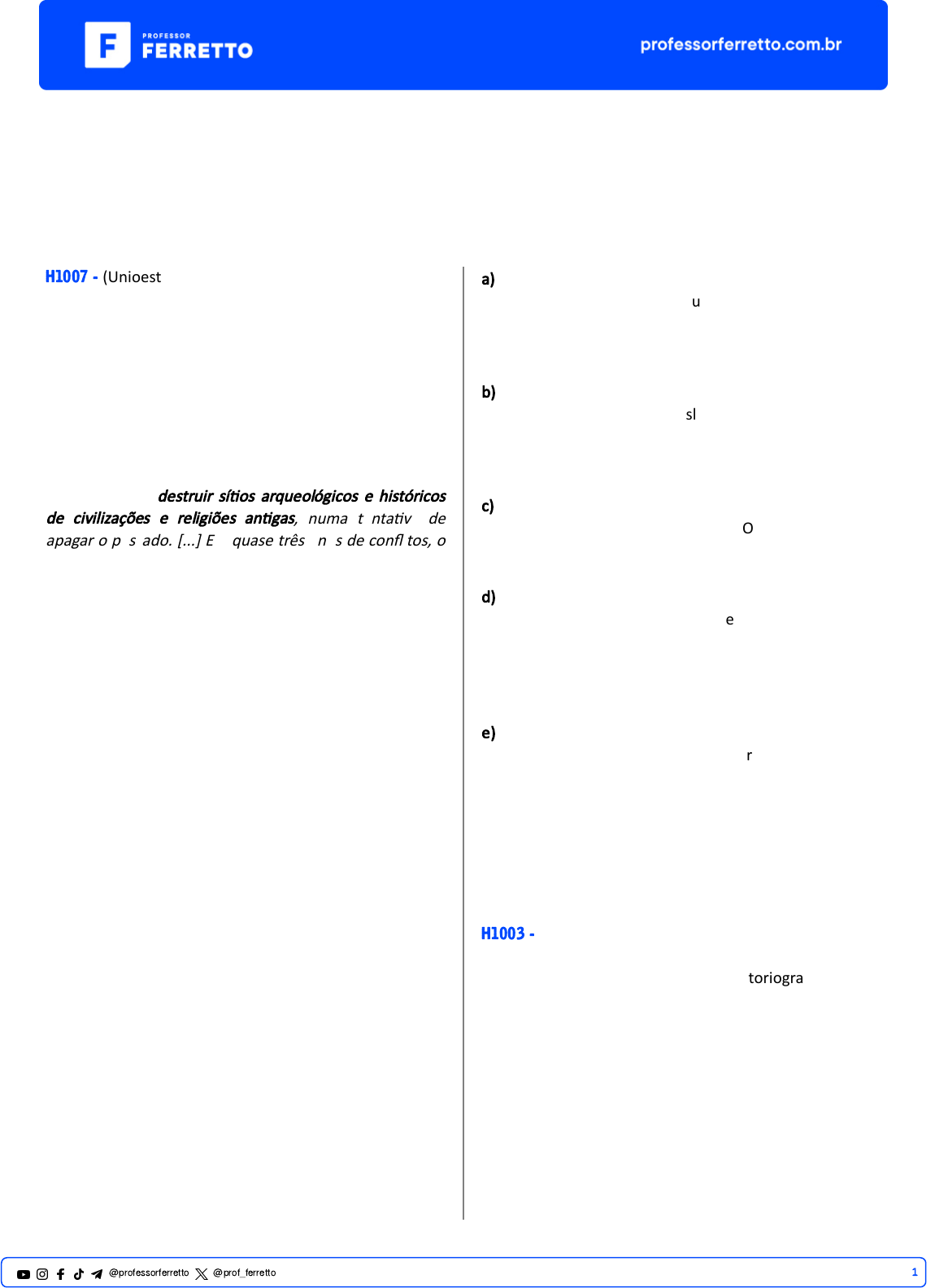 Vestibulares Historiografia H1007 - (Unioeste) Leia e analise o fragmento abaixo Desde 2013, o autoproclamado Estado Islâmico do Iraque e do Levante – também conhecido pelas siglas ISIL ou ISIS, na tradução do nome do grupo em inglês – luta pela conquista de territórios na Síria e no Iraque, travando uma guerra que já deixou mais de 230 mil mortos e milhões de desabrigados. [...] Para afirmar a superioridade do Islamismo, o Estado Islâmico tem se esforçado para destruir sí�os arqueológicos e históricos de civilizações e religiões an�gas, numa tenta�va de apagar o passado. [...] Em quase três anos de conflitos, o ISIS destruiu, pelo menos, treze sí�os arqueológicos ou ruínas históricas. ALENCAR, Lucas. Treze locais históricos destruídos pelo Estado Islâmico. 04 jan. 2016. Disponível em: h�ps://revistagalileu.globo.com/Sociedade/no�cia/2016/01/13- locais- historicos-destruidos-pelo-estado-islamico.html Ao tratarmos de evidências e procedimentos para análise de processos históricos, é CORRETO afirmar que a) a análise histórica não necessita dessas evidências, já que elas eram apenas u�lizadas como foco de visitação turís�ca. Pois, o material necessário para a reflexão histórica encontra-se registrado em documentos impressos e arquivos públicos. b) a destruição desses registros históricos não faz parte do modo como o Estado Islâmico propõe impor certa leitura da história a par�r dos seus interesses e domínio, esses atos foram realizados por erro de alvos durante os ataques realizados. c) a destruição dos sí�os arqueológicos e históricos se deve apenas a um conflito no Oriente Médio em função das prá�cas religiosas e à intolerância pela intervenção estrangeira. d) prá�cas como as realizadas pelo Estado Islâmico, ao destruírem sí�os arqueológicos e históricos, destacam como o debate sobre memória e história faz parte das disputas de poder, inclusive, como tenta�va de imposição de certo nacionalismo como controle do presente e do passado para intenções futuras. e) as fontes são materiais importantes na inves�gação histórica acadêmica. O historiador se u�liza desses indícios para aprofundar pesquisas; com destaque para períodos, fatos e sujeitos. Porém, o uso de sí�os arqueológicos e históricos são desnecessários ao ensino de história, por isso podem ser facilmente descartados. H1003 - (Ufu) O estudo e a escrita da História realizados por pesquisadores são chamados de historiografia. Essa é feita com base em pesquisa de documentos e na interpretação desses documentos pautados em teorias e métodos dos mais diversos, que criam sen�dos e relações entre o passado e o presente. Em relação a essas informações, assinale a alterna�va correta. 1@professorferretto @prof_ferretto a) O elemento central da pesquisa histórica é a opinião do historiador, pautada em sua convicção polí�ca e par�dária. b) O marxismo é a principal linha interpreta�va que guia a historiografia contemporânea. c) O que orienta a pesquisa histórica são as perguntas, ou os problemas, formulados em nosso próprio tempo a par�r dos documentos disponíveis para a construção do conhecimento. d) Uma vez que a pesquisa histórica está relacionada com o contexto do historiador, afirma-se que a História é uma ciência sem método. H1022 - (Uern) É impossível compreender seu tempo para quem ignora todo o passado. Ser uma pessoa contemporânea e também ter consciência das heranças, consen�das ou contestadas. (René Remond. in Bi�encourt, C.Ensino da História. Fundamentos e métodos. São Paulo: Cortez. 2004. p. 155.) A história tem um caráter instrumental para a compreensão das experiências sociais, culturais, tecnológicas, polí�cas e econômicas da humanidade ao longo do tempo. Sobre o papel da história na formação da cidadania, assinale a alterna�va correta. a) O ensino da história não apenas contribui para o desenvolvimento da consciência, mas dá suporte à construção da própria iden�dade do indivíduo. b) No decorrer dos períodos históricos, a fundamentação teórica que incita a obediência às leis foi a principal contribuição da história na formação cidadã. c) A história, em uma visão contemporânea, passou a ter como prioridade o estudo do presente, dando ao passado um caráter arcaico e an�quado, dispensável à pesquisa histórica. d) A história como ciência básica e fundamentalmente teórica incide de forma rela�va e tênue nas a�vidades prá�cas da vida humana, tendo, portanto, neutralidade em relação à polí�ca. H1009 - (Udesc) O conhecimento histórico acadêmico ou cien�fico é construído, prioritariamente, por meio de prá�cas de inves�gação e análise. Para a construção do conhecimento histórico, as fontes ou ves�gios são, portanto, elementos fundamentais. Analise os itens abaixo, e coloque (V) para o que for fonte histórica e (F) para o que não for fonte histórica. (__) Jornais e Revistas (__) Fotografias (__) Documentos oficiais de Estado (__) Cartas e documentos pessoais Assinale a alterna�va correta, de cima para baixo. a) V – V – V – V b) V – F – F – F c) F – V – V – V d) V – V – F – F e) F – V – V – F H1004 - (I�a) A História é uma ciência, que estuda os seres humanos em diferentes épocas. O historiador é o pesquisador responsável pela construção do conhecimento histórico. Para isso, ele u�liza as fontes históricas. A respeito das fontes históricas, é correto afirmar que: I. As fontes materiais são registros como: documentos oficiais e privados, livros, pinturas, construções, roupas etc. II. Entre as fontes imateriais, podemos destacar os relatos orais, músicas, danças e festas. III. A importância de uma fonte histórica independe do olhar do pesquisador, do tempo e do espaço em que ele se encontra. Assinale a alterna�va que ap