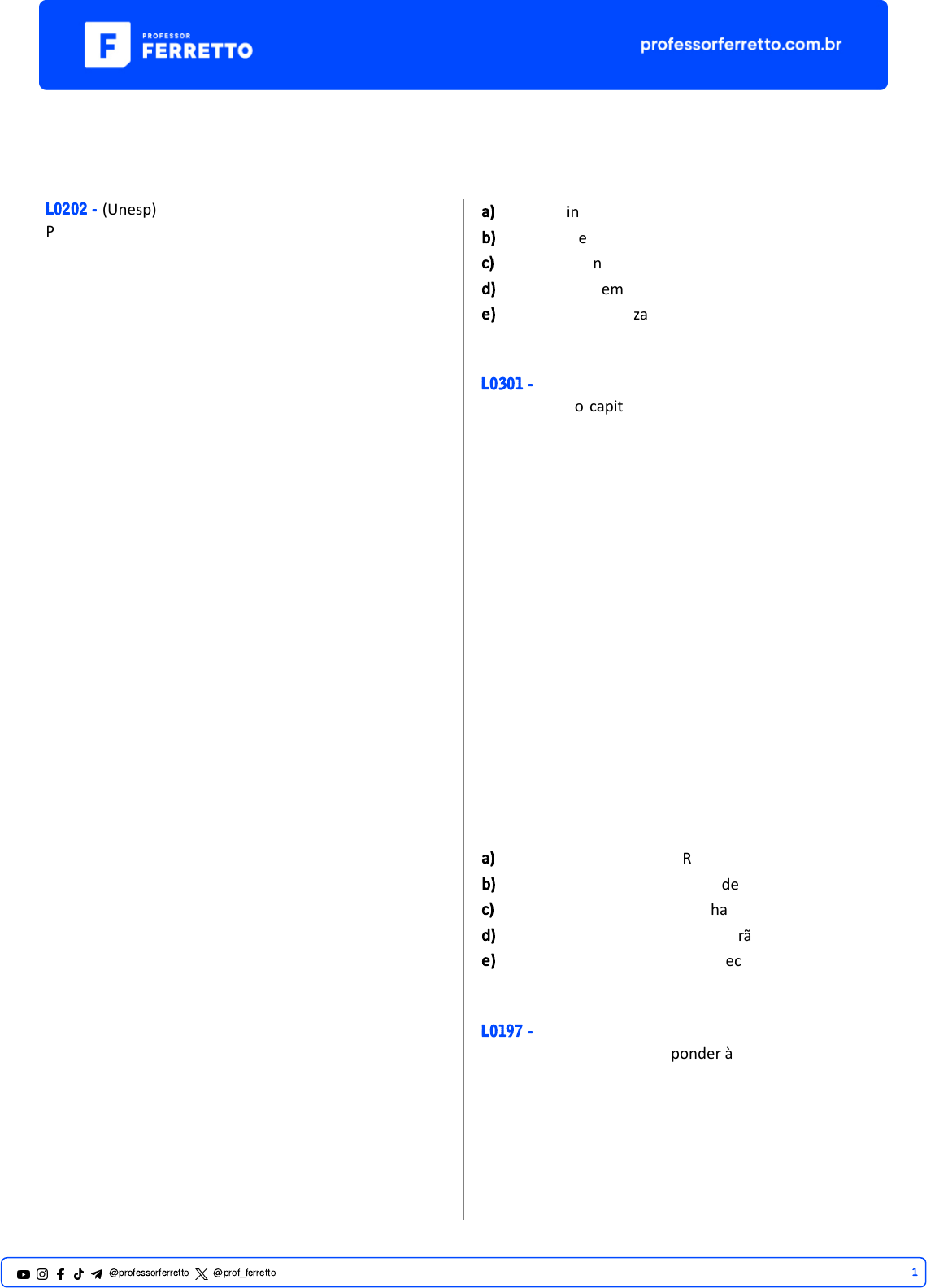 Modernismo - Segunda Fase - Prosa L0202 - (Unesp) Para responder à questão a seguir, leia o fragmento de um romance de Érico Veríssimo (1905-1975). O defunto dominava a casa com a sua presença enorme. Anoitecia, e os homens que cercavam o morto ali na sala ainda não se haviam habituado ao seu silêncio espesso. Fazia um calor opressivo. Do quarto con�guo vinham soluços sem choro. Pareciam pedaços arrancados dum grito de dor único e descomunal, davam uma impressão de dilaceramento, de agonia sincopada. As velas ardiam e o cheiro da cera derre�da se casava com o perfume adocicado das flores que cobriam o caixão. A mistura enjoa�va inundava o ar como uma emanação mesma do defunto, entrava pelas narinas dos vivos e lhes dava a sensação desconfortante duma comunhão com a morte. O velho calvo que estava a um canto da sala, voltou a cabeça para o militar a seu lado e cochichou: — Está fazendo falta aqui é o Tico, capitão. O oficial ainda não conhecia o Tico. Era novo na cidade. Então o velho explicou. O Tico era um sujeito que sabia animar os velórios, contava histórias, �nha um jeito especial de levar a conversa, deixando todo o mundo à vontade. Sem o Tico era o diabo... Por onde andaria aquela alma? Entrou um homem magro, alto, de preto. Cumprimentou com um aceno discreto de cabeça, caminhou devagarinho até o cadáver e ergueu o lenço branco que lhe cobria o rosto. Por alguns segundos fitou na cara morta os olhos tristes. Depois deixou cair o lenço, afastou-se enxugando as lágrimas com as costas das mãos e entrou no quarto vizinho. O velho calvo suspirou. — Pouca gente... O militar passou o lenço pela testa suada. — Muito pouca. E o calor está brabo. — E ainda é cedo. O capitão �rou o relógio: faltava um quarto para as oito. (Um lugar ao sol, 1978.) A capacidade de animar os velórios é atribuída ao Tico pelo velho calvo, porque este a considera a) um meio inadequado de ganhar a vida. b) conveniente para aliviar as tensões naquela situação. c) inapropriada naquela situação social. d) desrespeitosa em face da tristeza geral. e) um modo de enfa�zar as virtudes do morto. L0301 - (Unesp) Sem dúvida, o capital não tem pátria, e é esta uma das suas vantagens universais que o fazem tão a�vo e irradiante. Mas o trabalho que ele explora tem mãe, tem pai, tem mulher e filhos, tem língua e costumes, tem música e religião. Tem uma fisionomia humana que dura enquanto pode. E como pode, já que a sua situação de raiz é sempre a de falta e dependência. Narrar a necessidade é perfazer a forma do ciclo. Entre a consciência narradora, que sustém a história, e a matéria narrável, sertaneja, opera um pensamento desencantado, que figura o co�diano do pobre em um ritmo pendular: da chuva à seca, da folga à carência, do bem-estar à depressão, voltando sempre do úl�mo estado ao primeiro. É a narração, que se quer obje�va, da modés�a dos meios de vida registrada na modés�a da vida simbólica. (Alfredo Bosi. Céu, inferno: ensaios de crí�ca literária e ideológica, 2003. Adaptado.) O comentário aplica-se com precisão à obra a) Vidas secas, de Graciliano Ramos. b) Macunaíma, de Mário de Andrade. c) Os sertões, de Euclides da Cunha. d) Grande sertão: veredas, de Guimarães Rosa. e) A hora da estrela, de Clarice Lispector. L0197 - (Fuvest) Leia o texto abaixo para responder à questão Omolu espalhara a bexiga na cidade. Era uma vingança contra a cidade dos ricos. Mas os ricos �nham a vacina, que sabia Omolu de vacinas? Era um pobre deus das florestas d’África. Um deus dos negros pobres. Que podia saber de vacinas? Então a bexiga desceu e assolou o povo de Omolu. Tudo que Omolu pôde fazer foi transformar a 1@professorferretto @prof_ferretto bexiga de negra em alastrim, bexiga branca e tola. Assim mesmo morrera negro, morrera pobre. Mas Omolu dizia que não fora o alastrim que matara. Fora o 1lazareto. Omolu só queria com o alastrim marcar seus filhinhos negros. O lazareto é que os matava. Mas as macumbas pediam que ele levasse a bexiga da cidade, levasse para os ricos la�fundiários do sertão. Eles �nham dinheiro, léguas e léguas de terra, mas não sabiam tampouco da vacina. O Omolu diz que vai pro sertão. E os negros, os ogãs, as filhas e pais de santo cantam: Ele é mesmo nosso pai e é quem pode nos ajudar... Omolu promete ir. Mas para que seus filhos negros não o esqueçam avisa no seu cân�co de despedida: Ora, adeus, ó meus filhinhos, Qu’eu vou e torno a vortá... E numa noite que os atabaques ba�am nas macumbas, numa noite de mistério da Bahia, Omolu pulou na máquina da Leste Brasileira e foi para o sertão de Juazeiro. A bexiga foi com ele. Jorge Amado, Capitães da Areia. 1lazareto: estabelecimento para isolamento sanitário de pessoas a�ngidas por determinadas doenças. Considere as seguintes afirmações referentes ao texto de Jorge Amado: I. Do ponto de vista do excerto, considerado no contexto da obra a que pertence, a religião de origem africana comporta um aspecto de resistência cultural e polí�ca. II. Fica pressuposta no texto a ideia de que, na época em que se passa a história nele narrada, o Brasil ainda conservava formas de privação de direitos e de exclusão social advindas do período colonial. III. Os contrastes de natureza social, cultural e regional que o texto registra permitem concluir corretamente que o Brasil passou por processos de modernização descompassados e desiguais. Está correto o que se afirma em a) I, somente. b) II, somente. c) I e II, somente. d) II e III, somente. e) I, II e III. L0200 - (Unicamp) Que dizer das personagens? Creio que têm a força e ao mesmo tempo a fraqueza da caricatura. Mas, pensando melhor, não poderemos também alegar em defesa do romancista que a caricatura é uma tendência reconhecida e aceita da arte moderna, principalmente da pintura? Não haverá muito de deformação na obra de grandes pintores c