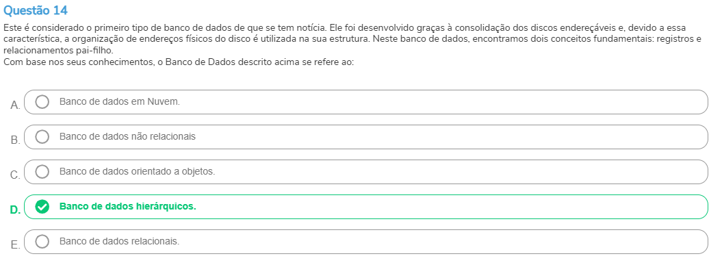 Questão 14 Este é considerado primeiro tipo de banco de dados de que se tem Ele foi desenvolvido graças à consolidação dos discos endereçáveis e, devido a essa a organização de endereços físicos do disco é utilizada na sua Neste banco de dados, encontramos dois conceitos fundamentais: registros e relacionamentos pai-filho. Com base nos seus conhecimentos, Banco de Dados descrito acima se refere ao: A. Banco de dados em Nuvem B. Banco de dados não relacionais C. Banco de dados orientado a objetos. D. Banco de dados hierárquicos. E. Banco de dados