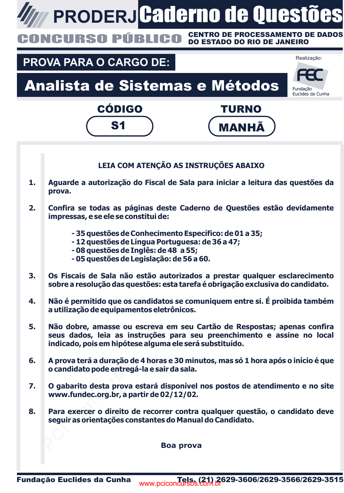 pcimarkpci MDAwMDowMDAwOjAwMDA6MDAwMDowMDAwOmZmZmY6ZDEwZTo0NDc4:RnJpLCAyOSBOb3YgMjAyNCAwNDowMToxNCAtMDMwMA== www.pciconcursos.com.br Fundação Euclides da Cunha Tels. (21) 2629-3606/2629-3566/2629-3515 PRODERJ CENTRO DE PROCESSAMENTO DE DADOS DO ESTADO DO RIO DE JANEIRO Caderno de Questões CONCURSO PÚBLICO LEIA COM ATENÇÃO AS INSTRUÇÕES ABAIXO 1. Aguarde a autorização do Fiscal de Sala para iniciar a leitura das questões da prova. 2. Confira se todas as páginas deste Caderno de Questões estão devidamente impressas, e se ele se constitui de: - 35 questões de Conhecimento Específico: de 01 a 35; - 12 questões de Língua Portuguesa: de 36 a 47; - 08 questões de Inglês: de 48 a 55; - 05 questões de Legislação: de 56 a 60. 3. Os Fiscais de Sala não estão autorizados a prestar qualquer esclarecimento sobre a resolução das questões: esta tarefa é obrigação exclusiva do candidato. 4. Não é permitido que os candidatos se comuniquem entre si. É proibida também a utilização de equipamentos eletrônicos. 5. Não dobre, amasse ou escreva em seu Cartão de Respostas; apenas confira seus dados, leia as instruções para seu preenchimento e assine no local indicado, pois em hipótese alguma ele será substituído. 6. A prova terá a duração de 4 horas e 30 minutos, mas só 1 hora após o início é que o candidato pode entregá-la e sair da sala. 7. O gabarito desta prova estará disponível nos postos de atendimento e no site www.fundec.org.br, a partir de 02/12/02. 8. Para exercer o direito de recorrer contra qualquer questão, o candidato deve seguir as orientações constantes do Manual do Candidato. Boa prova PROVA PARA O CARGO DE: TURNOCÓDIGO MANHÃS1 Realização: Analista de Sistemas e Métodos www.pciconcursos.com.br pcimarkpci MDAwMDowMDAwOjAwMDA6MDAwMDowMDAwOmZmZmY6ZDEwZTo0NDc4:RnJpLCAyOSBOb3YgMjAyNCAwNDowMToxNCAtMDMwMA== www.pciconcursos.com.br Fundação Euclides da Cunha Tels. (21) 2629-3606/2629-3566/2629-3515 CONHECIMENTO ESPECÍFICO 01) Sobre segurança de redes de computadores, marque V (Verdadeira) ou F (Falsa) nas afirmativas abaixo: ( ) Antes de realizar um ataque bem sucedido a uma rede de computadores, o invasor precisa executar três passos fundamentais: footprinting, que é a coleta de informações sobre a segurança da rede; a varredura, que determina quais são os sistemas que poderão ser atingidos; e a enumeração, que é a extração de contas válidas ou recursos compartilhados mal protegidos. ( ) A varredura de portas é usada para enviar pacotes para um sistema alvo, de forma a obter uma resposta e identificar se o sistema está ativo ou não. A varredura ping é o processo que determina quais serviços estão em execução ou no estado de escuta, permitindo que o sistema operacional e os aplicativos em uso sejam descobertos pelo atacante. ( ) Os firewalls de pacotes de filtragem utilizam as Listas de Controle de Acesso (ACLs - Access Control Lists) ou regras para determinar se o tráfego está autorizado a passar do ambiente externo para o interior da rede ou do interior da rede para o ambiente externo. ( ) O tunelamento ICMP é a tecnologia que permite o empacotamento de dados reais em um cabeçalho ICMP. Os roteadores e firewalls que fazem uso desta técnica estão mais protegidos dos ataques UDP. A opção com as letras na ordem correta é: A) V V V F; B) V F F F; C) V F V F; D) F F V V; E) F F F V. 02) Leia com atenção as afirmativas sobre segurança de redes de computadores abaixo: I - O Cavalo de Tróia é um programa que simula ser uma ferramenta de software útil, mas que, quando instalada, causa danos ao sistema operacional. Como exemplo deste programa temos o ROOTKITS. II - A utilização do antivírus atualizado, a instalação dos programas de correção (patches) do sistema operacional e a correta configuração do correio eletrônico são medidas de segurança que previnem a organização contra a engenharia social. III - O consumo da largura de banda e as falhas na programação são exemplos de ataques de recusa de serviço (DoS - Deny of Service). IV - Os protocolos de roteamento RIP e BGP fornecem autenticação segura, o que dificulta aos atacantes as manipulações nas tabelas de roteamento. V - O ataque do tipo inanição de recursos consiste em consumir todos os recursos de uma rede de computadores, impedindo o uso de impressoras compartilhadas e a transferência de arquivos. Das afirmativas acima, estão corretas: A) I - II - IV; B) I - III - IV; C) II - III - V; D) I - III; E) II - V. 03) Considerando que as camadas do modelo OSI contribuem para a segurança de redes de computadores, leia as informações abaixo quanto às ações a serem executadas em cada uma das camadas: I - Física: os grampos podem ser anulados, mantendo-se as linhas em tubos lacrados. Será disparado um alarme, no caso de um dos tubos ser perfurado. II - Enlace: os pacotes de uma linha ponto-a-ponto podem ser codificados à medida que saem da origem e decodificados quando entram em outro sistema. III - Rede: utiliza-se a criptografia de conexões fim-a- fim, o que ameniza os problemas da autenticação e da não-repudiação. IV- Transporte: os firewalls são instalados para manter ou descartar pacotes e são classificados em três categorias: filtros de pacotes, gateways de circuitos e gateways de aplicação. Estão corretas as informações: A) I - III - IV; B) II - III - IV; C) III - IV; D) II - IV; E) I - II. 04) A camada de apresentação do modelo de referência OSI tem as seguintes funções: A) permite que computadores com diferentes representações se comuniquem e preocupa-se com a forma como os usuários enxergam os dados; B) realiza a pesquisa de diretórios, operações com o correio eletrônico, entrada de tarefas remotas e transferência de arquivos; C) permite que um usuário estabeleça um login com um sistema remoto de tempo compartilhado; D) transforma um canal de transmissão bruto de dados em uma linha que pare