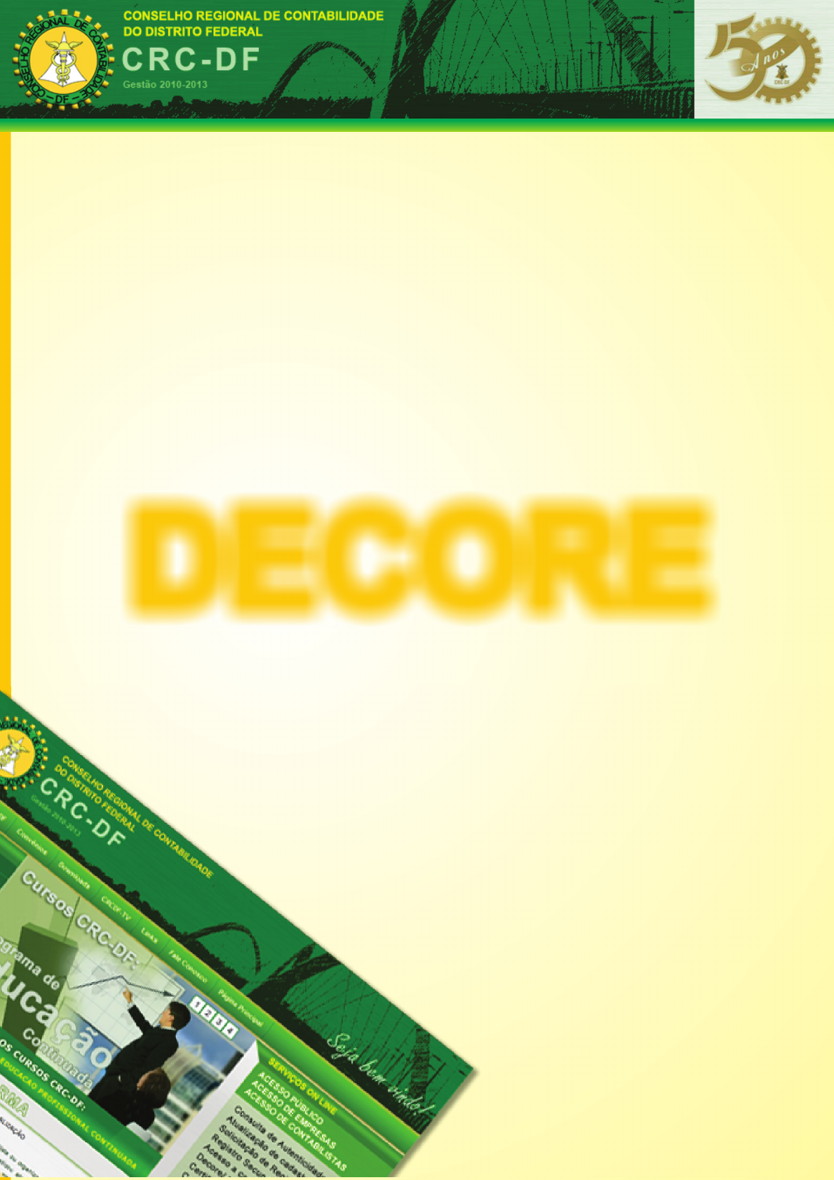Regional de Taguatinga Regional de Taguatinga Declaração Comprobatória de Perpepção de Rendimentos M anual do usuário DECOREDECORE Regional de Taguatinga Regional de Taguatinga O QUE É A DECORE? QUAIS OS DOCUMENTOS QUE DÃO SUPORTE AOS VALORES DECLARADOS E PODEM FUNDAMENTAR A EMISSÃO DA DECORE? Sim. A decore só pode ser emitida em modelo próprio obtido no site: www.crcdf;org.br acessando o ícone de Download. É documento contábil destinado a fazer prova de informação sobre percepção de rendimentos, em favor de pessoa física, conforme consta da Res. CFC nº 872/2000. Os exemplos dos documentos considerados hábeis e legais a emissão da Decore estão elencados no Anexo II da Res. CFC nº 872/00 e alterações introduzidas pela Res. CFC nº 1047/2005: I – Quando for proveniente de: 1. Retirada de pró-labore: � escrituração no livro diário 2. Distribuição de lucros: � escrituração no livro diário; � demonstrativo da distribuição. 3. Honorários (profissionais liberais/autônomos): � escrituração no livro caixa; � DARF do Imposto de Renda Pessoa Física (carnê - leão) com recolhimento regular; � RPA ou Recibo com o contrato de prestação de serviços. 4. Atividades rurais, extrativistas, etc.: � escrituração no livro caixa ou no livro diário; � nota de produtor; � recibo e contrato de arrendamento; � recibo e contrato de armazenagem; � recibo e contrato de prestação de serviço de lavração, safra, pesqueira, etc. APOSIÇÃO OBRIGATÓRIA DA ETIQUETA – DHP (Resolução CFC n.º 871/2000) DECLARAÇÃO COMPROBATÓRIA DE PERCEPÇÃO DE RENDIMENTOS – DECORE (Resolução CFC nº 872, de 23 de março de 2000) 01. BENEFICIÁRIO NOME CPF C.I. ORG. EXP. END. N.º BAIRRO CIDADE UF 02. RENDIMENTOS COMPROVADOS NATUREZA PERÍODO VALOR R$ ( ) DOCUMENTAÇÃO BASE (ESPECIFICAR) 03. FONTE PAGADORA NOME CNPJ/CPF VINCULAÇÃO 04. PROFISSIONAL DECLARANTE NOME CATEGORIA REG. CRC ORG. CONTÁBIL CAD.CRC 05. DECLARAÇÃO Declaramos para fins de direito perante o _________ __________________________________ e a quem interessar possa, sob as penas da lei, eecsipalmente, das previsões do artigo 299 do Código Penal Brasileiro e, no inciso XIII do artig o24 do Regulamento Geral dos Conselhos de Contabilidade – Resolução CFC nº 960/03, que as oinrfmações acima transcritas constituem a expressão da verdade. _________________-____, _____ de ____________ de __ _____ __________________________ _____________________________ Assinatura do Beneficiário Assinatura do Contabilista 5. Prestação de serviços diversos ou comissões: � escrituração no livro caixa; � escrituração do livro ISSQN; � RPA com contrato de prestação de serviço ou com declaração do pagador; � DARF do Imposto de Renda Pessoa Física (carnê leão), com recolhimento regular. 6. Aluguéis ou arrendamentos diversos: � contrato (particular ou público) com respectiva RPA ou Recibo; � escrituração no livro caixa, se for o caso; � DARF do Imposto de Renda Pessoa Física (carnê leão), com recolhimento regular. 7. Rendimento de aplicações financeiras: � extrato bancário ou resumo de aplicações. 8. Venda de bens imóveis, móveis, valores mobiliários, etc. � contrato de compra e venda, nota fiscal e escritura, etc. 9. Vencimentos de funcionário público, aposentados e pensionistas: � documento da entidade pagadora. HÁ FORMULÁRIO PRÓPRIO PARA FAZER DECORE? Regional de Taguatinga Regional de Taguatinga NOTAS • Quando o RPA for aceito para comprovação do rendimento, este deverá possuir em seu verso declaração do pagador atestando o pagamento do valor nele consignado ou, se for o caso, acompanhado do respectivo contrato de prestação de serviços. • Quando a DECORE referente ao exercício anterior for expedida, o contabilista poderá util izar-se da Declaração de Imposto de Renda do ano correspondente. • Quando eventualmente a DECORE for expedida com base em informação salarial, a mesma somente será fornecida aos empregados de cl ientes do contabilista, baseada na folha de pagamento. • Quando a comprovação for nota de produtor, esta deverá ser acompanhada da contranota. QUEM PODE EMITIR DECORE? Somente o Contador ou Técnico em Contabilidade, em situação regular perante o CRC/DF. Pessoas Físicas. O profissional da contabilidade pode emitir Decore para si mesmo, contudo, NÃO pode fazê-lo para pessoas físicas que sejam clientes de outros profissionais da Contabilidade. A Decore deve se fundamentar na escrituração do Livro Diário ou em documentos autênticos, quando for o caso. Quando a decore tiver como base documentos autênticos, antes de emitir a mesma, o profissional deve se certificar que esses são compatíveis como o valor a ser declarado e que são considerados hábeis e legais para os fins a que se destina. Para auxiliá-lo nesse mister o profissional conta com um rol EXEMPLIFICATIVO de documentos constantes do Anexo II da Res. CFC nº 872/2000, os quais deverão estar de sua posse no momento da emissão da Decore e mantidos a sua guarda, pelo prazo de 05 (cinco) anos, juntamente, com a segunda via da Decore, para fins de fiscalização do CRC/DF. A decore é gerada eletronicamente no site do CRCDF: www.crcdf.org.br, através do Serviços On- line, Decore/DHP. O profissional para utilizar tal serviço deverá obter a senha de acesso junto à sede do CRC/DF. Importante frisar, que o sistema NÃO permite o cancelamento de DECORE-Eletrônica. Quando necessário, deverá ser emitida uma nova DECORE, guardando--se a DECORE não utilizada juntamente com o “Termo de Cancelamento da Decore/DHP eletônica” que está disponível no site em Downloads, através da seleção do Campo Decore/DHP e após, na tela á direita, clicar no referido termo. Por meio da página do CRCDF – www.crcdf.org.br – Serviços ON-LINE - DECORE/DHP – Confirmar veracidade. Deverá ser registrada ocorrência policial ou publicação do fato