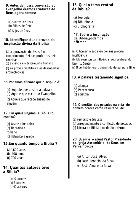 9. Antes de nossa conversão ao 15. Qual 0 tema central Evangelho éramos criaturas de da Deus,agora somos: (a) Teologia (a) Súditos de Deus (b) Bibliologia (b) Filhos de Deus (c) Bibliografia (c) Anjos de Deus 17. Sobre a inspiração 10. Identifique duas provas da da Biblia,podemos afirmar inspiração divina da Biblia: (a) a aprovação de Jesus é 0 (a) 0 homem a escreveu por sua própria cumprimento fiel das proféticas nela inteligência contidas (b) Ela resultou da influência sobrenatural do (b) a ciência e 0 testemunho humano Espirito Santo (c) as provas e as descobertas (c) 0 conteúdo era transmitido do pai para filho 18. A palavra testamento significa: 1.Podemos afirmar que é: (a) aliança (a) Aquele que ensina a palavra (b) Peotateuco (b) Aquele que escuta 0 Evangelho (c) epistola (c) Aquele que recebe ensino de 19. 0 perdão dos pecados na vida do homem ocorre como resultado de: 12. Em quais a foi escrita? (a) remorso é tristeza (a) Árabe e hebraico (b) arrependimento e confissão de pecados (b) Hebraico e (c) leitura da Biblia e medo do inferno romano (c) Hebraico e grego 20. Quem é atual Pastor Presidente 13.Em quanto tempo a ? da Igreja Assembléia de Deus em Pernambuco? (a) anos (b) 400 anos (c) 700 anos (a) Ailton José Alves (b) José da Silva 14. Quantos autores teve (c) José Amaro da Silva a Bíblia? (a) 10 autores (b) 2 autores (c) 40 autores