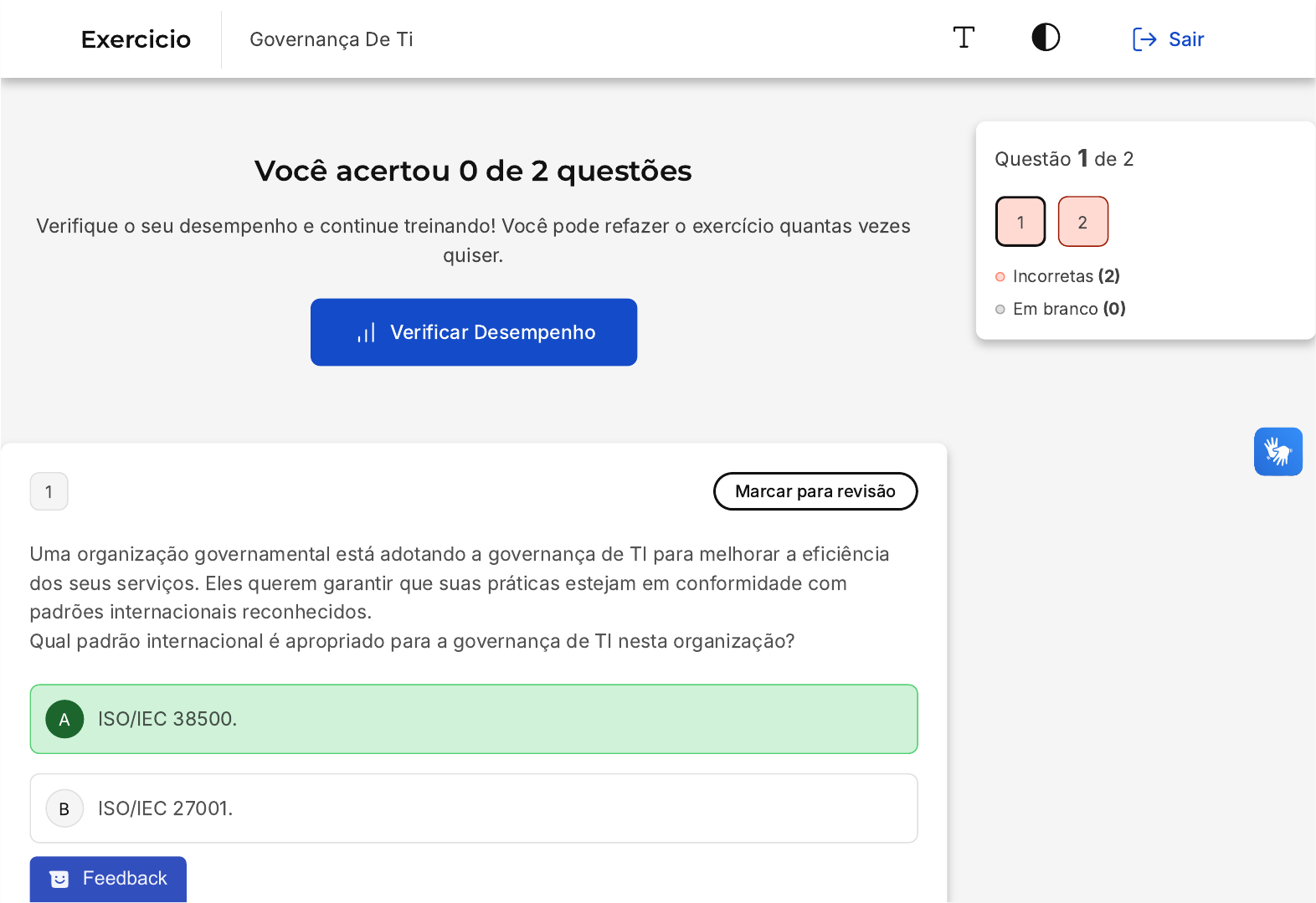 Você acertou 0 de 2 questões Verifique o seu desempenho e continue treinando! Você pode refazer o exercício quantas vezes quiser. Verificar Desempenho A B 1 Marcar para revisão Uma organização governamental está adotando a governança de TI para melhorar a eficiência dos seus serviços. Eles querem garantir que suas práticas estejam em conformidade com padrões internacionais reconhecidos. Qual padrão internacional é apropriado para a governança de TI nesta organização? ISO/IEC 38500. ISO/IEC 27001. Questão 1 de 2 Incorretas �2� Em branco �0� 1 2 Exercicio Governança De Ti Sair Feedback C D E ISO 9001. ISO/IEC 20000. ISO 31000. Resposta incorreta Opa! A alternativa correta é a letra A. Confira o gabarito comentado! Gabarito Comentado A ISO/IEC 38500 é um padrão internacional específico para a governança de TI. Ele fornece diretrizes para membros do conselho e executivos sobre como usar a TI de forma eficaz e responsável, o que se alinha com as necessidades da organização governamental. 2 Marcar para revisão Quais dos princípios abaixo de boa Governança de TI estão entre os princípios estabelecidos na norma NBR ISO/IEC 38500�2009? A B C D E Responsabilidade, Ética e Qualidade. Estratégia, Responsabilidade e Ética. Desempenho, Qualidade e Responsabilidade. Aquisição, Comportamento Humano e Conformidade. Responsabilidade, Ética e Estratégia. Resposta incorreta Opa! A alternativa correta é a letra D. Confira o gabarito comentado! Gabarito Comentado A alternativa correta é a "D", que menciona "Aquisição, Comportamento Humano e Conformidade". Esses são princípios estabelecidos na norma NBR ISO/IEC 38500�2009 para uma boa Governança de TI. A "Aquisição" se refere ao processo de obtenção de recursos de TI, o "Comportamento Humano" diz respeito à forma como as pessoas interagem com a tecnologia e a "Conformidade" está relacionada ao cumprimento das normas e regulamentos estabelecidos. Você acertou 0 de 6 questões Verifique o seu desempenho e continue treinando! Você pode refazer o exercício quantas vezes quiser. Verificar Desempenho A B 1 Marcar para revisão A utilidade de um serviço de TI é fundamental para garantir que ele atenda às necessidades e expectativas dos clientes e do negócio. Qual é a definição de utilidade de um serviço de TI, de acordo com a ITIL? Utilidade refere-se à capacidade de um serviço de TI de ser acessível 24 horas por dia, 7 dias por semana, garantindo que os usuários possam sempre acessar os recursos de que precisam. Utilidade é definida como a capacidade do serviço de TI em prevenir problemas e incidentes antes que eles ocorram, mantendo a estabilidade operacional. Questão 1 de 6 Incorretas �6� Em branco �0� 1 2 3 4 5 6 Exercicio Estratégia De Serviços Sair Feedback C D E Utilidade é a funcionalidade que um serviço de TI oferece para atender necessidades específicas, conforme percebido pelo cliente. É a capacidade de um serviço de TI de operar em múltiplas plataformas e dispositivos, oferecendo flexibilidade e adaptabilidade ao ambiente do usuário. Utilidade de um serviço de TI é a medida em que o serviço consegue manter seus custos operacionais abaixo do orçamento, contribuindo para a rentabilidade da organização. Resposta incorreta Opa! A alternativa correta é a letra C. Confira o gabarito comentado! Gabarito Comentado A utilidade de um serviço de TI, de acordo com a ITIL �Information Technology Infrastructure Library), refere-se à funcionalidade oferecida por esse serviço para atender a uma necessidade específica. Ela responde à pergunta O que o serviço faz? e está intrinsecamente relacionada à capacidade do serviço de satisfazer as demandas e os requisitos dos clientes. A utilidade está centrada nas características e nas funcionalidades do serviço que o tornam adequado para atender a finalidade desejada. 2 Marcar para revisão A B C D E O Gerenciamento Financeiro na ITIL desempenha um papel fundamental na gestão de recursos financeiros de TI. Ele permite que as organizações compreendam e controlem os custos, otimizem os investimentos em TI e demonstrem o valor dos serviços de TI para o negócio. Qual é o principal objetivo do Gerenciamento Financeiro na ITIL? O principal objetivo é reduzir os custos operacionais de TI ao mínimo absoluto, eliminando gastos desnecessários e cortando recursos. O objetivo principal é garantir que todos os investimentos em TI sejam direcionados exclusivamente para a segurança cibernética e a proteção de dados. O principal objetivo é assegurar que os recursos financeiros de TI sejam utilizados de maneira eficaz para suportar todos os aspectos das operações de TI. O principal objetivo é garantir a precisão na faturação dos serviços de TI, focando na cobrança dos clientes internos e externos. O principal objetivo do Gerenciamento Financeiro na ITIL é gerenciar os custos, otimizar o investimento em TI e demonstrar o valor dos serviços de TI para o negócio. Resposta incorreta Opa! A alternativa correta é a letra E. Confira o gabarito comentado! Gabarito Comentado A B C O Gerenciamento Financeiro é um dos processos chave da ITIL, que se concentra na gestão eficaz dos custos dos ativos de TI e dos recursos financeiros utilizados na prestação de serviços de TI. Esse processo é essencial para alinhar os serviços de TI com os objetivos estratégicos da organização e garantir que os recursos financeiros sejam alocados de forma eficiente e eficaz. 3 Marcar para revisão Uma empresa de tecnologia está implementando um novo sistema de gestão de projetos. O objetivo é aumentar a eficiência operacional, garantindo a entrega de projetos dentro do prazo e orçamento estipulados. A liderança opta por utilizar um framework de Governança de TI para orientar este processo. Qual framework de Governança de TI seria o mais adequado para a implementação do novo sistema de gestão de projetos? COBIT. I