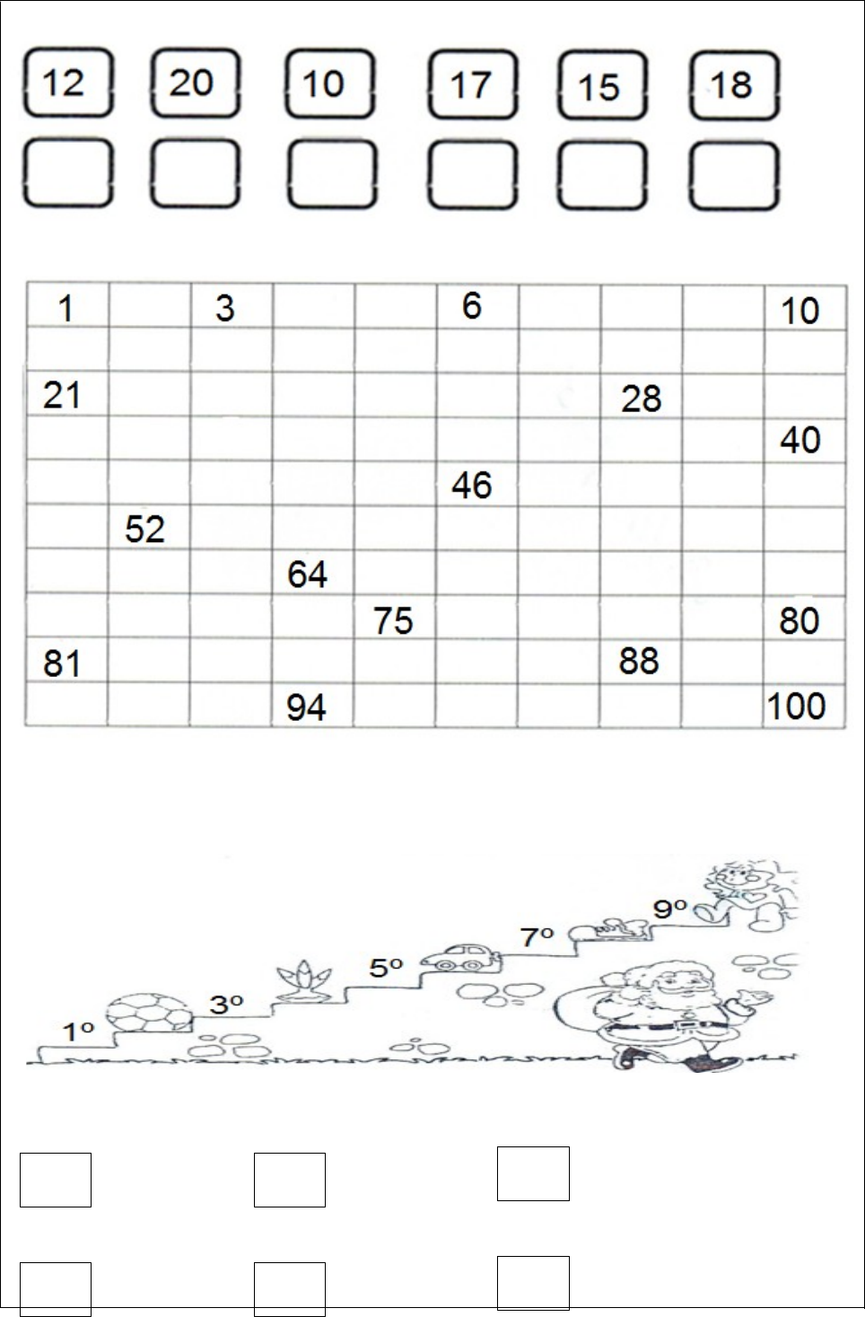 COLOQUE OS NUMERAIS EM ORDEM CRESCENTE: COMPLETE A SEQUÊNCIA: OBSERVE O DESENHO E MARQUE A RESPOSTA CERTA. · A BOLA ESTÁ NO: 1º DEGRAU 2º DEGRAU 3º DEGRAU · O CARRINHO ESTÁ NO: 4º DEGRAU 5º DEGRAU 6º DEGRAU image1.png image2.png image3.png