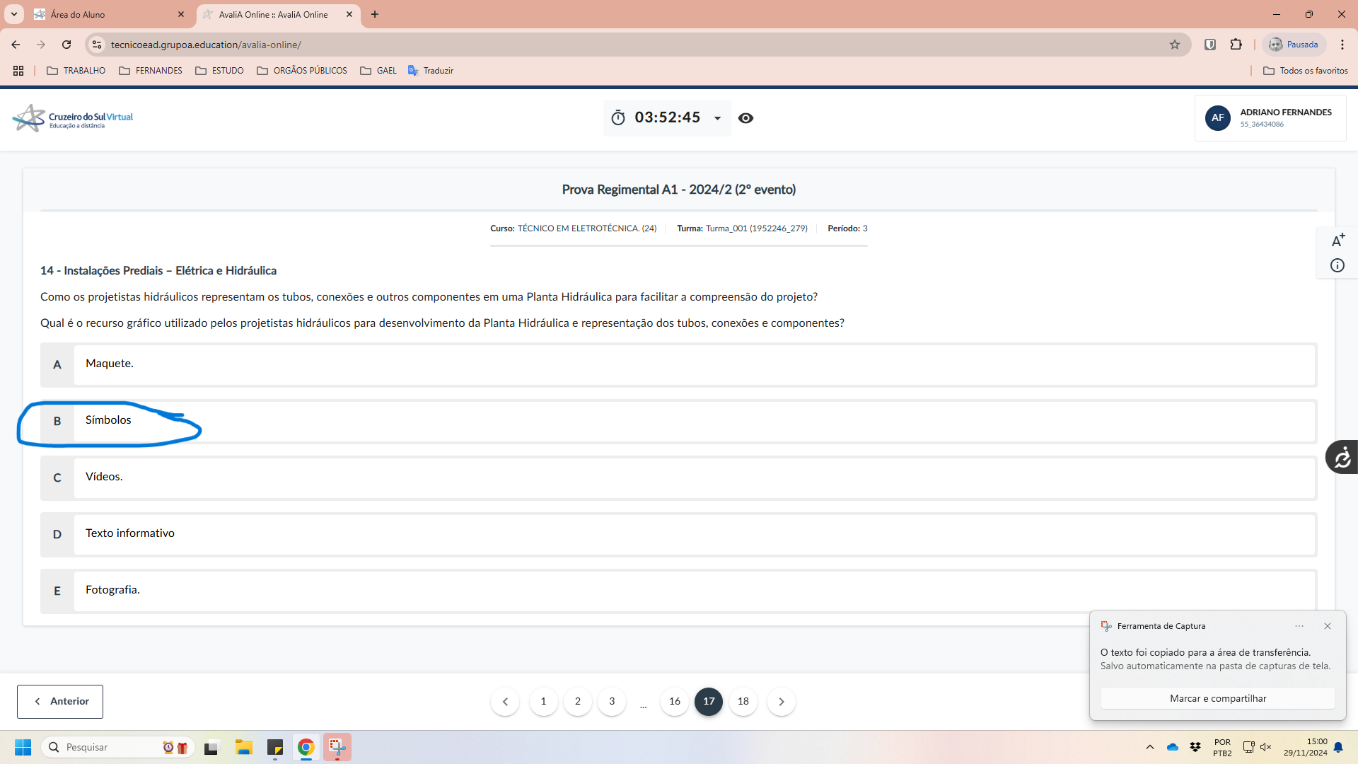 Área do Aluno x AvaliA Online AvaliA Online + Pausada : TRABALHO FERNANDES ESTUDO ORGÃOS PÚBLICOS GAEL Traduzir Todos os favoritos Cruzeiro do Sul Virtual 03:52:45 ADRIANO FERNANDES AF Educação distância 55 36434086 Prova Regimental A1 - 2024/2 (2° evento) Curso: TÉCNICO EM ELETROTÉCNICA (24) Turma: Turma_001 (1952246_279) Período: 3 A+ i 14 - Instalações Prediais - Elétrica e Hidráulica Como os projetistas hidráulicos representam os tubos, conexões e outros componentes em uma Planta Hidráulica para facilitar a compreensão do projeto? Qual é o recurso gráfico utilizado pelos projetistas hidráulicos para desenvolvimento da Planta Hidráulica e representação dos tubos, conexões e componentes? A Maquete. B Símbolos D Texto informativo E Fotografia. Ferramenta de Captura texto foi copiado para a área de Salvo automaticamente na pasta de capturas de tela. Marcar e compartilhar POR 15:00 Pesquisar O PTB2 29/11/2024