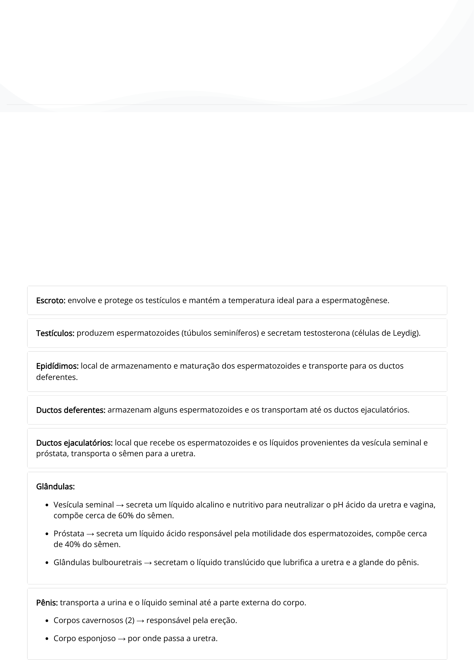 Nesta webaula, revisaremos as estruturas que fazem parte do sistema reprodutor masculino e as do sistema reprodutor feminino. Anatomo�siologia do sistema reprodutor Anatomia do sistema reprodutor masculino Sabemos que as estruturas que fazem parte do sistema reprodutor masculino são dois escrotos, dois testículos, ductos espermáticos, glândulas e uretra. Você sabe o conceito de cada um deles? Vamos a seguir de�nir cada um para você. Escroto: envolve e protege os testículos e mantém a temperatura ideal para a espermatogênese. Testículos: produzem espermatozoides (túbulos seminíferos) e secretam testosterona (células de Leydig). Epidídimos: local de armazenamento e maturação dos espermatozoides e transporte para os ductos deferentes. Ductos deferentes: armazenam alguns espermatozoides e os transportam até os ductos ejaculatórios. Ductos ejaculatórios: local que recebe os espermatozoides e os líquidos provenientes da vesícula seminal e próstata, transporta o sêmen para a uretra. Glândulas: Vesícula seminal → secreta um líquido alcalino e nutritivo para neutralizar o pH ácido da uretra e vagina, compõe cerca de 60% do sêmen. Próstata → secreta um líquido ácido responsável pela motilidade dos espermatozoides, compõe cerca de 40% do sêmen. Glândulas bulbouretrais → secretam o líquido translúcido que lubri�ca a uretra e a glande do pênis. Pênis: transporta a urina e o líquido seminal até a parte externa do corpo. Corpos cavernosos (2) → responsável pela ereção. Corpo esponjoso → por onde passa a uretra. Anatomo�isiologia do Corpo Humano Anatomo�isiologia do sistema reprodutor Você sabia que seu material didático é interativo e multimídia? Isso signi�ca que você pode interagir com o conteúdo de diversas formas, a qualquer hora e lugar. Na versão impressa, porém, alguns conteúdos interativos �cam desabilitados. Por essa razão, �que atento: sempre que possível, opte pela versão digital. Bons estudos! Uretra: Parte prostática. Parte membranácea. Parte esponjosa. Sistema reprodutor masculino Fonte: Silverthorn (2010, p. 839). Saiba mais O sêmen consiste nas secreções de líquidos provenientes dos túbulos seminíferos, vesículas seminais, próstata e glândulas bulbouretrais, portanto tem uma mistura de líquidos com espermatozoides. O volume de sêmen em uma ejaculação é de cerca de 5 ml, contendo de 15 a 150 milhões de espermatozoides por ml, portanto o homem é considerado infértil quando a contagem de espermatozoide é abaixo de 10 milhões/ml. Anatomia do sistema reprodutor feminino Sabemos que as estruturas que fazem parte do sistema reprodutor feminino: dois ovários, duas tubas uterinas, útero e vagina. Além de estudar sobre o ciclo menstrual, gravidez e gametogênese. Você sabe o conceito de cada um? Vamos apresentar seus conceitos a seguir: Ovário: local de produção de hormônios: estrógeno, progesterona, inibina e relaxina. Responsável pela ovogênese que ocorre durante o ciclo ovariano e menstrual. Tubas uterina: conduzem o ovócito secundário até o útero, têm células ciliadas. Útero: responsável pelo desenvolvimento do embrião e feto, realiza a expulsão do feto durante o parto. Estruturas: fundo, corpo e colo do útero. Paredes do útero: perimétrio, miométrio e endométrio. Vagina: responsável em receber o esperma através na penetração do pênis e é o canal do parto. Pudendo feminino ou vulva: Monte do púbis; Lábio maior e menor do pudendo; Clitóris; Vestíbulo da vagina; Glândulas vestibulares: responsáveis pela lubri�cação da vagina. Glândulas mamárias: produzem e ejetam o leite sob a ação dos hormônios prolactina e ocitocina. Sistema reprodutor feminino Fonte: adaptado de Silverthorn (2010, p. 845 e 860). Ciclo menstrual O ciclo menstrual acontece por ação dos hormônios folículo-estimulante (FSH) e luteinizante (LH). O ciclo é dividido em três fases: menstrual, proliferativa e secretória. Ciclo menstrual Fonte: Silverthorn (2010, p. 848). Gravidez É o processo em que o ovócito secundário é fertilizado pelo espermatozoide. Fases da gravidez: fertilização, divisão celular, formação do blastocisto maduro, implantação do blastocisto no endométrio. Hormônios importantes durante a gestação: Estrógeno: promove o crescimento da placenta. Progesterona: faz a manutenção do endométrio, aumenta o �uxo sanguíneo nas mamas e cavidade pélvica. Relaxina: relaxa as articulações e os ligamentos para o trabalho de parto. Gonadotro�na coriônica humana: responsável por manter o aumento da produção de estrógeno e progesterona. Ocitocina: promove a contração do útero e ejeção do leite após o nascimento do bebê. Prolactina: produção do leite. Gravidez Fonte: Curi e Procópio (2017, p. 797). Gametogênese Temos dois tipos de gametogênese: Ovogênese É o processo de síntese de ovócitos sob controle de hormônios liberados pela adeno-hipó�se. Ovogênese Fonte: Tortora (2012, p.1067). Espermatogênese É o processo de síntese de espermatozoides sob controle de hormônios liberados pela adeno-hipó�se. Espermatogênese Fonte: Tortora (2012, p. 1054). Menopausa Quando cessa a secreção hormonal ovariana. Início marcado pelo �m da fase reprodutiva da mulher. Ocorre frequentemente entre 45 e 55 anos, abaixo desta idade é considerada menopausa precoce. Menopausa Fonte: Shutterstock. Concluímos nossa webaula revisando a estrutura dos sistemas reprodutores masculino e feminino. Assista ao vídeo de encerramento e até a próxima unidade! Para visualizar o vídeo, acesse seu material digital.