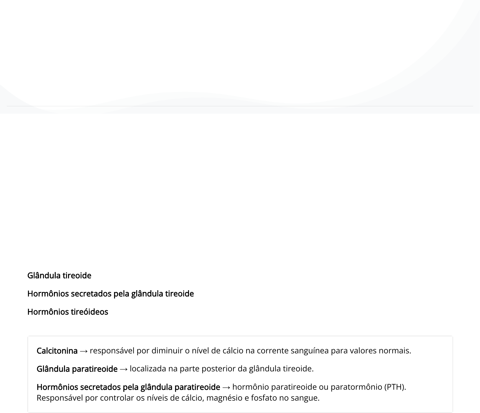 Nesta webaula apresentaremos a anatomia e a �siologia da glândula tireoide, da glândula adrenal, pâncreas e das glândulas sexuais que são controladas pelo sistema endócrino. Anatomo�siologia das glândulas endócrinas Vimos com detalhes a Anatomo�siologia da glândulas endócrinas. Para auxiliar em seus estudos, vamos apresentar os principais tópicos de cada assunto. Anatomo�siologia da glândula tireoide Glândula tireoide → localizada abaixo da laringe e em frente à traqueia. Hormônios secretados pela glândula tireoide → hormônios tireóideos e calcitonina. Hormônios tireóideos → a triiodotironina (T3) e a tetraiodotironina ou tiroxina (T4) controlados pelo eixo hipotálamo-hipó�se-tireoide. Responsáveis pela manutenção do metabolismo celular. Calcitonina → responsável por diminuir o nível de cálcio na corrente sanguínea para valores normais. Glândula paratireoide → localizada na parte posterior da glândula tireoide. Hormônios secretados pela glândula paratireoide → hormônio paratireoide ou paratormônio (PTH). Responsável por controlar os níveis de cálcio, magnésio e fosfato no sangue. Anatomo�isiologia do Corpo Humano Anatomo�isiologia das glândulas endócrinas Você sabia que seu material didático é interativo e multimídia? Isso signi�ca que você pode interagir com o conteúdo de diversas formas, a qualquer hora e lugar. Na versão impressa, porém, alguns conteúdos interativos �cam desabilitados. Por essa razão, �que atento: sempre que possível, opte pela versão digital. Bons estudos! Glândula Tireoide Fonte: adaptado de Tortora (2012, p. 638 e 641). Anatomo�siologia das glândulas adrenais Glândulas adrenais ou suprarrenais → localizadas acima dos rins, divididas em córtex e medula. Hormônios secretados pelo córtex da suprarrenal → glicocorticoides (cortisol), mineralocorticoides (aldosterona) e andrógenos (desidroepiandrosterona – DHEA). Controlados pelo eixo hipotálamo-hipó�se- suprarrenal. Ação anti-in�amatória, atua na manutenção do estresse diário. Hormônios secretados pela medula da suprarrenal → catecolaminas (epinefrina e noraepinefrina) são controlados pela ação do sistema simpático. Ativam a resposta luta-ou-fuga. Fonte: adaptado de Tortora (2012, p. 643 e 645). Saiba mais As glândulas endócrinas alteram o seu tamanho conforme envelhecemos. A glândula tireoide diminui a síntese dos hormônios tireóideos, gerando uma queda do metabolismo, assim, frequentemente, ocorre aumento de gordura corporal e hipotireoidismo; com a queda dos hormônios tireóideos na corrente sanguínea aumenta também o estímulo do eixo hipotálamo-hipó�se e como consequência acontece a secreção do hormônio estimulante da tireoide. O envelhecimento também altera os níveis de PTH sanguíneo, causando um aumento deste hormônio e uma diminuição considerável de calcitonina e, por este motivo, idosos �cam mais predispostos a desenvolverem osteoporose. Anatomo�siologia e funções do pâncreas Pâncreas → localizado atrás do estômago próximo à curvatura do duodeno (intestino delgado). Dividido em parte endócrina e exócrina. Hormônios secretados pelo pâncreas → insulina (célula beta), glucagon (célula alfa) e somatostatina (célula delta). Pâncreas Fonte: Tortora (2012, p. 648). Pesquise mais Vamos conhecer mais um pouco sobre a glândula tireoide e paratireoide no canal “Anatomia e etc”. com Natalia Reinecke no YouTube. Anatomo�siologia das glândulas sexuais Glândulas sexuais → localizadas nos sistemas reprodutores feminino e masculino. Responsáveis pela reprodução humana e pelas características sexuais de cada gênero. Gônada feminina → ovários. Hormônios secretados pelos ovários → estrógeno, progesterona, inibina e relaxina. Gônada masculina → testículos. Hormônios secretados pelos testículos → testosterona e inibina. Regulação e secreção dos hormônios femininos e masculinos Fonte: Adaptado de Tortora (2012, p. 1055 e 1078). Concluímos a nossa webaula. Você conheceu a anatomia e a �siologia da glândula tireoide, da glândula adrenal, pâncreas e das glândulas sexuais que são controladas pelo sistema endócrino. Continue estudando e pesquisando sobre o assunto. Bons estudos e até a próxima!