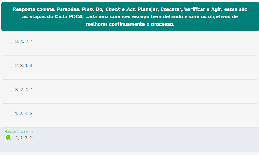 Gestão da Produção Atividade 3 – Unidade de Estudo 4 1 - O principal método para a implantação de melhorias nos processos é o famoso Ciclo PDCA, que foi idealizado por Shewhart, mas que ganhou popularidade a partir do trabalho de Deming. Esse método é aplicado na melhoria contínua e por isso é chamado de Ciclo, normalmente sendo representado por uma figura que “roda”, indicando que o final de um ciclo de melhoria é apenas o início de um novo ciclo. Sobre as etapas do PDCA, ordene as ações abaixo correspondentes a cada uma das 4 etapas do PDCA, numera-as sequencialmente de 1 (para a primeira etapa) a 4 (para última etapa). ( ) Corrigir os problemas encontrados após a implantação do plano de ação. ( ) Definir o problema a ser corrigido e o plano de ação para correção. ( ) Avaliar os resultados obtidos para saber se o problema foi corrigido. ( ) Aplicar o plano de ação. Agora, assinale a alternativa que apresenta a sequência correta: 2 - Ao longo dos anos a Toyota desenvolveu um trabalho com foco na redução do tempo das trocas de setup das máquinas, para poder produzir com lotes cada vez menores sem perder produtividade. O trabalho do engenheiro Shigeo Shingo contribuiu fortemente para a redução dos tempos de troca de setup, com a ideia de diferenciar setup interno de setup externo. Figura: destaque para os elementos utilizados para a troca de setup de uma furadeira, o mandril e as brocas. Fonte: Adao, Shutterstock, 2019. [1] Para realizar um furo em uma parede, para colocar uma bucha e um parafuso e pendurar um quadro, é necessário usar uma furadeira. Identifique, nas etapas abaixo, os setups internos, atribuindo a letra I; e os setups externos, atribuindo a letra E. Agora, selecione a alternativa com a sequência correta. ( ) Abrir o mandril para retirar a broca. ( ) Fechar o mandril para colocar prender a nova broca. ( ) Procurar a caixa com as brocas. ( ) Verificar o tamanho de broca necessário. ( ) Colocar a broca no mandril. ( ) Pegar o parafuso e a bucha na caixa de ferramentas. Agora, selecione a alternativa com a sequência correta. 3 - “o custo a ser reduzido é o de preparação das máquinas ou linhas de montagem, que chamamos de setup. Sempre que precisamos trocar a ferramenta que está́ na máquina ou preparar uma linha, temos que desenvolver uma série de atividades, algumas burocráticas, como liberar ordens, para que isso seja possível, em geral com a máquina, ou a linha, parada”. (TUBINO, D. F. Manufatura enxuta como estratégia de produção: a chave para a produtividade industrial. São Paulo: Atlas, 2015, p. 272). Agora, assinale a alternativa que apresenta a(s) afirmativa(s) correta(s). A troca rápida de ferramentas, ou de setup, é uma técnica essencial para o funcionamento do Just-In-Time. Sobre esse assunto, é correto afirmar que: I. no modelo de produção Fordista, o aumento na produtividade era alcançado com lotes maiores e menos trocas de setup; II. no SMED uma das etapas consiste em identificar o que pode ser feito fora da empresa por fornecedores terceirizados, o chamado setup externo; III. o objetivo do SMED é realizar a troca de ferramentas em um tempo que possa ser medido com apenas 1 dígito de minutos, ou seja, menos que 9 minutos e 59 segundos; IV. o foco do SMED é fazer a troca de ferramentas mais rapidamente, independente se isso causar mais desperdícios. 4 - “A maioria das pessoas não têm tempo para dedicar muito tempo cozinhando - possivelmente, o motivo pelo qual o chef celebridade Jamie Oliver escreveu o livro Refeições de 30 minutos do Jamie, cuja filosofia é que cozinhar um delicioso jantar deve ser tão rápido e mais barato do que comprar e aquecer uma comida pronta. O livro apresenta 50 menus prontos, com três a quatro pratos por menu, projetados para não demorar mais de 30 minutos no preparo. Para alcançar esse desempenho Jamie, talvez inadvertidamente, aplicou os princípios e métodos de produção enxuta à atividade cotidiana de cozinhar”. (SLACK, N.; BRANDON-JONES, A.; JOHNSTON, R. Administração da produção. São Paulo: Atlas, 2018, p. 560). Não é exagero afirmar que os princípios da produção enxuta podem ser aplicados para se cozinhar pratos em 30 minutos. É uma filosofia que pode contribuir para qualquer tipo de processo. A produção enxuta é baseada em dois pilares: Just-In-Time (JIT) e Autonomação. Sobre o JIT, avalie as alternativas e assinale a correta. 5 - “O fluxo de informações e de materiais para a produção é do tipo puxado, ou seja, só se produz ou se movimentam materiais quando houver efetivo consumo dos mesmos. O sistema kanban é o mais empregado para gerenciar essa lógica de funcionamento.” (TUBINO, D. F. Manufatura enxuta como estratégia de produção: a chave para a produtividade industrial. São Paulo: Atlas, 2015, p. 44). Assinale a alternativa que indique a sequência correta: Com relação ao Kanban, analise as afirmativas abaixo, atribuindo a letra V (para as verdadeiras) e a letra F (para as falsas). ( ) O Kanban é utilizado para fazer a comunicação entre as etapas produtivas, informando o que deve ser produzido. ( ) Cada cartão Kanban é associado a um lote de produção que pode representar uma ou mais caixas de itens. ( ) A inspiração para a criação do Kanban, para controlar a produção na Toyota, veio depois de uma visita a um supermercado. ( ) Os Kanbans facilitam a identificação visual quando alguma etapa do processo produtivo está atrasada. ( ) Quando há um lote com defeito, o Kanban funciona como uma autorização para que o lote seja processado pela etapa seguinte. 6 - “O ‘coração’ da filosofia enxuta é uma coleção de ferramentas e técnicas de melhoria que são os meios para cortar o desperdício. Há muitas técnicas que podem ser denominadas “técnicas enxutas” e, novamente, muitas delas seguem de forma natural e lógica a partir da filosofia enxuta em geral. O que é também importa