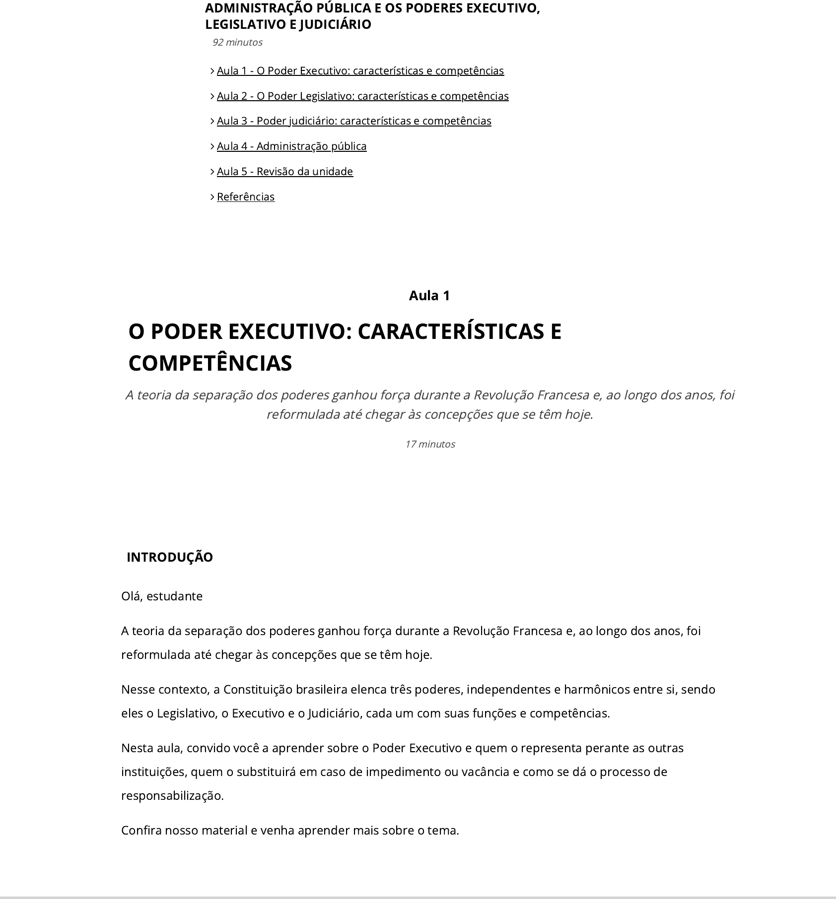 15/02/2024, 16:43 wlldd_232_u4_dir_pub https://www.colaboraread.com.br/integracaoAlgetec/index?usuarioEmail=cabogeber1%40gmail.com&usuarioNome=EDILSON+OLIVEIRA+GEBER&disciplinaDescricao=&atividadeId=3927308&atividadeDescricao… 1/27 INTRODUÇÃO Olá, estudante A teoria da separação dos poderes ganhou força durante a Revolução Francesa e, ao longo dos anos, foi reformulada até chegar às concepções que se têm hoje. Nesse contexto, a Constituição brasileira elenca três poderes, independentes e harmônicos entre si, sendo eles o Legislativo, o Executivo e o Judiciário, cada um com suas funções e competências. Nesta aula, convido você a aprender sobre o Poder Executivo e quem o representa perante as outras instituições, quem o substituirá em caso de impedimento ou vacância e como se dá o processo de responsabilização. Con�ra nosso material e venha aprender mais sobre o tema. Aula 1 O PODER EXECUTIVO: CARACTERÍSTICAS E COMPETÊNCIAS A teoria da separação dos poderes ganhou força durante a Revolução Francesa e, ao longo dos anos, foi reformulada até chegar às concepções que se têm hoje. 17 minutos ADMINISTRAÇÃO PÚBLICA E OS PODERES EXECUTIVO, LEGISLATIVO E JUDICIÁRIO Aula 1 - O Poder Executivo: características e competências Aula 2 - O Poder Legislativo: características e competências Aula 3 - Poder judiciário: características e competências Aula 4 - Administração pública Aula 5 - Revisão da unidade Referências 92 minutos 15/02/2024, 16:43 wlldd_232_u4_dir_pub https://www.colaboraread.com.br/integracaoAlgetec/index?usuarioEmail=cabogeber1%40gmail.com&usuarioNome=EDILSON+OLIVEIRA+GEBER&disciplinaDescricao=&atividadeId=3927308&atividadeDescricao… 2/27 AS FUNÇÕES DO EXECUTIVO Durante a queda do estado totalitário francês, a teoria da separação dos poderes, desenvolvida por Montesquieu, tinha por �nalidade a garantia da supremacia da lei por meio do exercício da função executiva e judicial. Naquela época, tinha concepção jurídica (TAVARES, 2023, p. 385). Contudo, ao longo dos anos, sobretudo no Brasil, ganhou força política, partindo da premissa de se tratar de funções estatais atreladas aos órgãos da soberania nacional, e que descrevem a estrutura política do Estado. Nesse passo, a Constituição brasileira, em seu art. 2º, consagra o princípio da separação do poder da seguinte forma: “São Poderes da União, independentes e harmônicos entre si, o Legislativo, o Executivo e o Judiciário”. Aqui, por enquanto, discorreremos sobre o Poder Executivo e, para nossos estudos, é importante relembrarmos que atualmente a forma de governo adotada pela República Federativa do Brasil é o Presidencialismo, que tem como principal característica a autonomia do Presidente da República perante o Congresso Nacional (TAVARES, 2023, p. 445). O Presidente da República, que é eleito pelo povo, por meio do Presidencialismo, também exerce o papel de Chefe de Estado e Chefe de Governo, sem, contudo, possuir participação no processo de aprovação das leis. Ao se falar em funções do Poder Executivo, é importante mencionar que, em âmbito federal, o art. 76 da CF/88 disciplina serem elas exercidas pelo Presidente da República, auxiliado pelos Ministros do Estado, e substituído pelo Vice-Presidente. Já em âmbito estadual e distrital, o Poder Executivo é exercido pelo Governador de Estado, auxiliado pelos Secretários de Estado, e substituído pelo Vice-Governador, e Municipal, pelo Prefeito, substituído pelo Vice-Prefeito. Assim, a função primordial do Poder Executivo, no plano interno, é garantir, por exemplo, que direitos sociais e fundamentais alcancem a todos os cidadãos. O art. 84 da CF/88 traz as atribuições privativas do Presidente da República, enumerando um rol meramente exempli�cativo. Por exemplo, tratam-se de competências privativas do Chefe do Poder Executivo nomear e exonerar os Ministros de Estado; exercer, com o auxílio dos Ministros de Estado, a direção superior da administração federal; sancionar, promulgar e fazer publicar as leis, bem como expedir decretos e regulamentos para sua �el execução; mediante decreto, dispor sobre organização e funcionamento da administração federal e extinção de funções ou cargos públicos, quando vagos; manter relações com Estados estrangeiros e acreditar seus representantes diplomáticos; celebrar tratados, convenções e atos internacionais, sujeitos a referendo do Congresso Nacional; decretar o estado de defesa, estado de sítio e a intervenção federal, dentre outras funções. Cumpre destacar aqui que o inciso VI do art. 84 da CF/88 traz as únicas possibilidades de expedição de decretos autônomos, sendo estes decretos que não regulamentam leis. Assim, pode o Presidente da República editar decretos que tratam da organização e funcionamento da administração pública federal, desde que não implique aumento de despesa nem criação ou extinção de órgãos públicos. Por �m, o parágrafo único do art. 84 da CF/88 dispõe ainda que algumas dessas atribuições podem ser delegadas aos Ministros de Estado, ao Procurador-Geral da República ou ao Advogado-Geral da União, nos limites previstos pela própria Constituição. 15/02/2024, 16:43 wlldd_232_u4_dir_pub https://www.colaboraread.com.br/integracaoAlgetec/index?usuarioEmail=cabogeber1%40gmail.com&usuarioNome=EDILSON+OLIVEIRA+GEBER&disciplinaDescricao=&atividadeId=3927308&atividadeDescricao… 3/27 IMPEDIMENTO E VACÂNCIA Agora que você já aprendeu sobre as funções do Poder Executivo, iremos estudar sobre os impedimentos e vacância do cargo de Presidente da República. Antes, porém, é importante que você saiba quais são as condições para a elegibilidade de�nidas pela Constituição brasileira para os cargos de Presidente e Vice-Presidente da República. São elas: • Ser brasileiro nato (art. 12, § 3º, I). • Estar no pleno exercício dos direitos políticos 