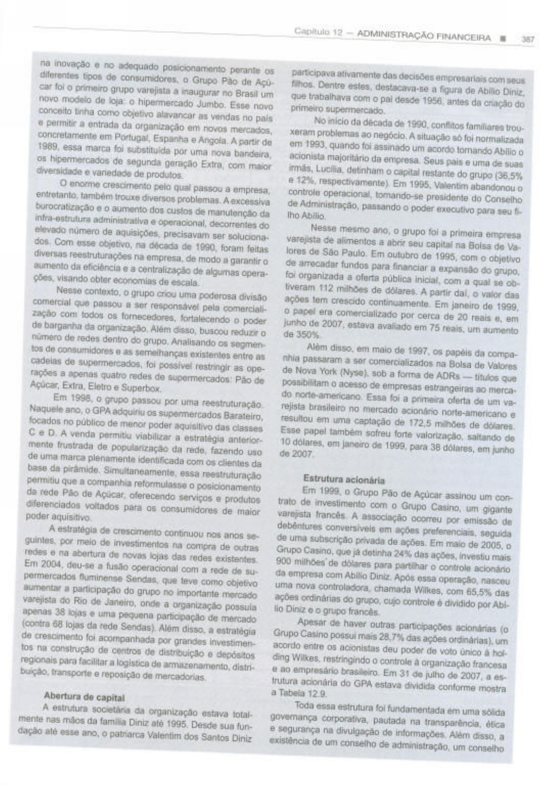 Capitulo 12 ADMINISTRAÇÃO FINANCEIRA 387 na inovação no adequado posicionamento perante os diferentes tipos de o Grupo Pão de participava ativamente das decisões com seus car foi o primeiro grupo a inaugurar no Brasil um Dentre destacava-se a figura de Abilio novo modelo de o hipermercado Esse novo que trabalhava com o pai desde antes da criação do primeiro supermercado. conceito tinha como objetivo alavancar vendas no permitir a entrada da organização em novos mercados, No da década de 1990, conflitos familiares trou- concretamente em Portugal, Espanha e A partir de xeram problemas A situação só foi normalizada essa marca foi substituida por uma nova bandeira, em quando assinado um acordo Abilio o hipermercados de segunda geração Extra, com maior acionista majoritário de Seus e uma de suas diversidade e variedade de detinham capital restante do grupo (36,5% o enorme crescimento pelo qual passou a e respectivamente) Em Valentim abandonou também trouxe diversos A excessiva controle operacional, presidente do Conselho burocratização o aumento dos custos de da de Administração, passando o poder executivo para seu fi- lho administrativa e operacional, decorrentes do elevado número de precisavam ser soluciona- Nesse mesmo o grupo foi a primeira empresa Com usse na década de foram varejista de alimentos a abrir seu capital na Bolsa de Va- diversas reestruturações na empresa, de modo a garantir o lores de São Em outubro de 1995, com o objetivo aumento eficiência e a centralização de algumas opera- de arrecadar fundos para financiar expansão do grupo, visando obter economias de foi organizada a oferta pública com a qual se ob- Nesse contexto, o grupo criou uma poderosa divisão liveram 112 milhões de A partir dal, valor das comercial que passou ser responsável pela comerciali- ações crescido Em janeiro de zação com todos os fortalecendo o poder o papel era comercializado por cerca de 20 em de barganha da Além disso, buscou reduzir o junho de estava avaliado em 75 reais. um aumento de 350% número de redes dentro do Analisando os segmen- de consumidores e as semelhanças existentes as em maio de os papéis da compa- de foi possível restringir as ope- nhia passaram a ser comercializados na Bolsa de Valores rações apenas quatro redes de Pão de de Nova York sob a forma de ADRs que Extra, Eletro e possibilitam o acesso de empresas estrangeiras ao merca- Em grupo passou por uma do Essa foi a primeira oferta de um va- Naquele ano, o GPA adquiriu os supermercados rejista brasileiro no mercado acionário focados no público de menor poder aquisitivo das classes resultou em uma captação de 172,5 de e A venda viabilizar a anterior- Esse papel também sofreu forte saltando de mente frustrada de popularização da rede, fazendo uso 10 dólares, em janeiro de para 38 em junho de de uma marca plenamente identificada com os clientes da base da Simultaneamente essa reestruturação Estrutura acionária permitiu que companhia reformulasse o posicionamento da rede Pão de oferecendo serviços e produtos Em o Grupo Pão de Açúcar assinou um con- diferenciados voltados para os consumidores de maior trato de investimento com o Grupo Casino, um gigante poder aquisitivo. A associação por emissão de A estratégia de crescimento continuou nos anos se- debêntures em ações seguida por meio de investimentos na compra de outres de uma subscrição privada de Em maio de o redes na abertura de novas lojas das redes Grupo Casino, que já detinha 24% das investiu mais Em deu-se a fusão operacional com a rede de 900 milhões de para partilhar o controle acionário permercados Sendas, que como objetivo da empresa com Abilio Após essa nasceu aumentar a participação do grupo no importante mercado uma nova chamada Wilkes, com 65,5% das varejista do Rio de onde a organização possula ações ordinárias do grupo, cujo controle dividido por lio Diniz grupo apenas 38 lojas e uma pequena participação de mercado (contra 68 lojas da rede Sendas). Além a estratégia Apesar de haver outras participações acionárias (o de crescimento acompanhada por grandes Grupo Casino possui mais 28,7% das ações um tos na construção de centros de distribuição e depósitos acordo entre os acionistas deu poder de voto único à hol- regionais para facilitar a de distri- ding restringindo o controle à organização francesa transporte e reposição de e empresário brasileiro. Em 31 de julho de a trutura acionária do GPA estava dividida conforme mostra a Tabela Abertura de capital A estrutura societária da organização estava total- Toda essa estrutura foi fundamentada em uma sólida mente nas mãos da Diniz até Desde sua fun- governança corporativa, pautada na dação até esse o patriarca Valentim dos Santos Diniz e segurança na divulgação de Além disso, a existência de um conselho de um conselho388 TEORIA E NO CONTEXTO BRASILEIRO Tabela Estrutura acionária do Grupo Pão de (em bilhões de ações) ACIONISTAS ORDINÁRIAS TOTAL WILKES 32,7 65,6% 0,0 0,0% 32,7 28,7% CASINO 28,7% 3,0% 14,2% DINIZ 2,8% 16,0 25,0% 18,8 16,5% FAMILIA DINIZ 9,6 15,0% 9,6 8,4% 0,0 0,1% 36,5 57,1% 32,1% TOTAL 49,8 100% 100% 113,9 100% Site oficial da empresa Acesso 2007. fiscal, um conselho consultivo e de diversos comités de de recorrer a fontes de financiamento gestão, auditoria, marketing institucional, responsabilidade No entanto, seu endividamento precisava ser mantido em ambiental, entre outros, garantem a adequação das práti- para não desequilibrar financeiramente a cas operacionais e a claridade da relação da empresa com seus Por essas razões, o GPA participa, desde Uma das principais para garantir os recursos 2003, do de Ações com Governança Diferenciada da necessários ao seu crescimento foi a emissão de ações nos mercados nacional e internacional, como Nesse contexto, destacaram-se duas fases de captação de Politica de investimentos recursos: a abertura inicial de capital no B