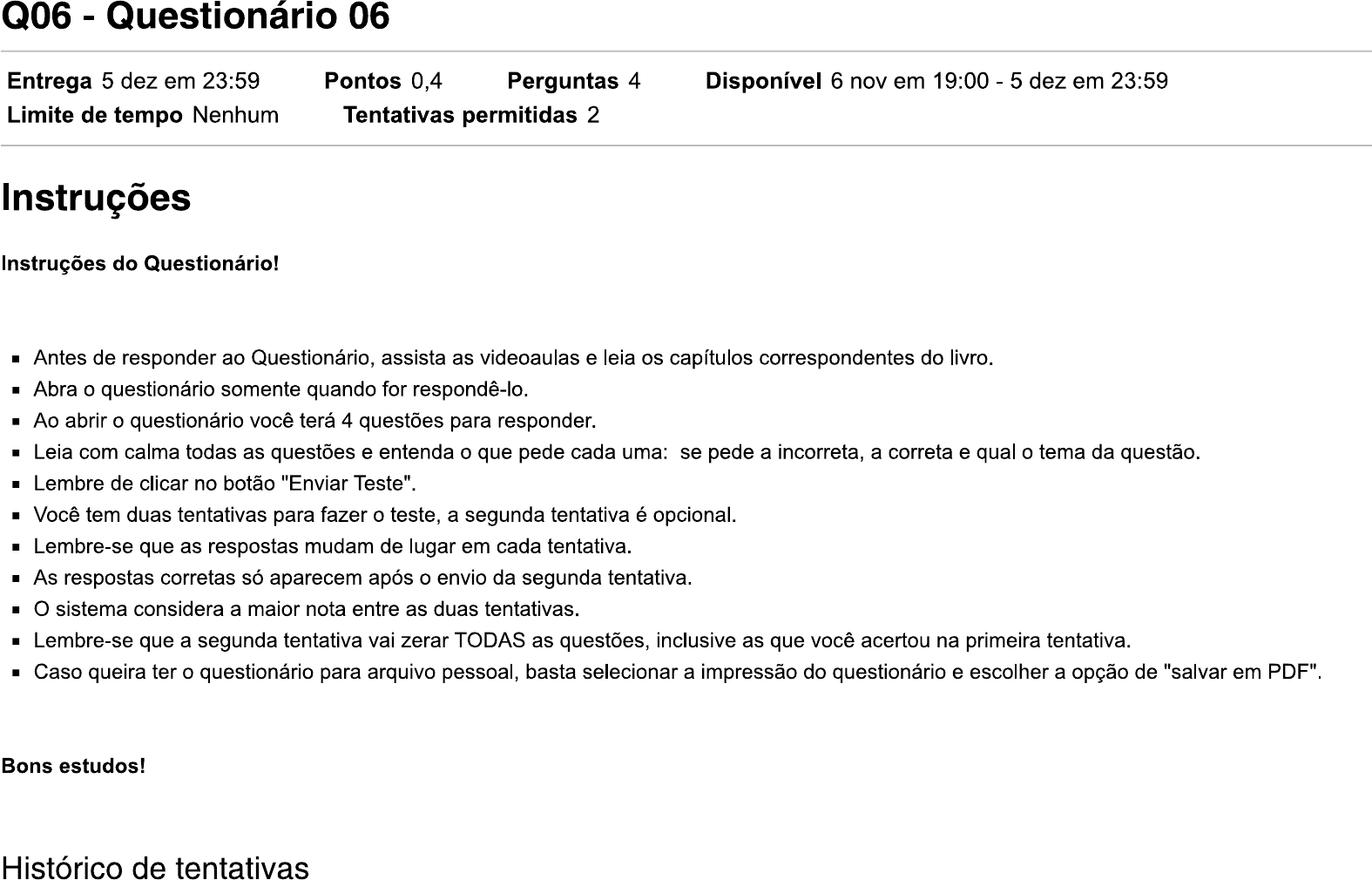 Q06 - Questionário 06 Entrega 5 dez em 23:59 Pontos 0,4 Perguntas 4 Disponível 6 nov em 19:00 - 5 dez em 23:59 Limite de tempo Nenhum Tentativas permitidas 2 Instruções Instruções do Questionário! Antes de responder ao Questionário, assista as videoaulas e leia os capítulos correspondentes do livro. Abra o questionário somente quando for respondê-lo. Ao abrir o questionário você terá 4 questões para responder. Leia com calma todas as questões e entenda o que pede cada uma: se pede a incorreta, a correta e qual o tema da questão. Lembre de clicar no botão "Enviar Teste". Você tem duas tentativas para fazer o teste, a segunda tentativa é opcional. Lembre-se que as respostas mudam de lugar em cada tentativa. As respostas corretas só aparecem após o envio da segunda tentativa. O sistema considera a maior nota entre as duas tentativas. Lembre-se que a segunda tentativa vai zerar TODAS as questões, inclusive as que você acertou na primeira tentativa. Caso queira ter o questionário para arquivo pessoal, basta selecionar a impressão do questionário e escolher a opção de "salvar em Bons estudos! Histórico de tentativasTentativa Tempo Pontuação MANTIDO Tentativa 2 4 minutos 0,3 de 0,4 MAIS RECENTE Tentativa 2 4 minutos 0,3 de 0,4 Tentativa 1 395 minutos 0,3 de 0,4 Pontuação desta tentativa: 0,3 de 0,4 Enviado 4 dez em 11:47 Esta tentativa levou 4 minutos. Pergunta 1 0,1 / 0,1 pts Identifique na ordem quais os processos de calor envolvidos nas situações apresentadas a seguir. I. O planeta mercúrio não tem atmosfera e tem altas e baixas temperaturas porque não há II. A luz solar chega até o nosso planeta por meio da III. Uma garrafa térmica mantém vácuo entre duas paredes de vidro para que não haja troca de calor por condução, convecção e radiação condução, radiação e convecção Correto! convecção, radiação e conduçãoradiação, convecção e condução convecção, condução e radiação Pergunta 2 0,1 0,1 pts Um corpo negro em uma situação inicial, emite uma certa quantidade de radiação. Se sua temperatura triplica, quantas vezes mais radiação é emitida depois em relação à situação inicial? 18 vezes 3 vezes 27 vezes 9 vezes Correto! 81 vezes Pergunta 3 0/0,1 ptsA respeito das leis da termodinâmica, analise as afirmações a seguir: I. A lei zero da termodinâmica trata do equilíbrio térmico, recebeu esse nome, mesmo que tenha sido enunciado posteriormente às demais leis, por abordar um conceito tão fundamental. II. A primeira lei relaciona a energia interna de um sistema, o calor e o trabalho. III. A segunda lei possui diversos enunciados, que se referem à entropia e ao rendimento de máquinas térmicas. IV. Não há terceira lei da Termodinâmica. São verdadeiras as alternativas: Apenas a alternativa I. Resposta correta Alternativas, I, Il e III. Alternativas e III Alternativas II, III e IV. Você respondeu Alternativas e II. Pergunta 4 0,1/0,1 pts Sobre os conceitos de sistema, equilíbrio, propriedade, estado e processo, é verdadeira a alternativa:Correto! Um processo termodinâmico é uma mudança de estado termodinâmico que ocorre quando uma propriedade do sistema sofre uma alteração Calor e trabalho são propriedades dos corpos. Na termodinâmica, equilíbrio implica apenas em uma condição de estabilidade mantida por uma igualdade de forças que se Sistemas isolados e fechados são sinônimos. O estado termodinâmico de um sistema não pode ser determinado por suas propriedades Pontuação do teste: 0,3 de 0,4