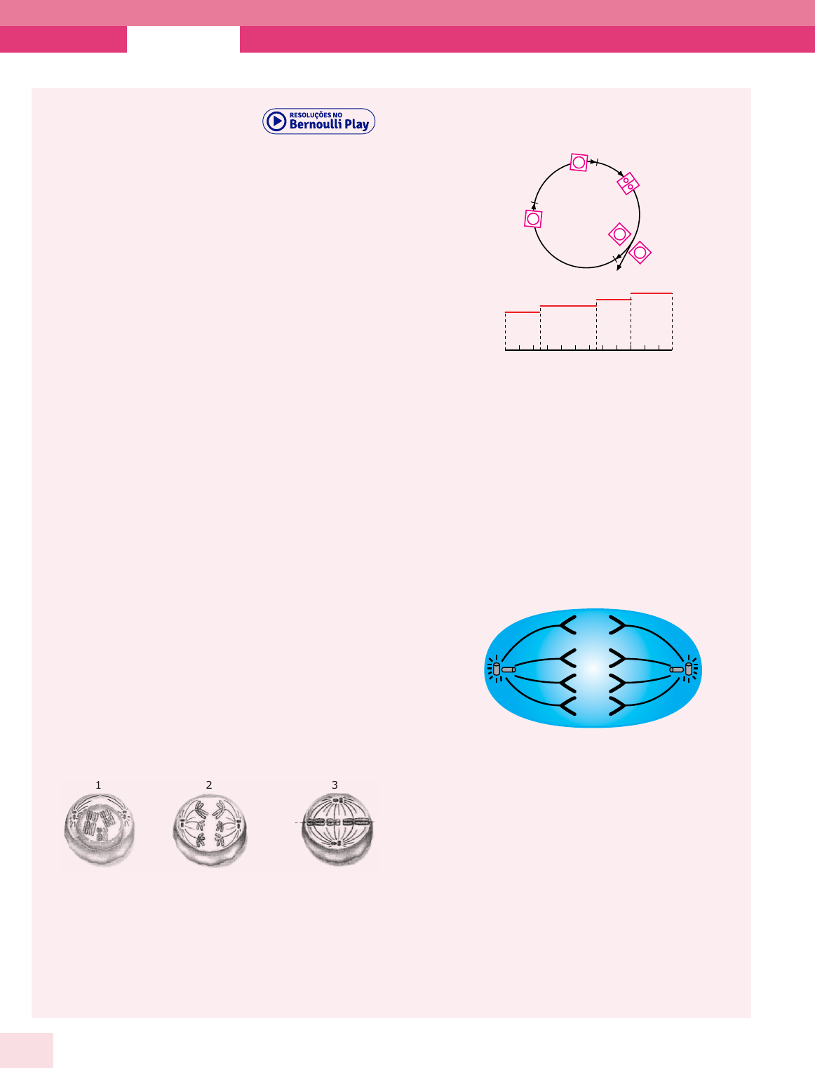 Frente A Módulo 11 32 Coleção 6V EXERCÍCIOS DE APRENDIZAGEM 01. (PUC-SP) Analise os seguintes enunciados: I. A mitose é um processo de divisão celular no qual a célula se divide produzindo duas células-filhas iguais. II. A duplicação do DNA, nas células que irão sofrer mitose, ocorre na intérfase. III. Locus gênico é o local ocupado por um gene no cromossomo. Agora, assinale a alternativa correta. A) Apenas a afirmação I está errada. B) Todas as afirmações estão erradas. C) Todas as afirmações estão corretas. D) Apenas uma afirmação está correta. E) Apenas uma afirmação está errada. 02. (FUVEST-SP) Considere os eventos a seguir, que podem ocorrer na mitose ou na meiose. I. Emparelhamento dos cromossomos homólogos duplicados. II. Alinhamento dos cromossomos no plano equatorial da célula. III. Permutação de segmentos entre cromossomos homólogos. IV. Divisão dos centrômeros resultando na separação das cromátides-irmãs. No processo de multiplicação celular para a reparação de tecidos, os eventos relacionados à distribuição equitativa do material genético entre as células resultantes estão indicados em A) I e III, apenas. B) II e IV, apenas. C) II e III, apenas. D) I e IV, apenas. E) I, II, III e IV. 03. (UFRGS–RS–2016) Os diagramas a seguir se referem a células em diferentes fases da meiose de um determinado animal. 1 2 3 Os diagramas 1, 2 e 3 correspondem, respectivamente, a A) prófase I, metáfase I e telófase II. B) prófase II, anáfase I e telófase I. C) prófase I, metáfase II e anáfase II. D) prófase II, anáfase II e telófase I. E) prófase I, anáfase I e metáfase II. 8WS5 04. (Unirio-RJ) A figura representa o ciclo celular e um diagrama da duração das diferentes etapas desse ciclo em determinadas células. G2 G2 G1 G1 M Mitose C B D S S A Tempo (horas) 0 1 2 3 4 5 6 7 8 9 1011 12 Quanto tempo é necessário para que essas células dupliquem o seu DNA? A) 2 horas e 30 minutos B) 3 horas C) 4 horas D) 6 horas e 30 minutos E) 9 horas 05. (FGV-SP) Observe a figura que ilustra uma célula em determinada etapa de um processo de divisão celular. Sendo 2n o número diploide de cromossomos, é correto afirmar que tal célula encontra-se em anáfase da mitose de uma célula-mãe A) 2n = 8, ou anáfase I da meiose de uma célula-mãe 2n = 8. B) 2n = 16, ou anáfase II da meiose de uma célula-mãe 2n = 8. C) 2n = 4, ou anáfase I da meiose de uma célula-mãe 2n = 8. D) 2n = 8, ou anáfase II da meiose de uma célula-mãe 2n = 16. E) 2n = 4, ou anáfase II da meiose de uma célula-mãe 2n = 8. GSMA Mitose e Meiose B IO LO G IA 33Bernoulli Sistema de Ensino EXERCÍCIOS PROPOSTOS 01. (UCB-DF–2016) Considerando que a maneira como uma célula se divide depende da complexidade do organismo e do seu tipo de célula, a respeito da divisão celular, assinale a alternativa correta. A) Os procariontes, organismos unicelulares, realizam a reprodução assexuada. B) Nas células eucarióticas, há apenas a divisão celular conhecida por meiose. C) A mitose tem como resultado quatro células haploides. D) A bipartição não constitui forma de reprodução assexuada. E) Como resultado da meiose, tem-se o crescimento do organismo. 02. (PUC-SP–2016) Nos esquemas a seguir temos a representação de um cromossomo em duas fases sequenciais (A e B) da divisão celular: A B As fases A e B em questão são observadas A) exclusivamente na mitose. B) exclusivamente na meiose. C) na mitose e na primeira divisão da meiose. D) na mitose e na segunda divisão da meiose. 03. (Uncisal) Alterações no número padrão de cromossomos podem resultar em problemas para o desenvolvimento do indivíduo. As síndromes de Down e de Klinefelter, causadas pela presença de um cromossomo a mais nos genomas celulares, e as síndromes de Turner e de Cri du Chat, relacionadas à falta de um cromossomo, são exemplos desses processos. Nesses casos, os indivíduos afetados apresentam uma série de alterações anatômicas, morfológicas e fisiológicas em seus organismos e têm o seu desenvolvimento e expectativa de vida afetados. As alterações nos números de cromossomos podem acontecer em função de A) erros nos processos de divisão celular dos gametas. B) produção e fecundação de dois óvulos por dois espermatozoides. C) fecundação do óvulo por mais de um espermatozoide. D) formação da mórula. E) erros nos processos de crossing-over. 04. (UNIFESP) Durante a prófase I da meiose, pode ocorrer o crossing-over ou permuta gênica entre os cromossomos das células reprodutivas. A) Explique o que é crossing-over e sua importância para as espécies. B) Considerando que a maioria das células de um organismo realiza divisão celular mitótica para se multiplicar, justifique o fato de as células reprodutivas realizarem meiose. 05. (PUC-SP) A desespiralização dos cromossomos, o desaparecimento do fuso, o reaparecimento do nucléolo e a citocinese são fenômenos que caracterizam uma das fases da mitose. Trata-se da A) anáfase. B) telófase. C) metáfase. D) prófase. E) intérfase. 06. (PUC Minas) É incorreto afirmar sobre a meiose: A) Na divisão equacional, ocorre separação de cromátides. B) Na divisão reducional, ocorre separação dos cromossomos homólogos. C) No final da 1ª divisão, formam-se duas células diploides. D) No final do processo, são formadas quatro células haploides. E) No processo, pode haver crossing-over. 07. (UFMG) AA' BB' 2 1 3 54 6 7 O esquema mostra uma meiose normal, em que a célula inicial apresenta dois pares de cromossomos homólogos: A e A’, B e B’. Qual a alternativa errada? A) 6 e 7 terão o mesmo número de cromossomos que 3. B) 5 possuirá a metade do número de cromossomos de 1. C) Se 4 possuir o cromossomo A, 5 não poderá ter o cromossomo A’. D) 4 poderá ter qualquer uma das combinações cromossômicas seguintes: AB, A’B, AB’ e A’B’. E) 2 poderá conter os cromossomos A e A’ e 3, os cromo