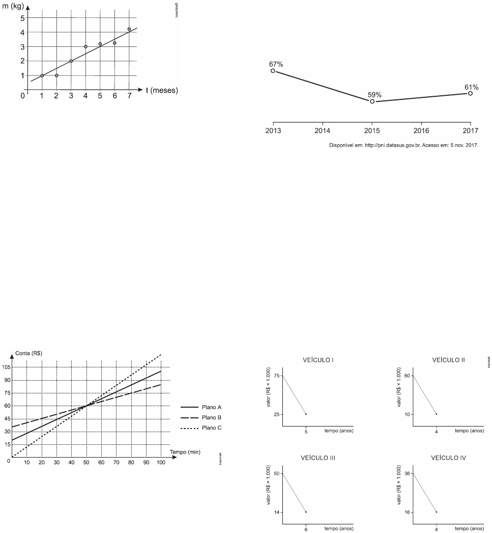 Alisson Marques-online 1 1. (Famerp 2018) Um animal, submetido à ação de uma droga experimental, teve sua massa corporal registrada nos sete primeiros meses de vida. Os sete pontos destacados no gráfico mostram esses registros e a reta indica a tendência de evolução da massa corporal em animais que não tenham sido submetidos à ação da droga experimental. Sabe-se que houve correlação perfeita entre os registros coletados no experimento e a reta apenas no 1º e no 3º mês. Se a massa registrada no 6º mês do experimento foi 210 gramas inferior à tendência de evolução da massa em animais não submetidos à droga experimental, o valor dessa massa registrada é igual a a) 3,47 kg. b) 3,27 kg. c) 3,31kg. d) 3,35 kg. e) 3,29 kg. 2. (Enem PPL 2018) Na intenção de ampliar suas fatias de mercado, as operadoras de telefonia apresentam diferentes planos e promoções. Uma operadora oferece três diferentes planos baseados na quantidade de minutos utilizados mensalmente, apresentados no gráfico. Um casal foi à loja dessa operadora para comprar dois celulares, um para a esposa e outro para o marido. Ela utiliza o telefone, em média, 30 minutos por mês, enquanto ele, em média, utiliza 90 minutos por mês. Com base nas informações do gráfico, qual é o plano de menor custo mensal para cada um deles? a) O plano A para ambos. b) O plano B para ambos. c) O plano C para ambos. d) O plano B para a esposa e o plano C para o marido. e) O plano C para a esposa e o plano B para o marido. 3. (Enem 2018) A raiva é uma doença viral e infecciosa, transmitida por mamíferos. A campanha nacional de vacinação antirrábica tem o objetivo de controlar a circulação do vírus da raiva canina e felina, prevenindo a raiva humana. O gráfico mostra a cobertura (porcentagem de vacinados) da campanha, em cães, nos anos de 2013, 2015 e 2017, no município de Belo Horizonte, em Minas Gerais. Os valores das coberturas dos anos de 2014 e 2016 não estão informados no gráfico e deseja-se estimá-Ios. Para tal, levou-se em consideração que a variação na cobertura de vacinação da campanha antirrábica, nos períodos de 2013 a 2015 e de 2015 a 2017, deu-se de forma linear. Qual teria sido a cobertura dessa campanha no ano de 2014? a) 62,3% b) 63,0% c) 63,5% d) 64,0% e) 65,5% 4. (Uerj 2018) Os veículos para transporte de passageiros em determinado município têm vida útil que varia entre 4 e 6 anos, dependendo do tipo de veículo. Nos gráficos está representada a desvalorização de quatro desses veículos ao longo dos anos, a partir de sua compra na fábrica. Com base nos gráficos, o veículo que mais desvalorizou por ano foi: a) I b) II c) III d) IV Alisson Marques-online 2 5. (Enem PPL 2018) A quantidade x de peças, em milhar, produzidas e o faturamento y, em milhar de real, de uma empresa estão representados nos gráficos, ambos em função do número t de horas trabalhadas por seus funcionários. O número de peças que devem ser produzidas para se obter um faturamento de R$ 10.000,00 é a) 2.000. b) 2.500. c) 40.000. d) 50.000. e) 200.000. TEXTO PARA AS PRÓXIMAS 2 QUESTÕES: Leia o texto e o gráfico para responder à(s) questão(ões) a seguir. Lançada em 2009, a bitcoin ganha espaço no mercado internacional como um meio de troca atrativo por permitir transações a taxas baixas sem recorrer a intermediários, como bancos ou empresas como o PayPal. Diferentemente de moedas tradicionais, ela não é gerida por um banco central, mas por uma comunidade dispersa na internet. Dado: Considere linear o comportamento do total de bitcoins em circulação ao longo do período indicado no gráfico. 6. (Insper 2018) Seja t a taxa diária de crescimento do total de bitcoins no período analisado. No último dia do mês de julho de 2017, o total de bitcoins em circulação, em milhares, era igual a a) 16.488,7 4t b) 316.488,7 3 10 t c) 16.488,7 3t d) 316.488,7 3 10 t e) 3(16.488,7 3t)10 7. (Insper 2018) No período analisado, a taxa diária de crescimento do total de bitcoins foi de, aproximadamente, a) 2.121,6. b) 1.614,3. c) 2.475,2. d) 1.883,3. e) 1.255,6. 8. (Enem PPL 2017) Um sistema de depreciação linear, estabelecendo que após 10 anos o valor monetário de um bem será zero, é usado nas declarações de imposto de renda de alguns países. O gráfico ilustra essa situação. Uma pessoa adquiriu dois bens, A e B, pagando 1.200 e 900 dólares, respectivamente. Considerando as informações dadas, após 8 anos, qual será a diferença entre os valores monetários, em dólar, desses bens? a) 30 b) 60 c) 75 d) 240 e) 300 Alisson Marques-online 3 9. (Espm 2017) O gráfico abaixo mostra a variação da temperatura no interior de uma câmara frigo- rífica desde o instante em que foi ligada. Considere que essa variação seja linear nas primeiras 2 horas. O tempo necessário para que a temperatura atinja 18 C é de: a) 90 min b) 84 min c) 78 min d) 88 min e) 92 min 10. (G1 - epcar (Cpcar) 2017) João, ao perceber que seu carro apresentara um defeito, optou por alugar um veículo para cumprir seus compromissos de trabalho. A locadora, então, lhe apresentou duas propostas: - plano A, no qual é cobrado um valor fixo de R$ 50,00 e mais R$ 1,60 por quilômetro rodado. - plano B, no qual é cobrado um valor fixo de R$ 64,00 mais R$ 1,20 por quilômetro rodado. João observou que, para certo deslocamento que totalizava k quilômetros, era indiferente optar pelo plano A ou pelo plano B, pois o valor final a ser pago seria o mesmo. É correto afirmar que k é um número racional entre a) 14,5 e 20 b) 20 e 25,5 c) 25,5 e 31 d) 31 e 36,5 11. (Ufpr 2017) O gráfico abaixo representa o consumo de bateria de um celular entre as 10 h e as 16 h de um determinado dia. Supondo que o consumo manteve o mesmo padrão até a bateria se esgotar, a que horas o nível da bateria atingiu 10%? a) 18 h. b) 19 h. c) 20 h. d) 21h. e) 22 h. 12. (Unisinos 2017) João e Pedro alugaram o mesmo modelo de carro, por um d